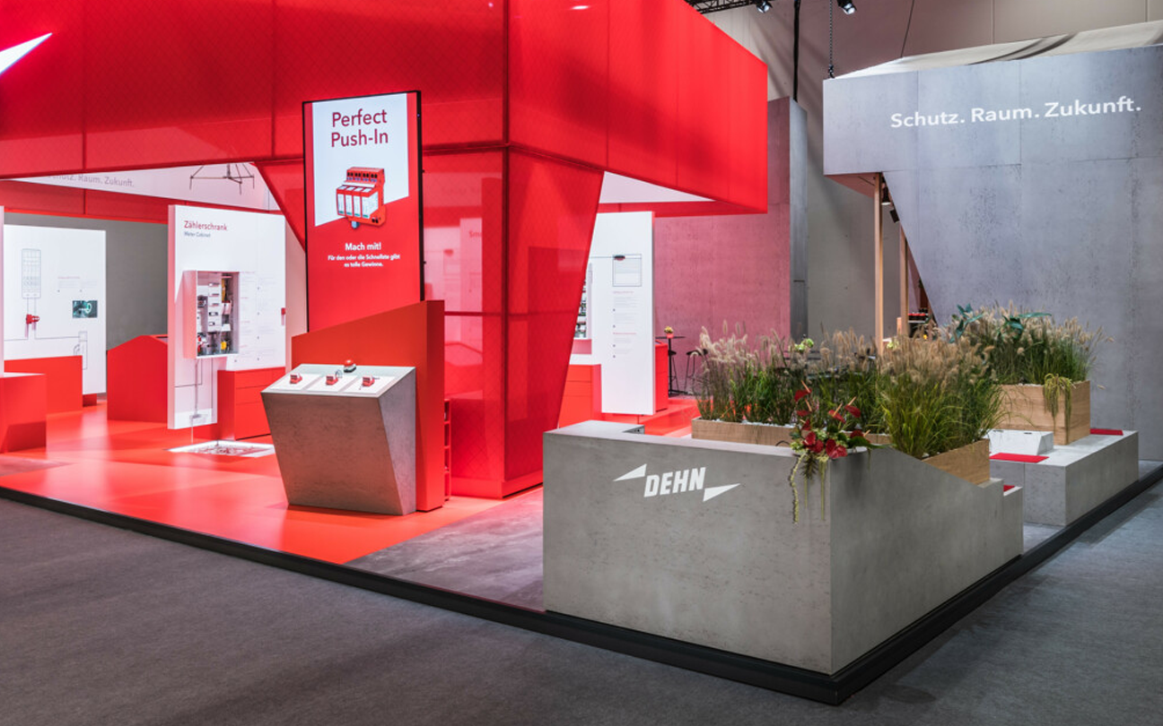 Bei der Grundstruktur und den einzelnen Elementen des Markenauftritts von DEHN für die Weltleitmesse für Licht und Gebäudetechnik Light + Building 2022 wurde auf einen für verschiedene Kontexte wiederverwendbaren Aufbau gesetzt. Hierbei wurde der Messestand für Hausmessen oder Roadshows zur Wiederverwendung auf neue Gegebenheiten wie kompakte Standgrößen angepasst.