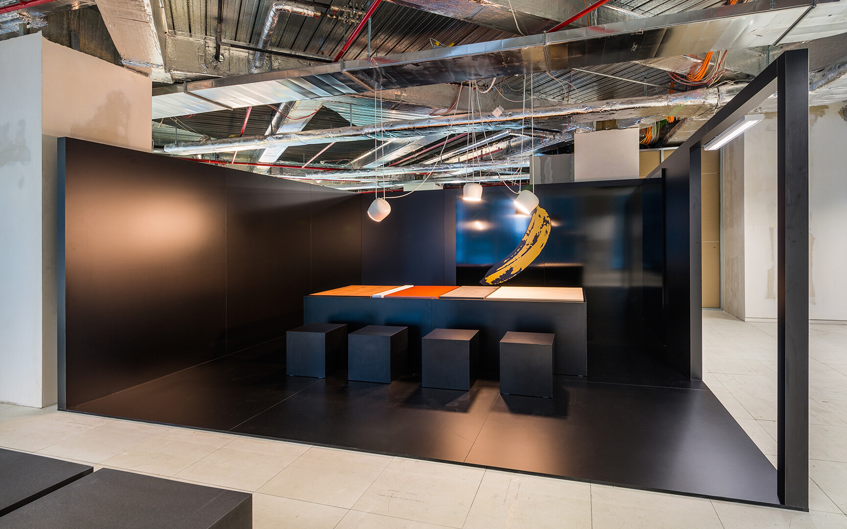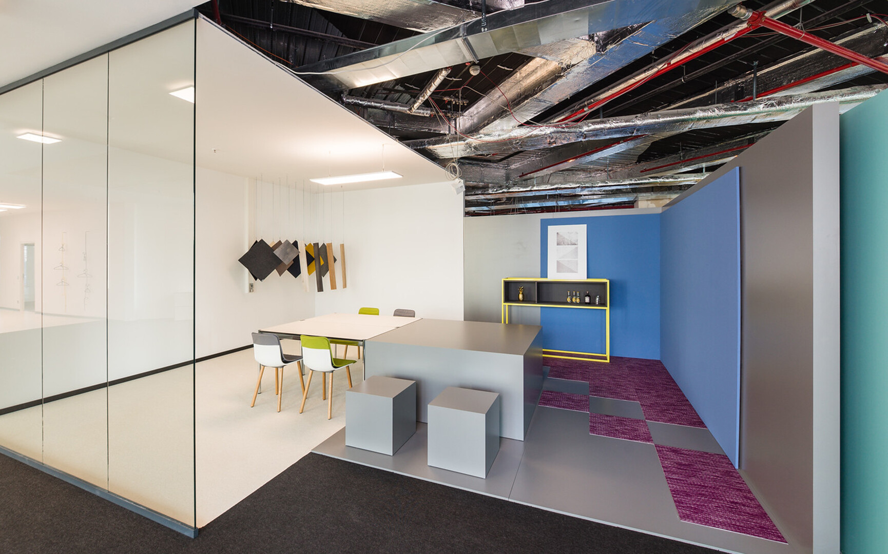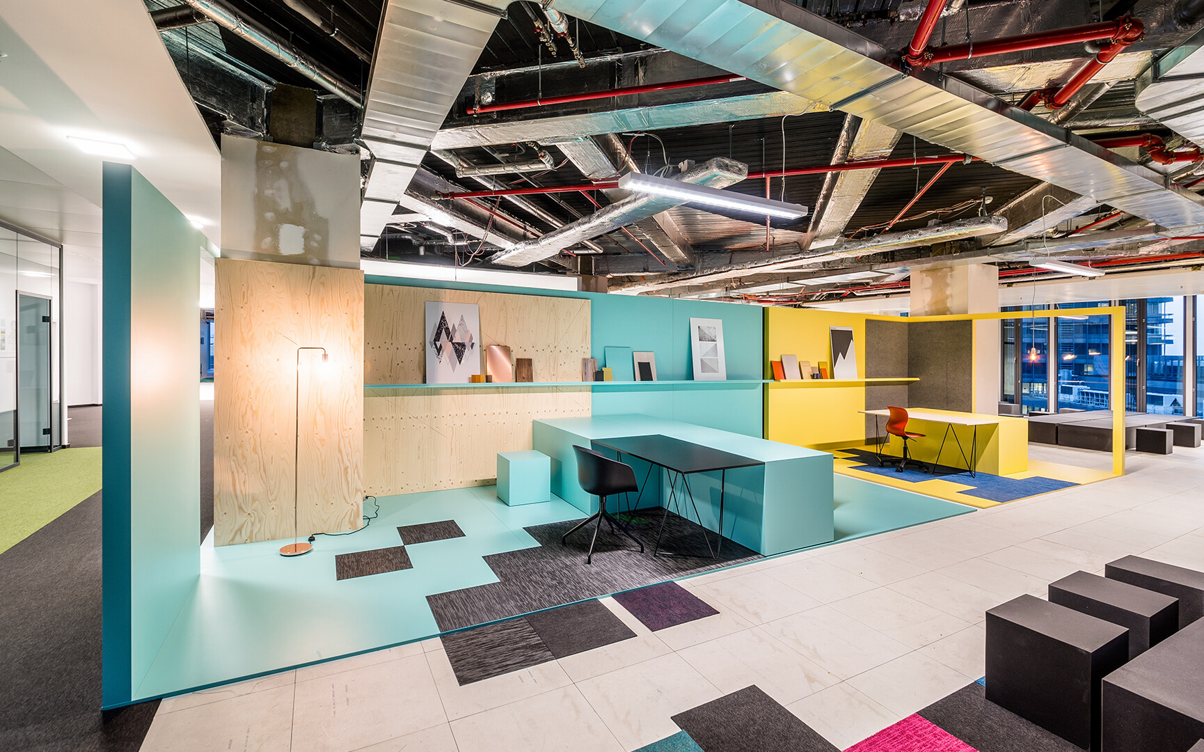 Durch gezielten Farbeinsatz, flexible Einrichtungsmodule und eine Vielfalt an Materialproben vermittelt die Variante im Pop-up Stil den Besuchern, wie unterschiedlich der vorhandene Raum genutzt werden kann. Grafische Elemente und Tape Art rund um das Thema „Urban Jungle“ schaffen einen spielerischeren Übergang zwischen den sehr verschiedenen Bürogestaltungen.