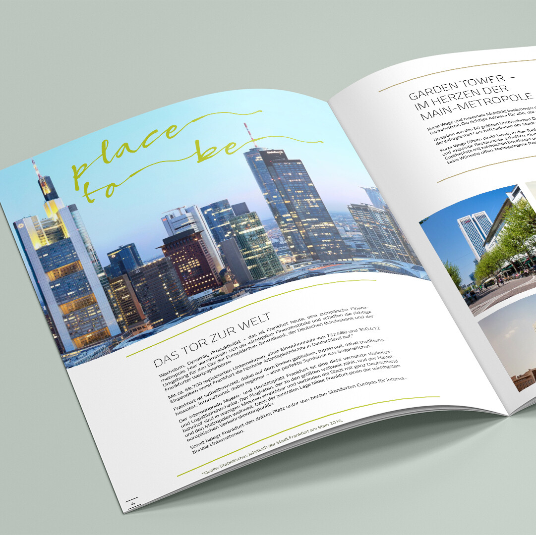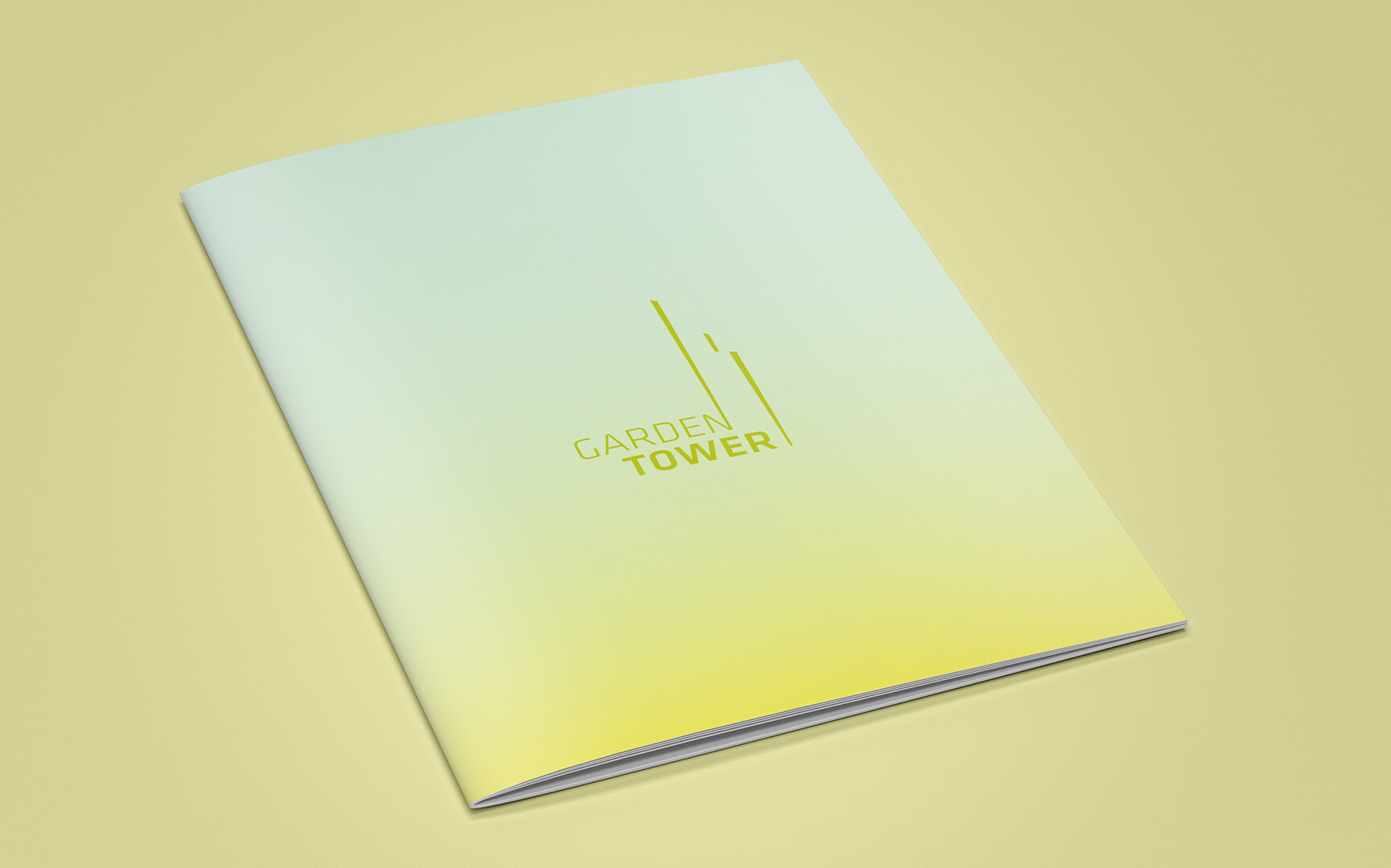 Das ist der Garden Tower seit seiner Revitalisierung. Eben diese Attribute beschreiben auch die visuelle Kommunikation zur Vermarktung der Büroflächen. Wir schufen hierbei ein Gestaltungskonzept, das die vorhandene CI der Immobilie adaptiert und strategisch neu zusammensetzt – sowohl analog als auch digital. Ergänzend zu der inhaltlichen und gestalterischen Konzeption und Realisierung der Informationsmedien, Exposé und Website, zeigten wir uns für das Branding sämtlicher Giveaways verantwortlich.