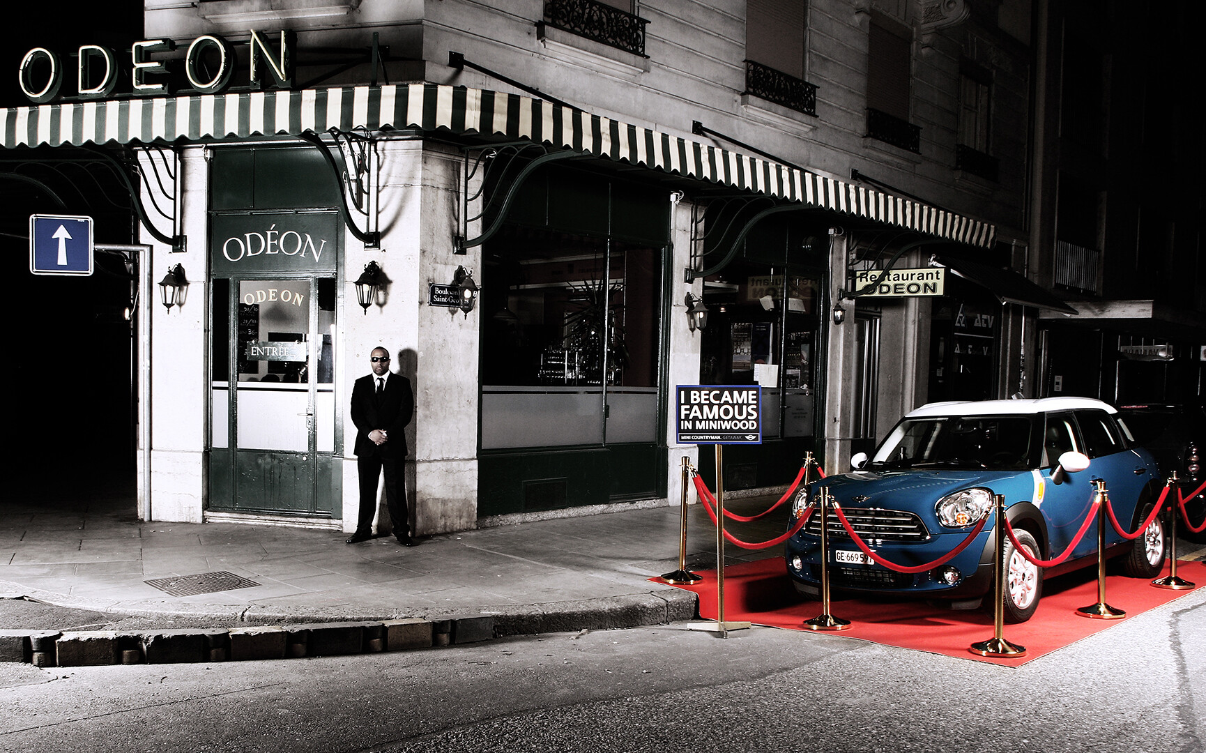 Das Gerücht, dass Guerilla-Marketing illegal ist, widerlegten wir mit der Weltpremiere des neuen „MINI Countryman“ in Genf: Mit einer überdimensionalen Projektion des Schriftzuges „MINIWOOD“ auf der Bergkette des Mont Salève, den berühmten Sternen des „Walk of Fame“ auf dem Asphalt der Uno-Metropole, Postkarten mit dem MINIWOOD-Motiv und Stickern mit dem Slogan „I became famous in MINIWOOD“, brachte MINI filmreifes Hollywood-Feeling nach Genf. Rund um den Flughafen kündigten wild angebrachte Premierenplakate den Film „Getaway“ an, analog den neuen Claim: „MINI Countryman“. Dieser Film und die begleitende Aktion „Red Carpet Parking“ boten dem Newcomer aus MINIWOOD einen exponierten Auftritt.