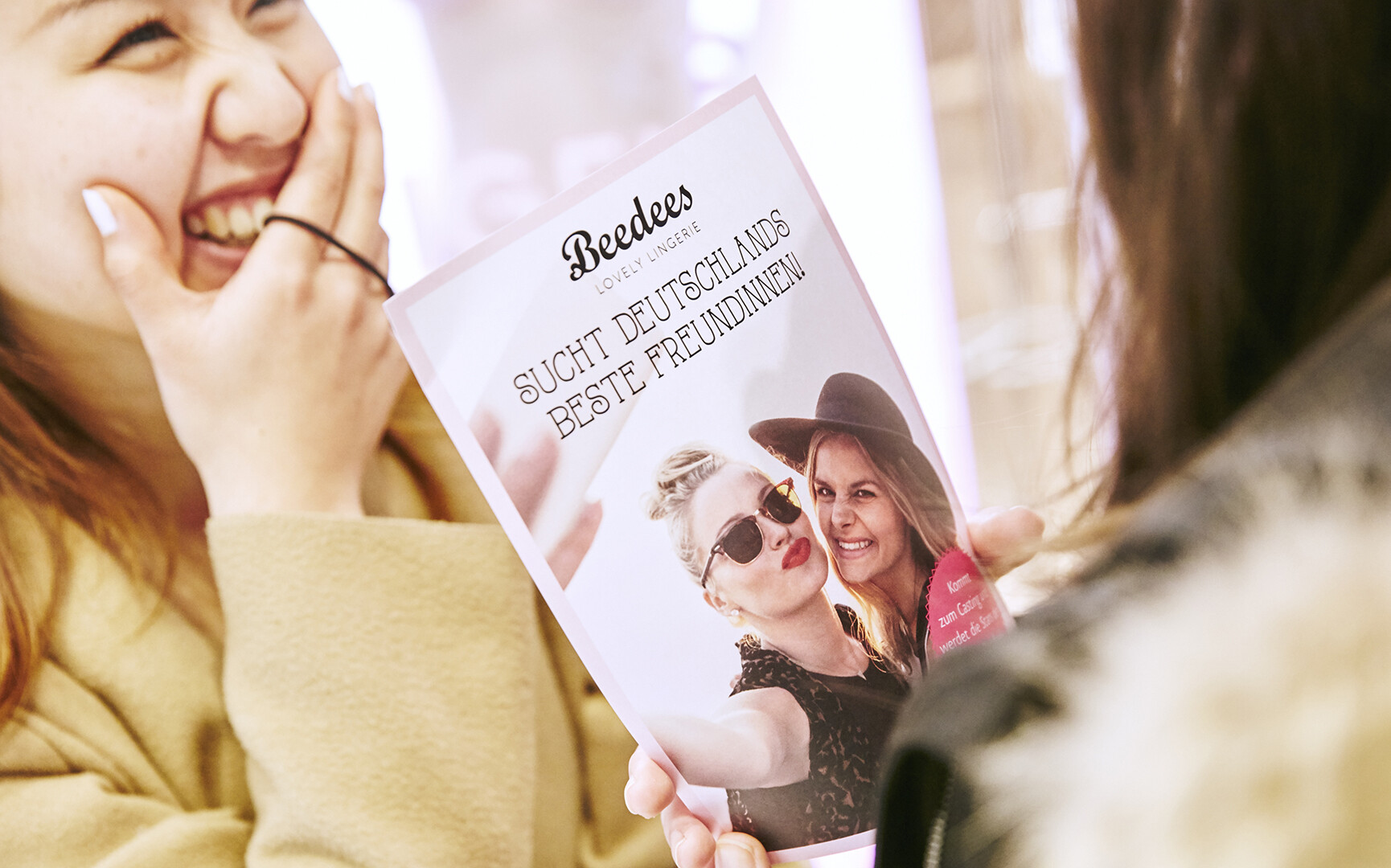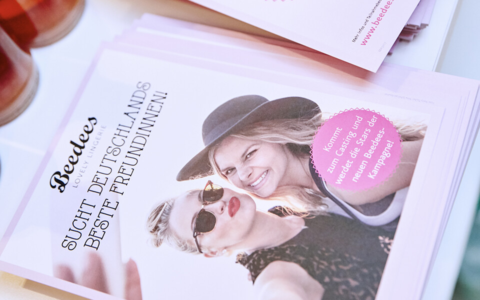 Fast zwei Wochen lang fühlten sich unsere sonst so männlichen Konzeptentwickler wie Frauen, um der Idee zur nächsten Beedees Kampagne genügend Weiblichkeit einzuhauchen. Ziel des Projektes war es, zwei Gesichter für die neue Beedees Herbst-Winter-Kollektion 2016 zu finden. Nach vielen Kurven, Rosa und Romantik waren wir uns schnell einig – die junge Marke von Triumph brauchte mehr als ein gewöhnliches Modelvoting. Deshalb die Idee: Beedees sucht Deutschlands beste Freundinnen. Ein Battle, mit den gleichen Chancen für alle, wurde ins Leben gerufen – eine Challenge im Namen der Freundschaft. Wir zeichneten uns hierbei neben Konzeption und Durchführung der Livecastings in fünf deutschen Städten und des Finales auch für die gesamte Kommunikationskampagne verantwortlich.