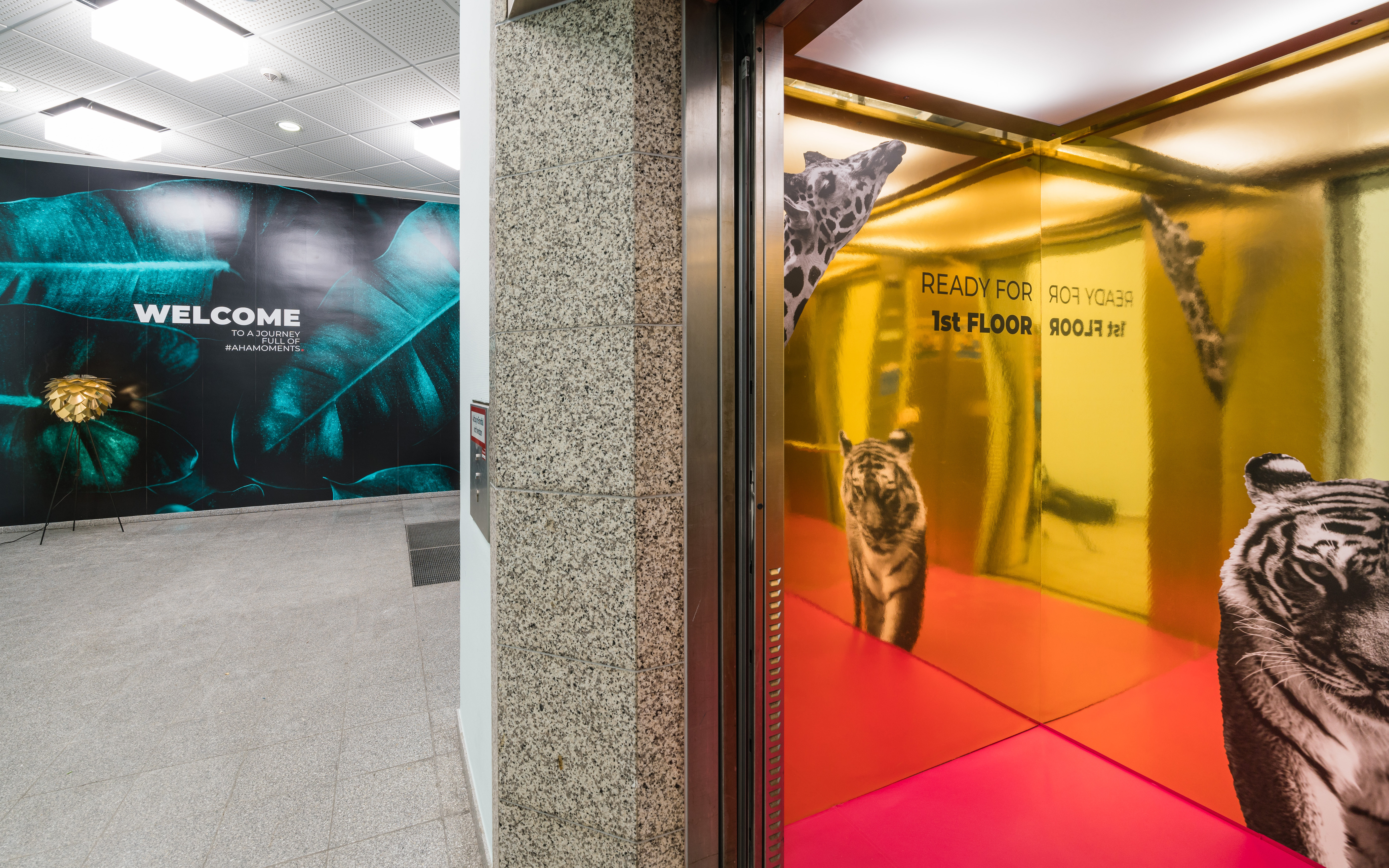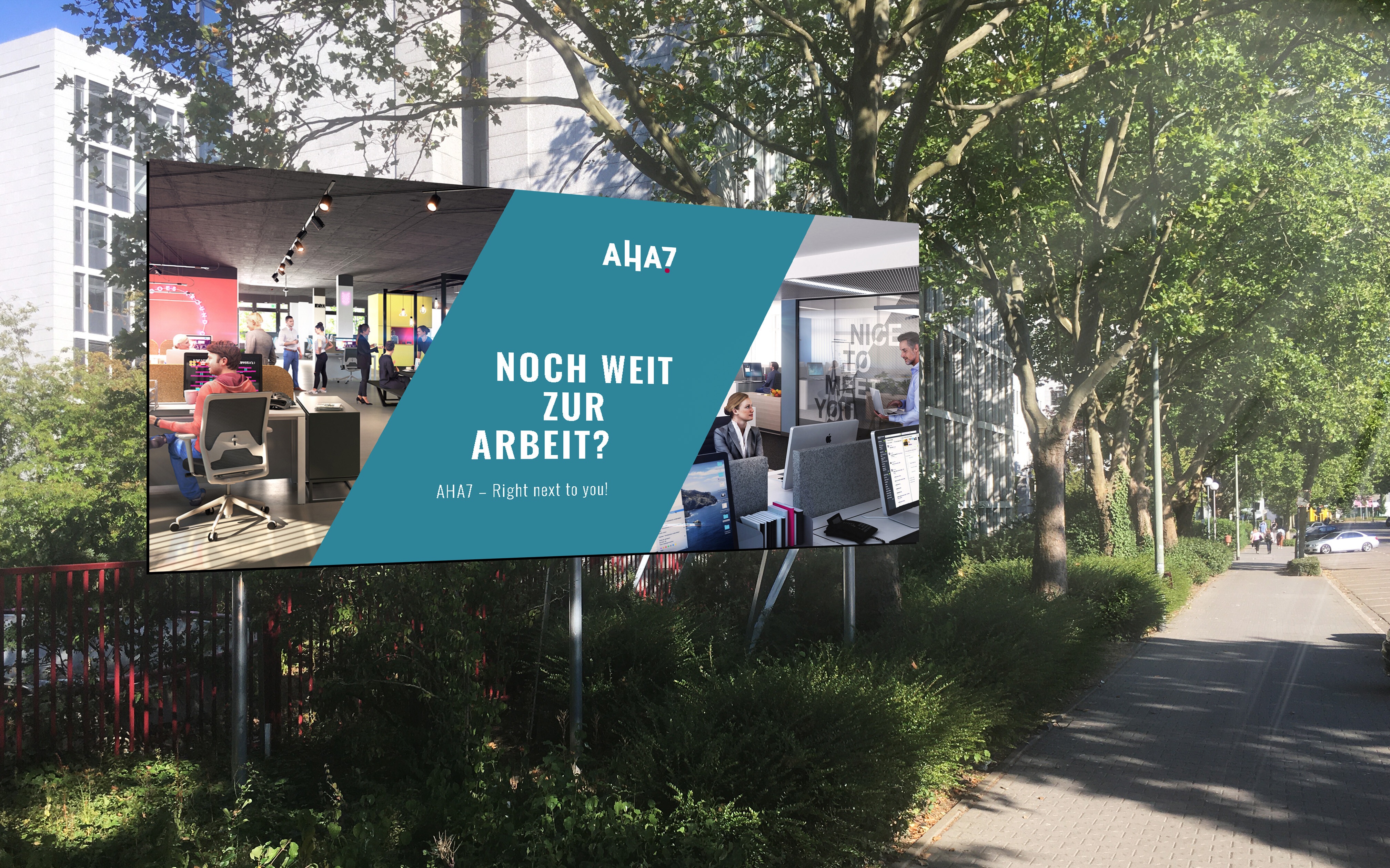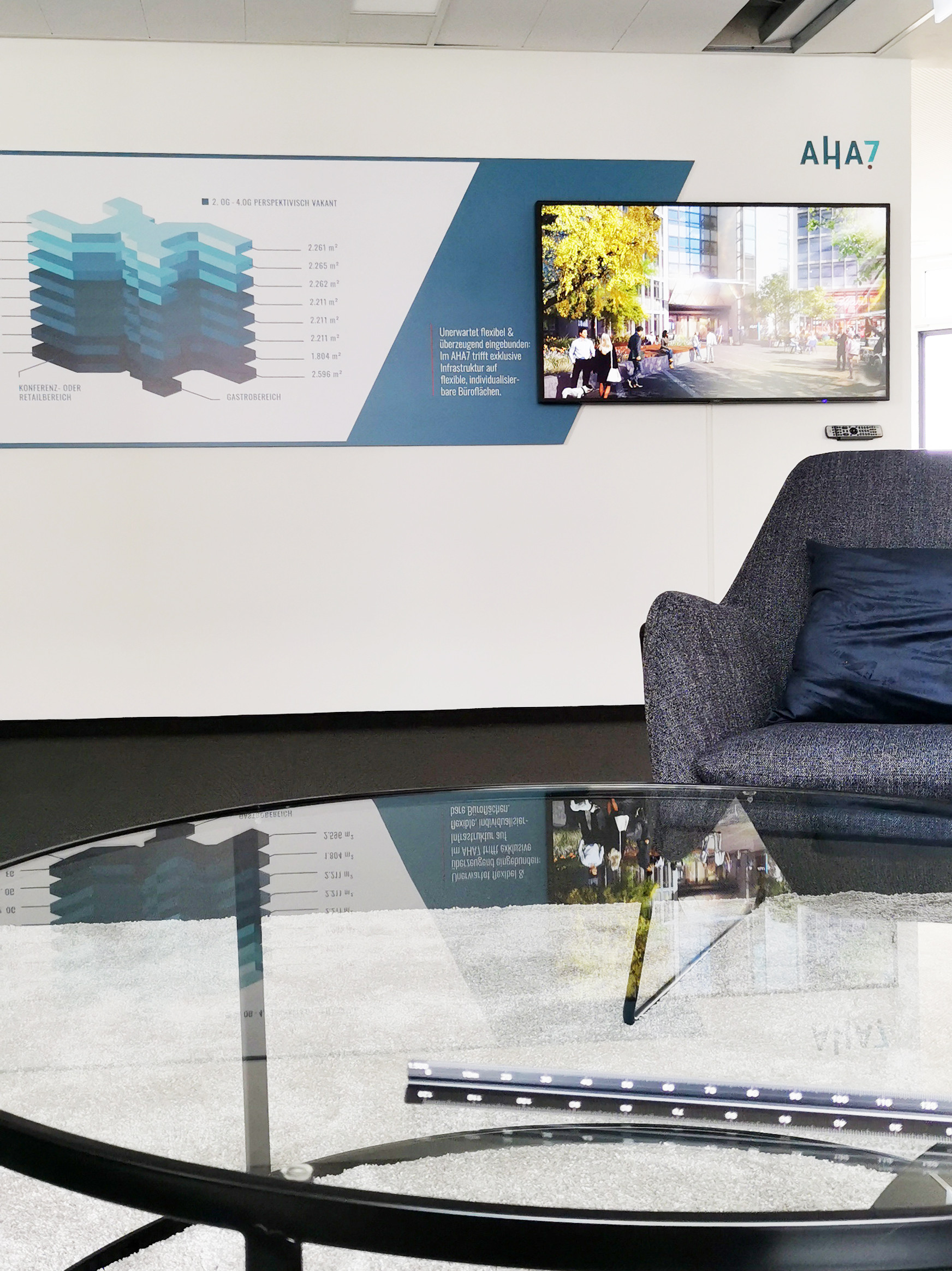 Die Customer Journey beginnt bereits vor dem Betreten des Gebäudes: Um die Marke AHA7 auch nach außen hin strategisch zu kommunizieren, wurden basierend auf den Exposé- und Website-Inhalten Bauschilder, Fenstergrafiken und Fassadenbanner entwickelt und auf dem Areal platziert.