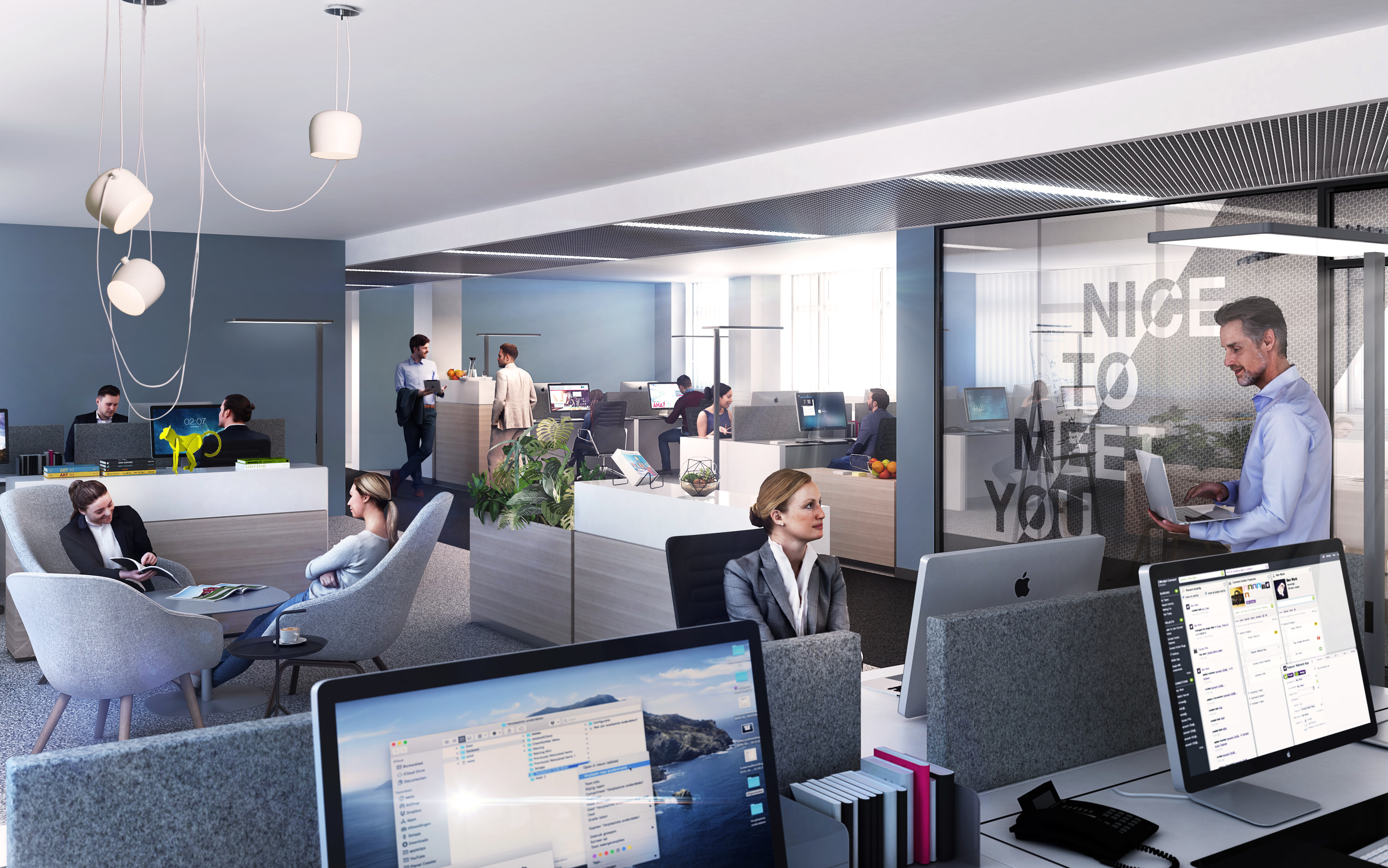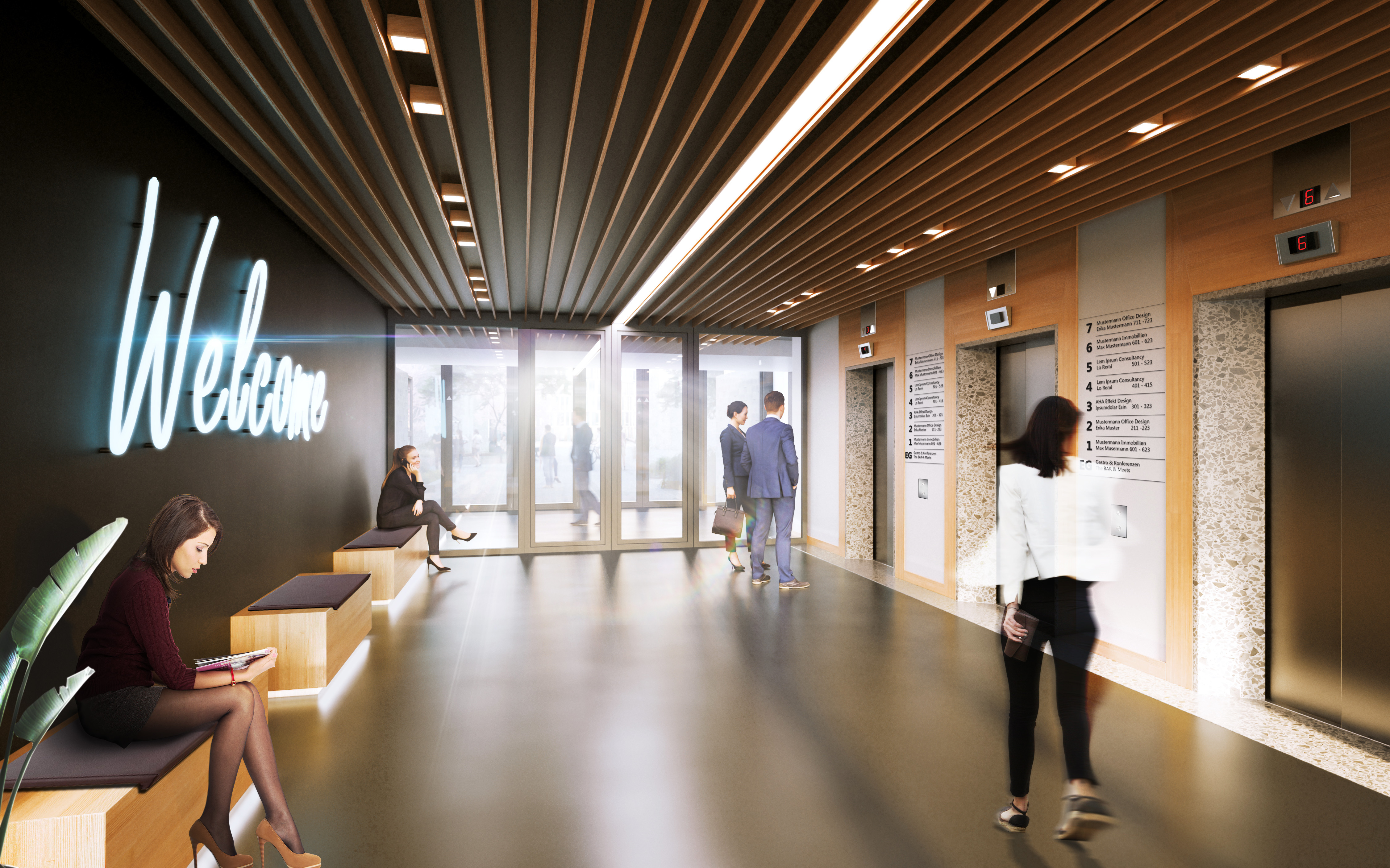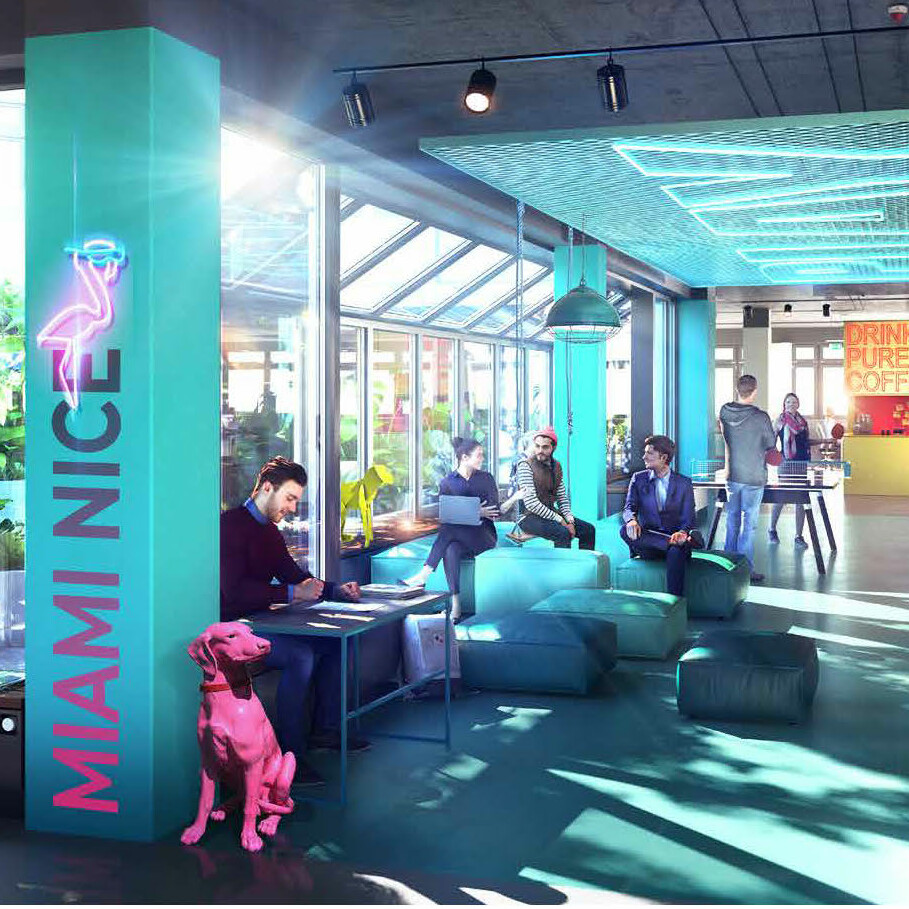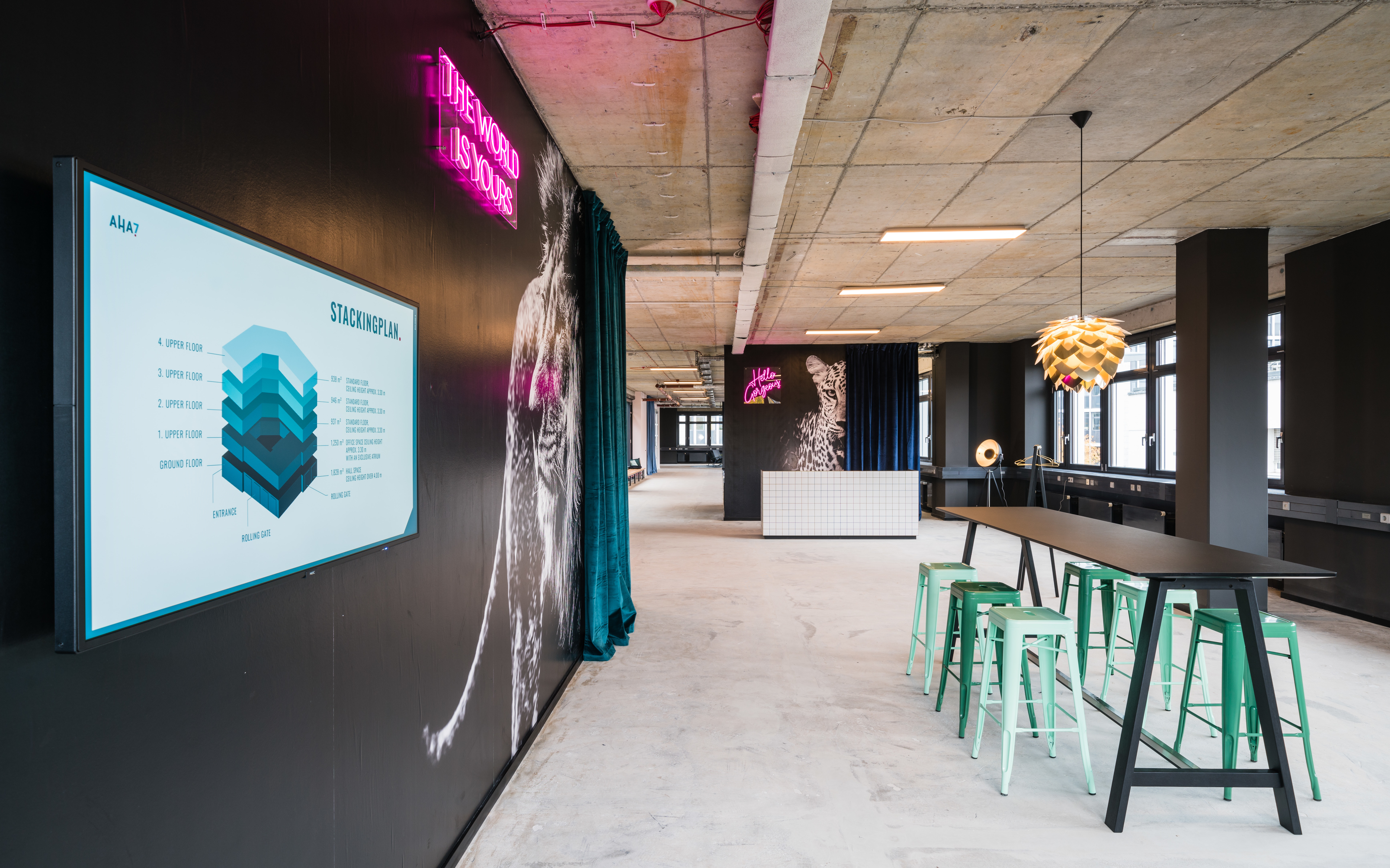 In den beiden Häusern A und B können individuelle Bürokonzepte realisiert werden. Haus A bedient eher den "klassischen" Mieter, wohingegen Haus B durch sehr hohe Decken und einem Atrium ein Loft-Feeling ausstrahlt – genau richtig für (grown up) Start Ups. Für beide Häuser haben wir dementsprechend zielgruppengerechte Markenräume kreiert und durch Grafik im Raum, Möblierungsbeispiele und digitalen Screens den jeweiligen Charakter der beiden Häuser ausgearbeitet und erlebbar gemacht.