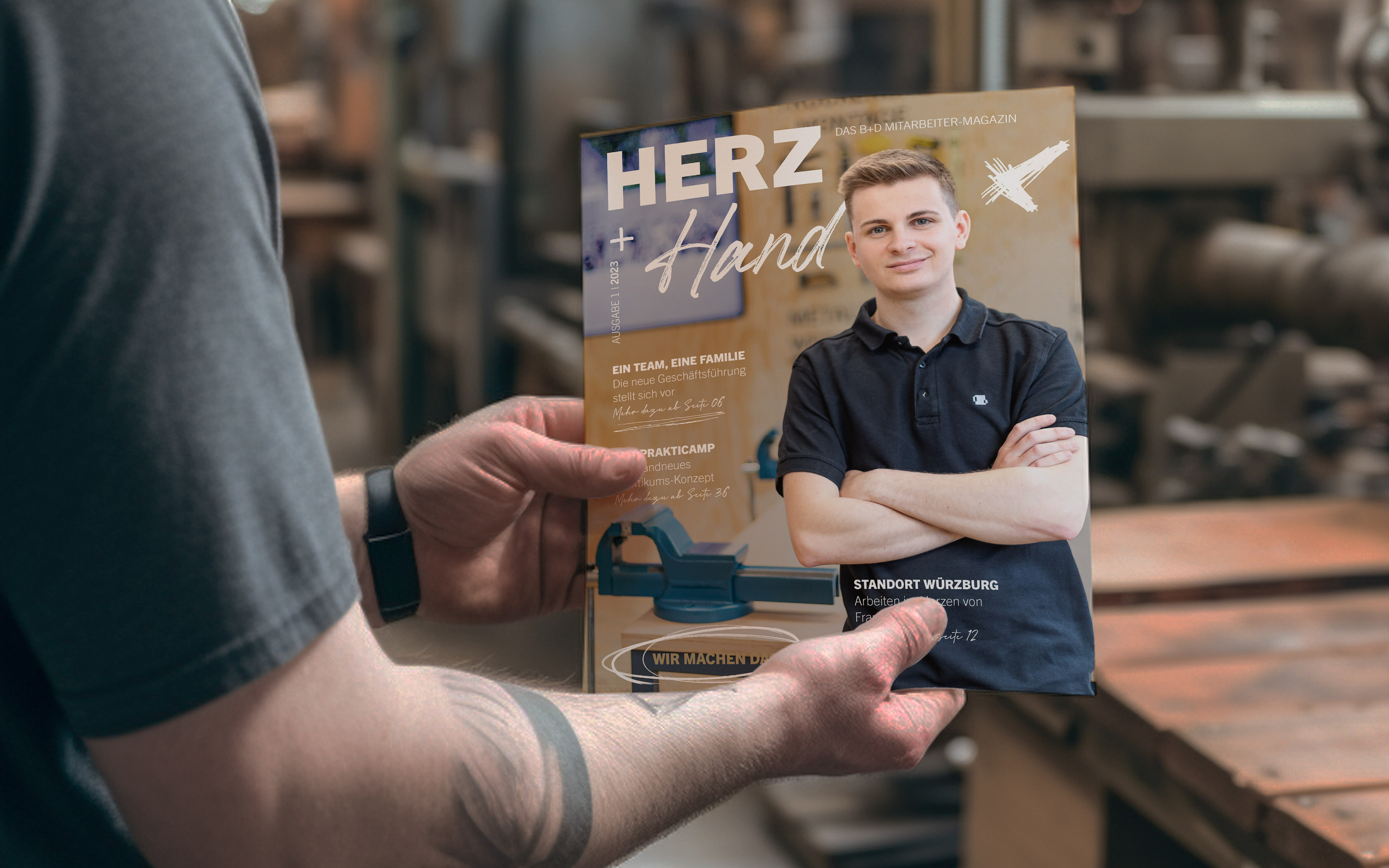 Die Basis des Magazins ist bewusst offen und einfach gestaltet: B+D Mitarbeitende schreiben die Inhalte des Magazins aus den verschiedenen Perspektiven des Unternehmens selbst. Die Rubriken spiegeln dabei alle wichtigen Themenbereiche wider.