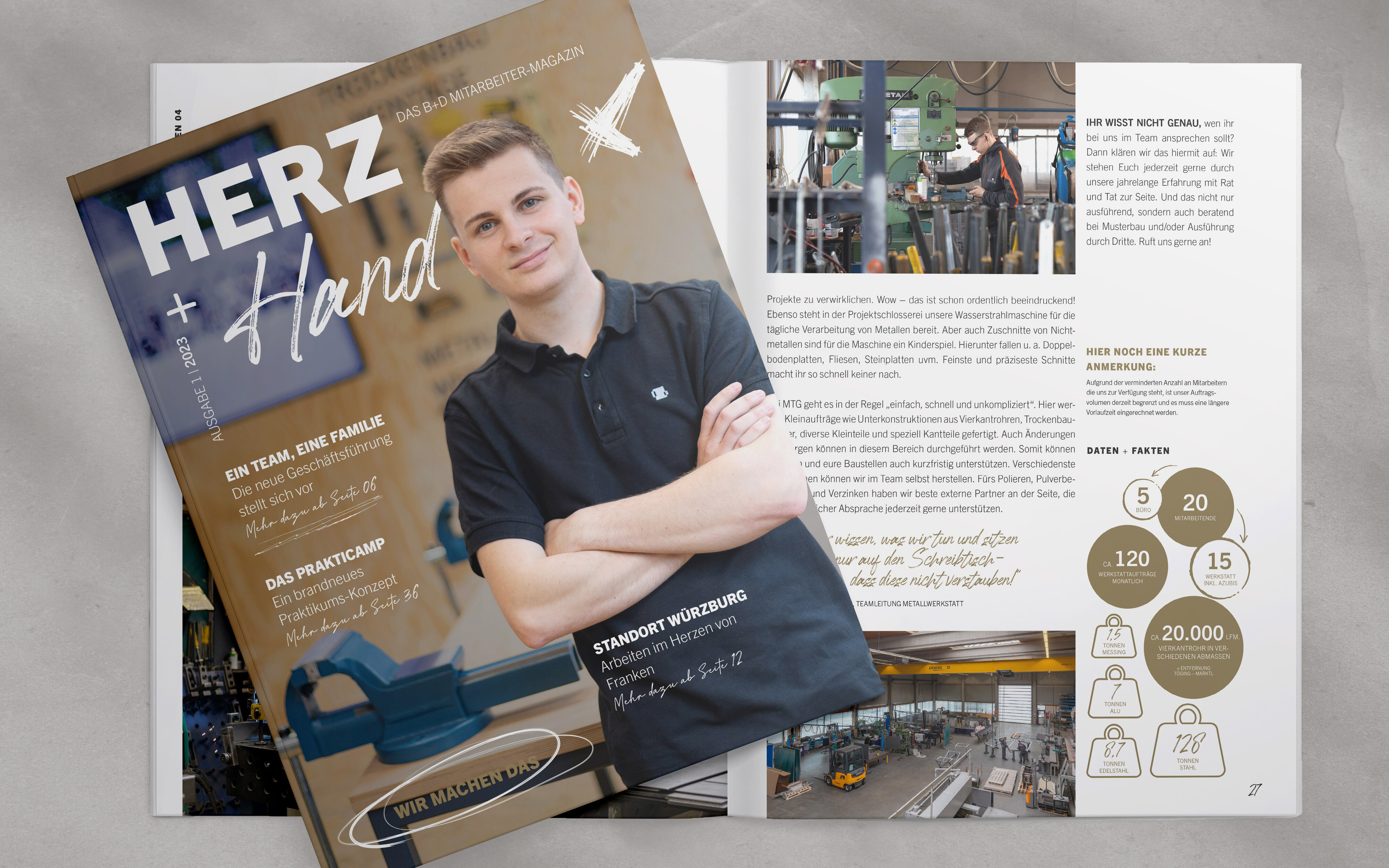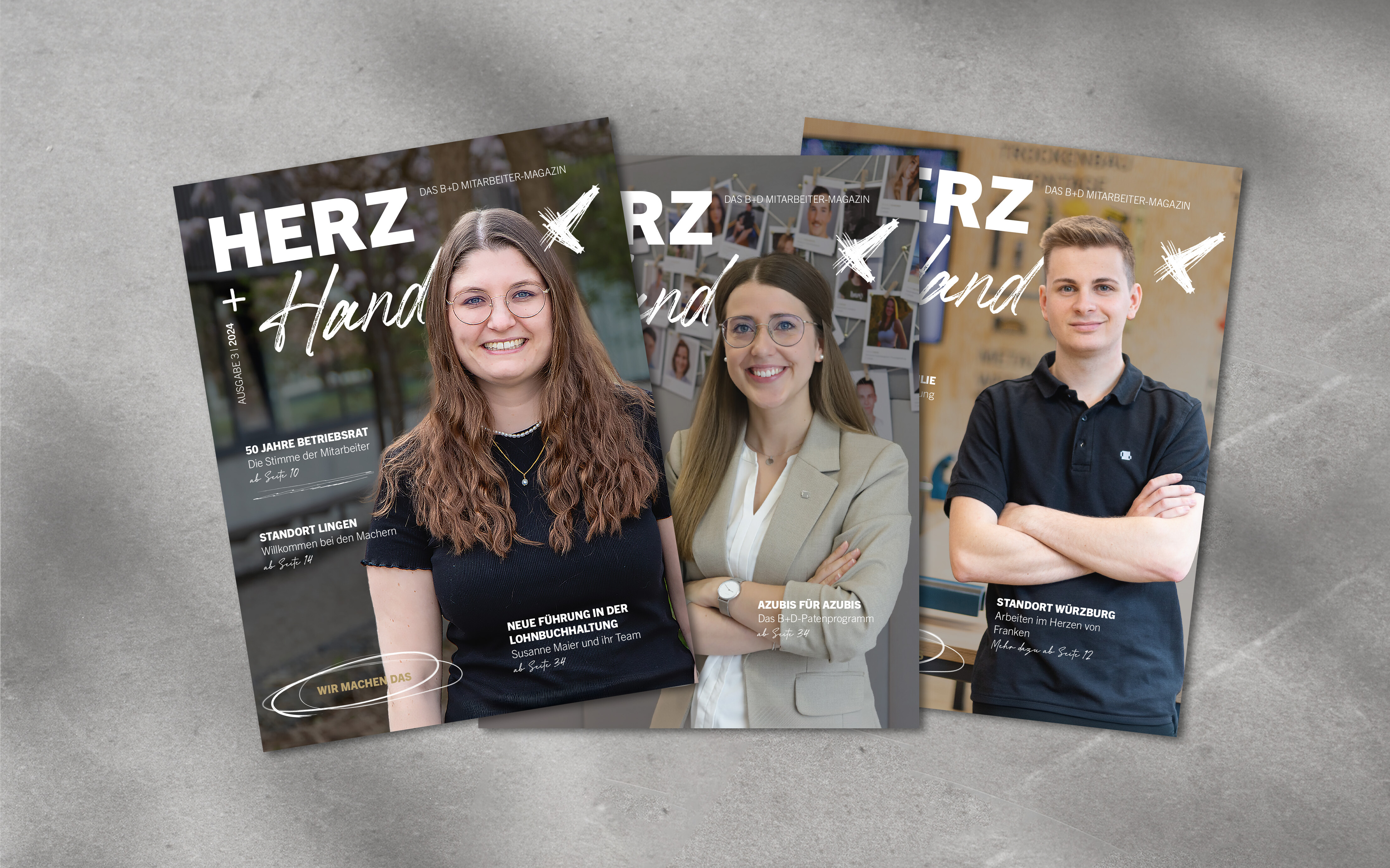 Von der Vorstellung einzelner Standorte über spannende Einblicke in die Welt der Inneneinrichtung bis hin zu Tipps und Tricks bietet das "B+D Mitarbeiter-Magazin" ein breites Themenspektrum für Mitarbeitende. Gemeinsam mit unserem Kunden haben wir relevante Rubriken entwickelt, die das Magazin in informative und unterhaltsame Teile gliedern.