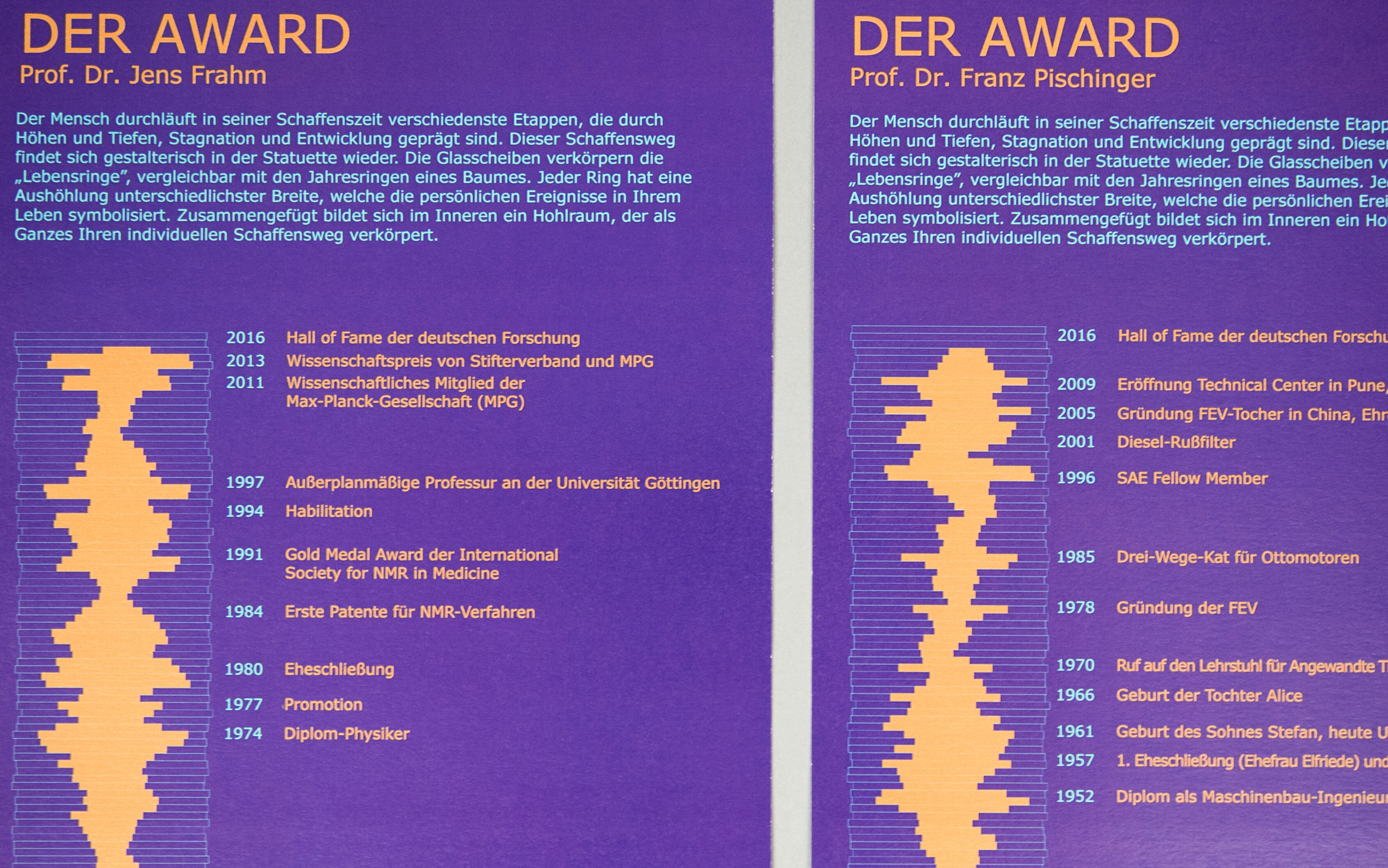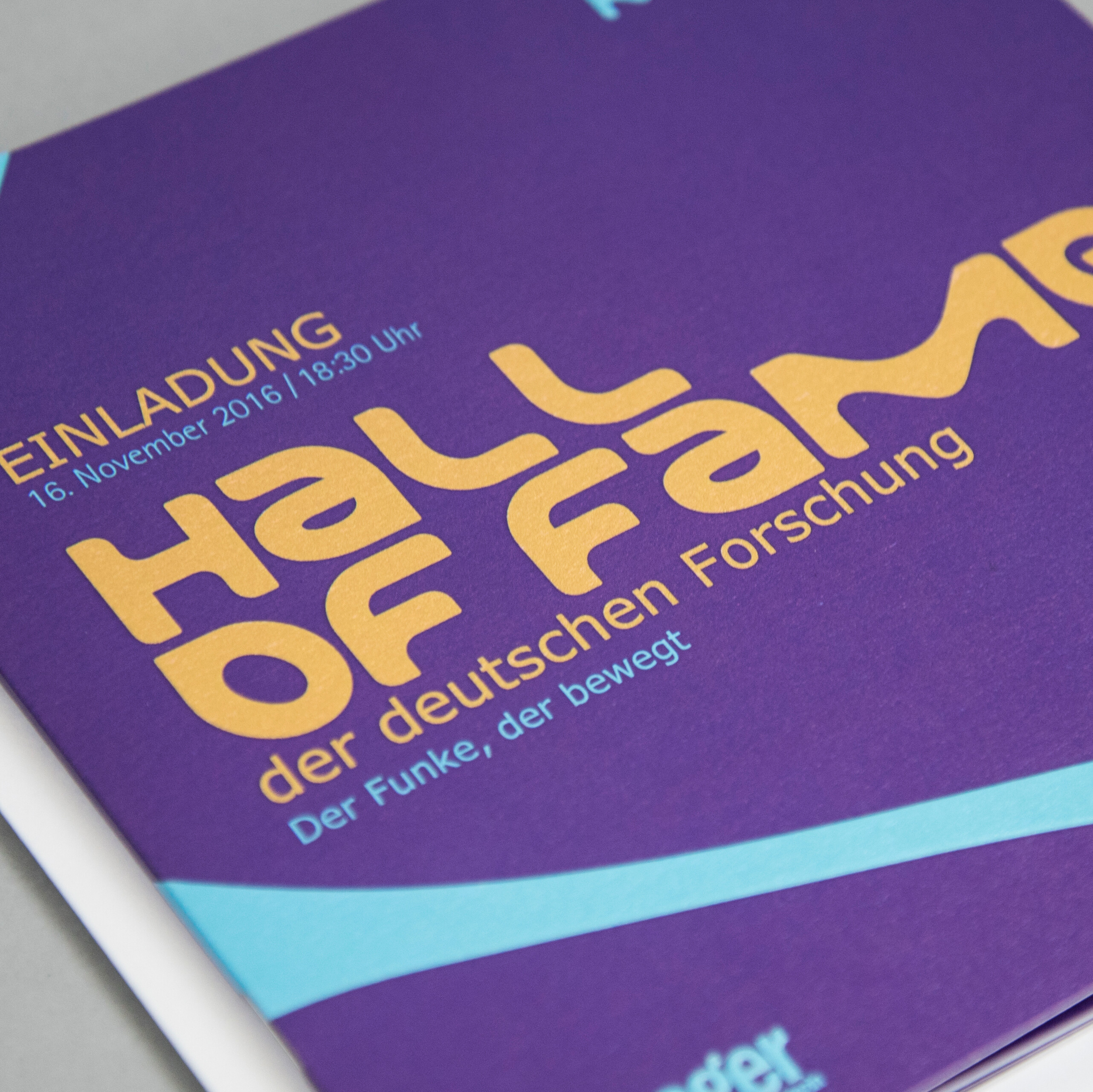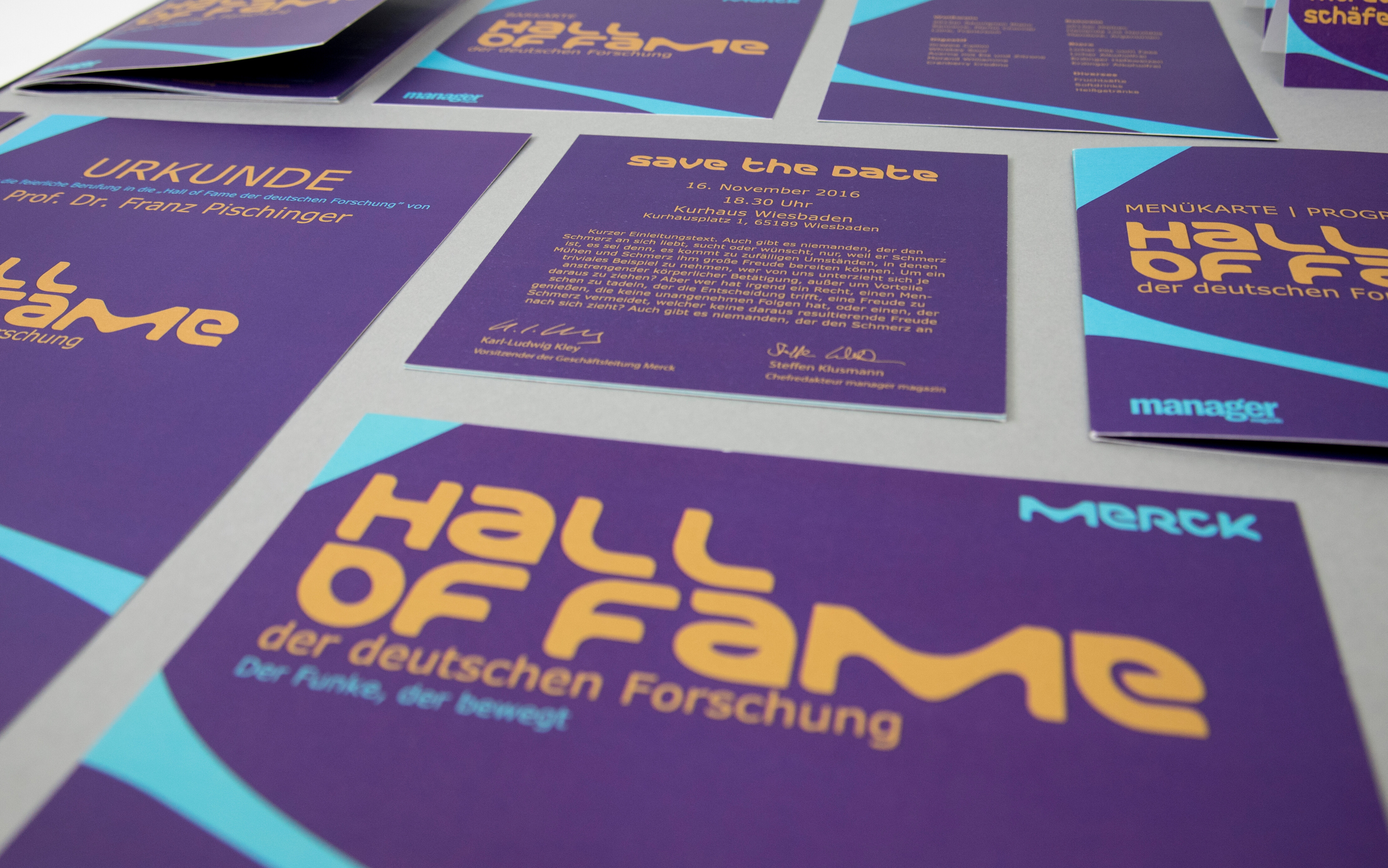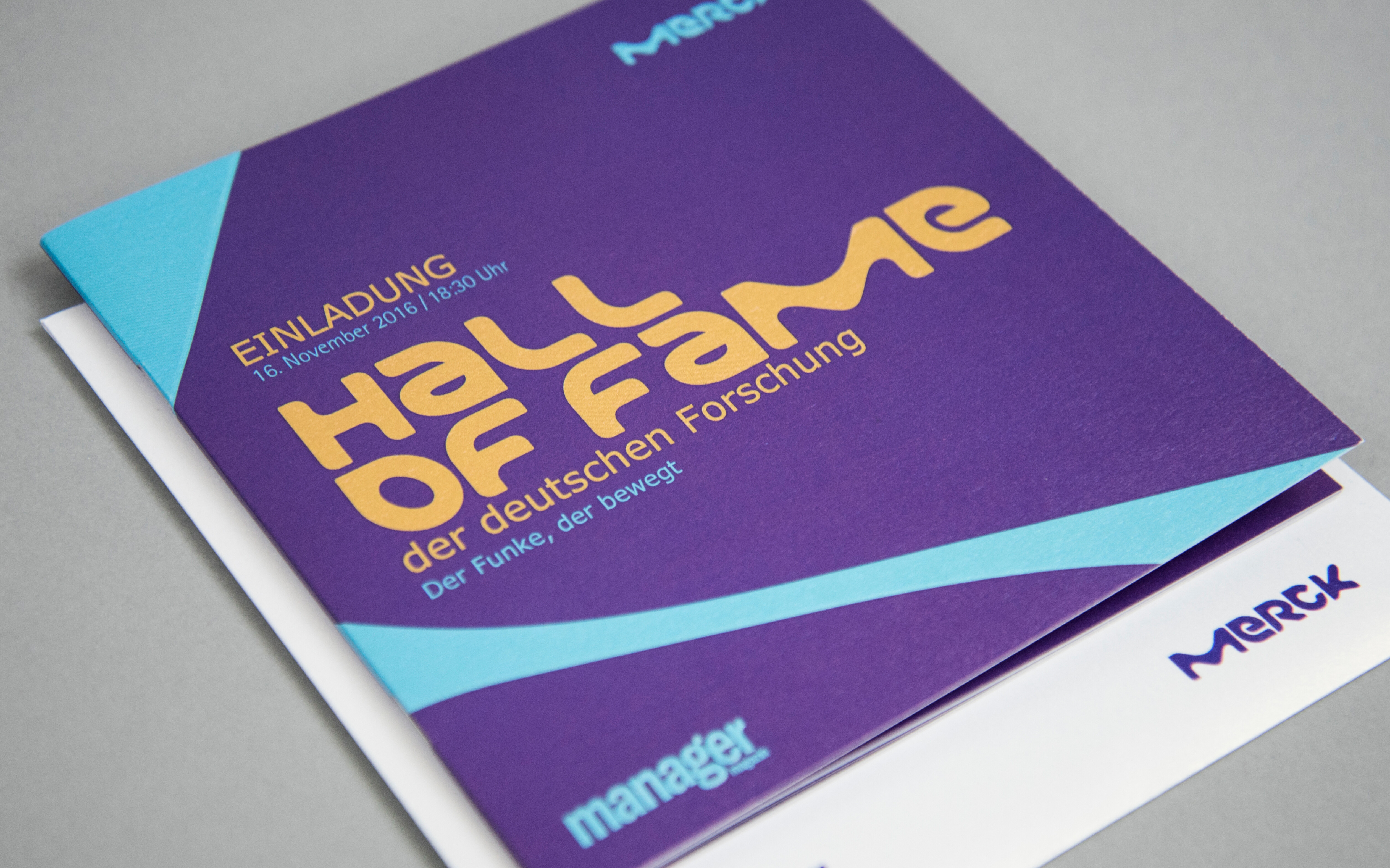 Bereits zum zweiten Mal durften wir mit den Gastgebern Merck und dem manager magazin die Hall of Fame der deutschen Forschung in Konzeption und Umsetzung maßgeblich begleiten und realisieren. Auch das Eventdesign spielte hierbei eine wichtige Rolle, um die Idee der Veranstaltung zu transportieren. Die Bedeutsamkeit und die Exklusivität der Preisverleihung und der diesjährigen Location, dem Wiesbadener Kurhaus, wurden durch enorm hochwertige, haptische Materialien und Goldpigmente widergespiegelt. Durch die quadratische Formgebung des Einladungsbooklets wurde eine Verbindung zu dem Hauptgestaltungselement vor Ort geschaffen, einem Cube, der als Projektionsfläche diente.