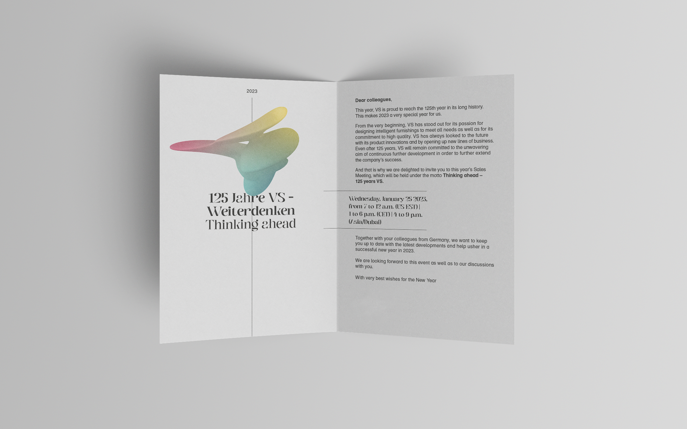 Des Weiteren erarbeitete unsere Design Unit den Slogan “125 Jahre VS – Weiterdenken” visuell. Die Farbwahl und die grafischen Elemente sind hierbei bewusst auffällig gewählt. Entstanden aus den neuen Event-Farben des Kunden und einer traditionellen Tischform ergibt sich das Keyvisual der Vertriebstagung 2023.