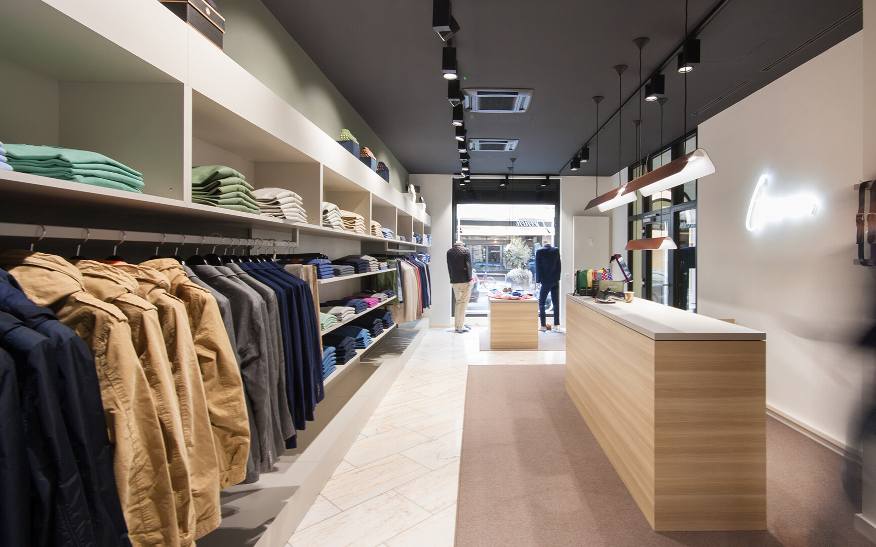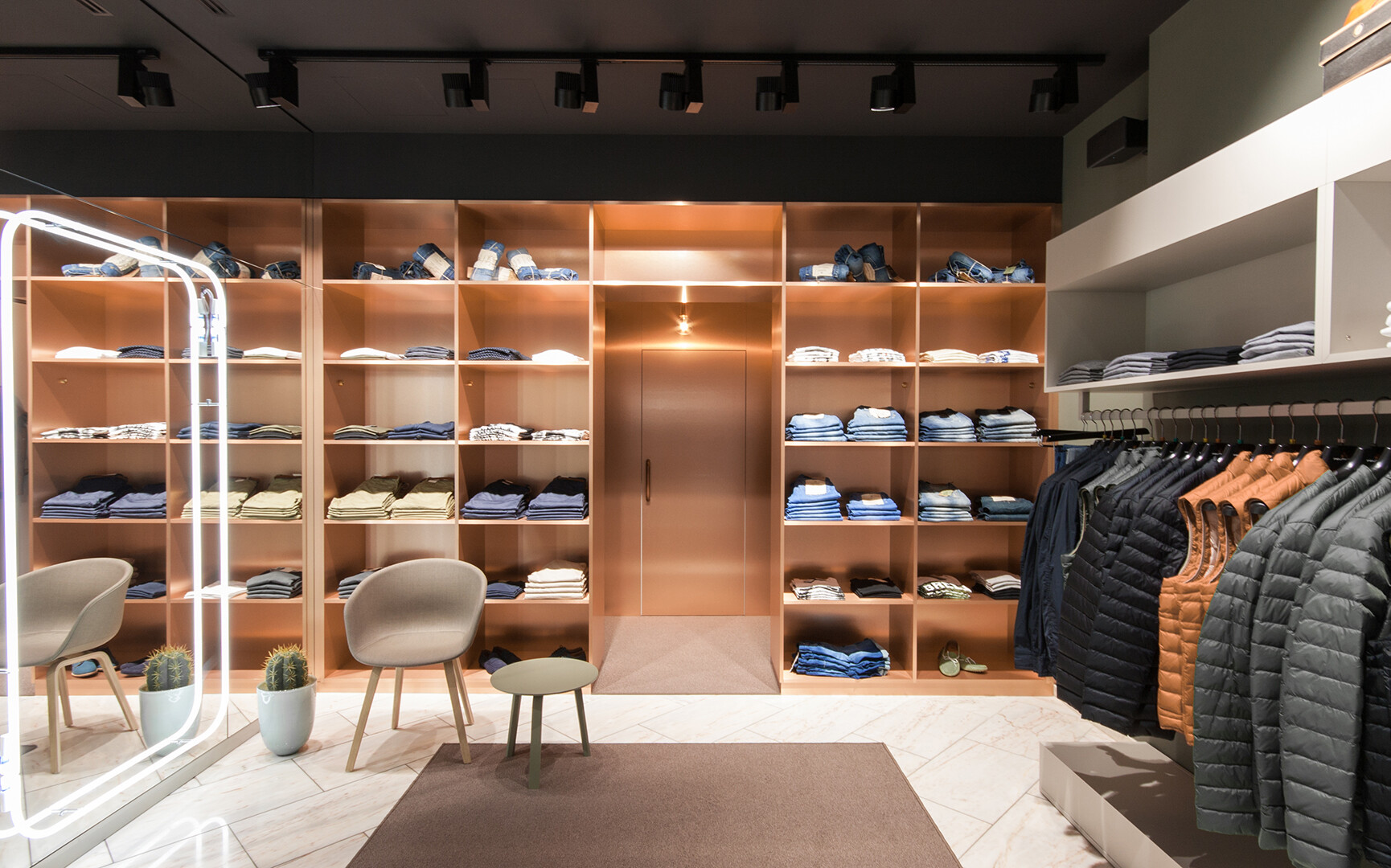 Ein besonderer Eyecatcher: die eigens von Jazzunique entworfenen Leuchten aus Kupfer und verschiedene Neonkonturen, die im Schaufenster und an der Kasse gestalterische Akzente setzen. Eine distinguierte Einrichtung mit klarer Linienführung verleiht dem Landen zusätzliche Aufenthaltsqualität.