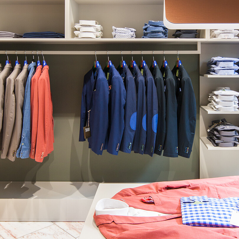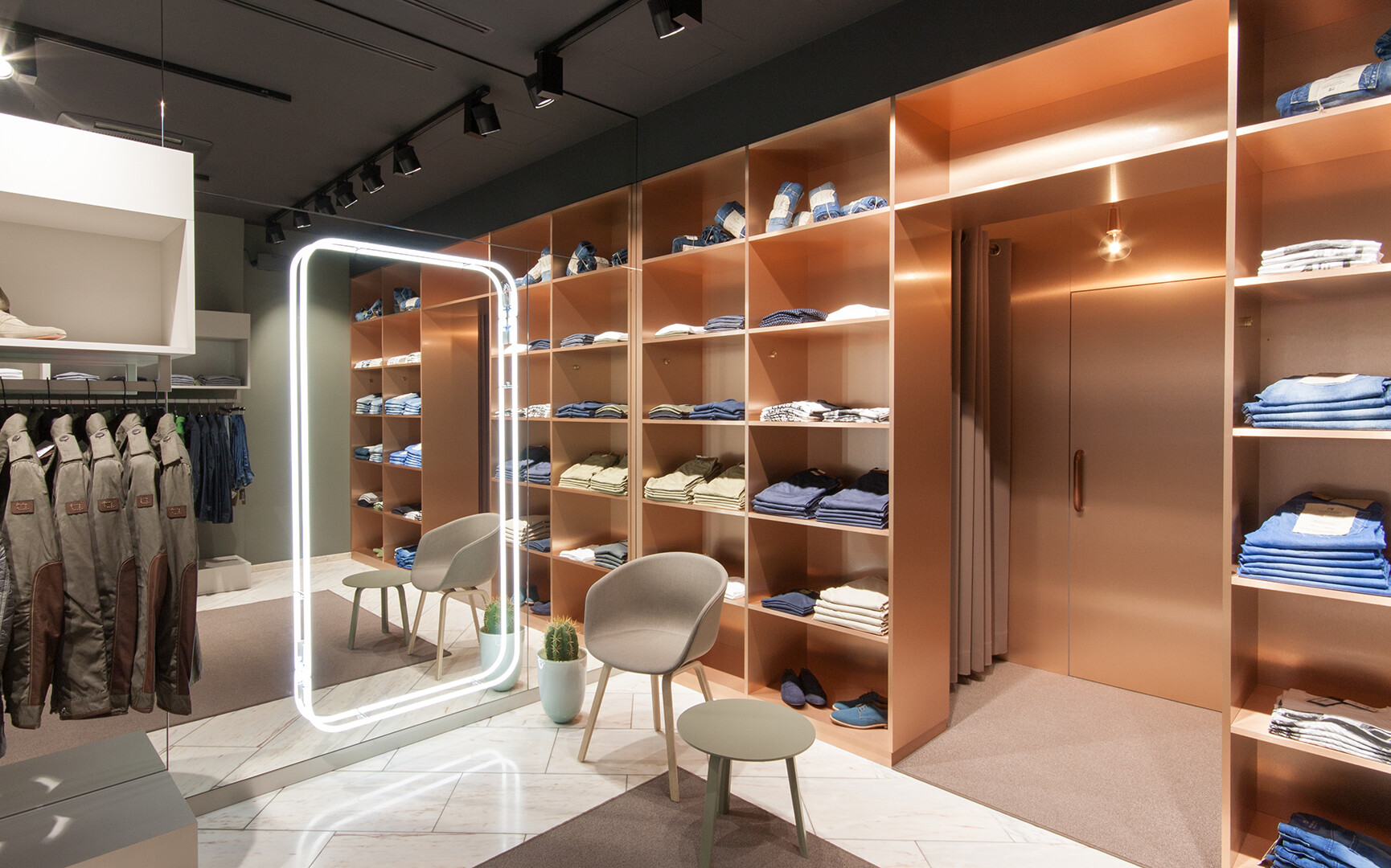 Einen gestalterischen Kontrastpunkt zum klassizistischen Prunkbau schuf Jazzunique im Rahmen des Shopkonzepts der Herrenboutique Beenen. Reduziertes Design mit natürlichen Materialien wie Kupfer und Holz ergänzen den prächtigen Marmorboden und geben der exklusiven Mode genügend Raum zu wirken.