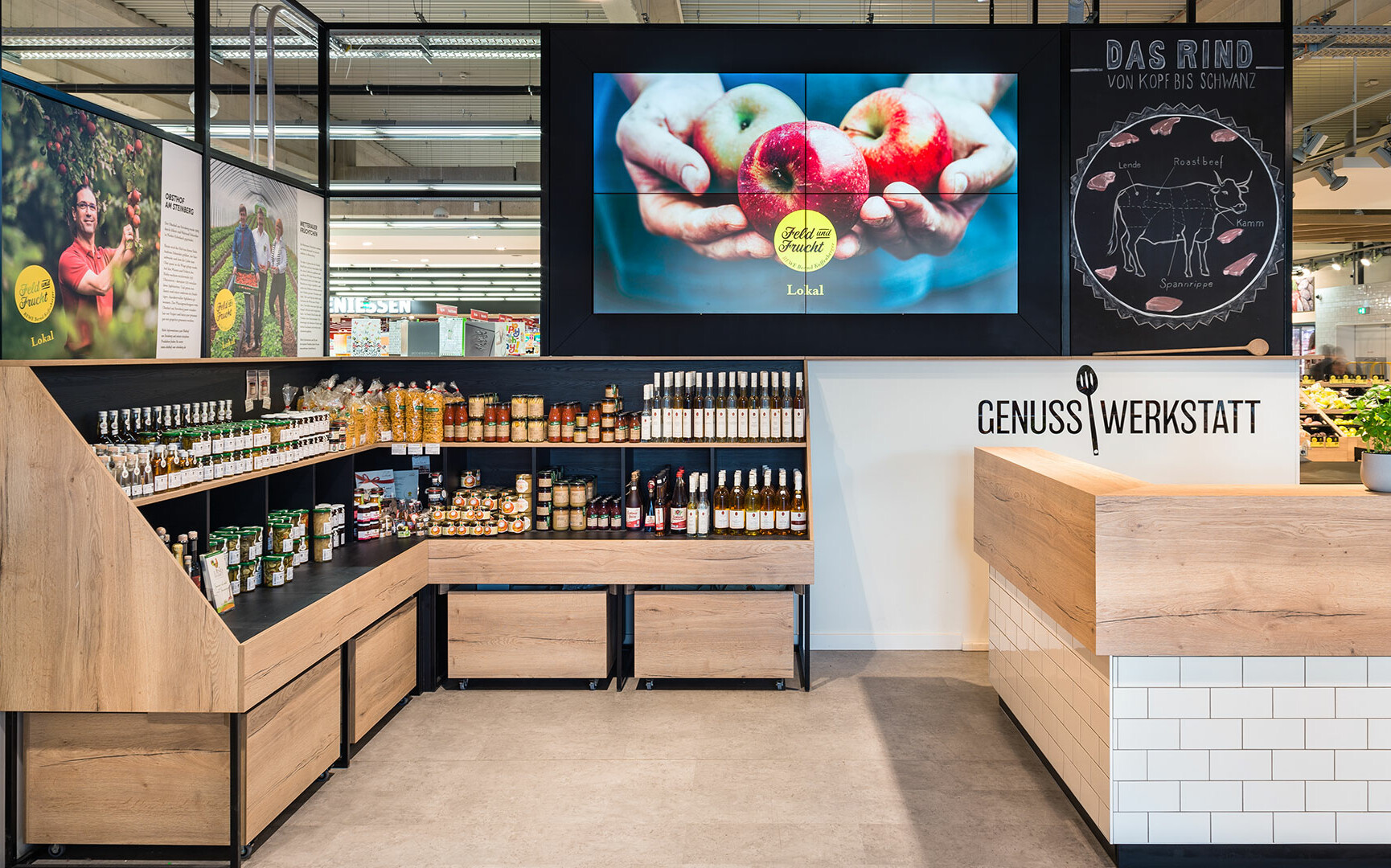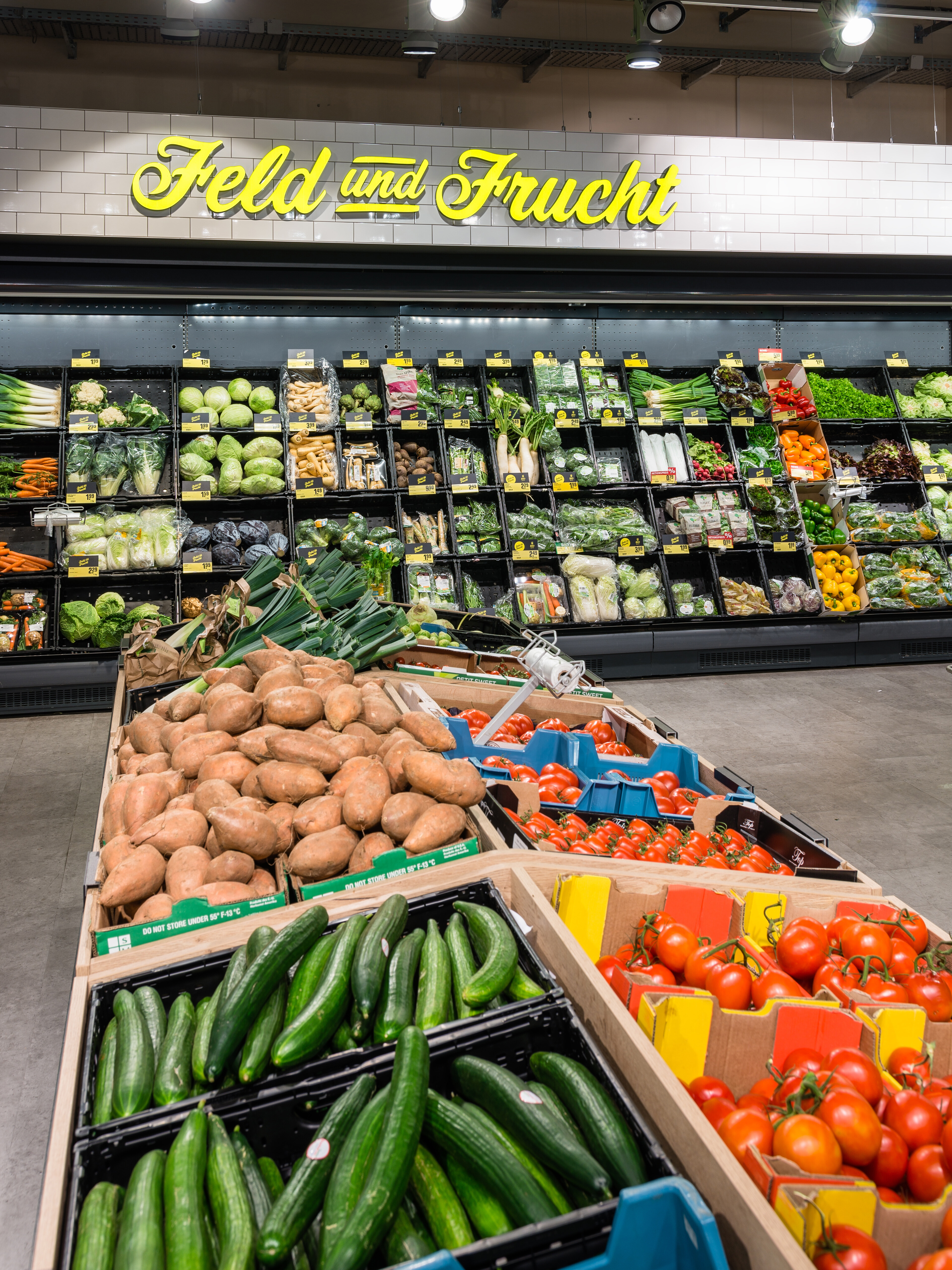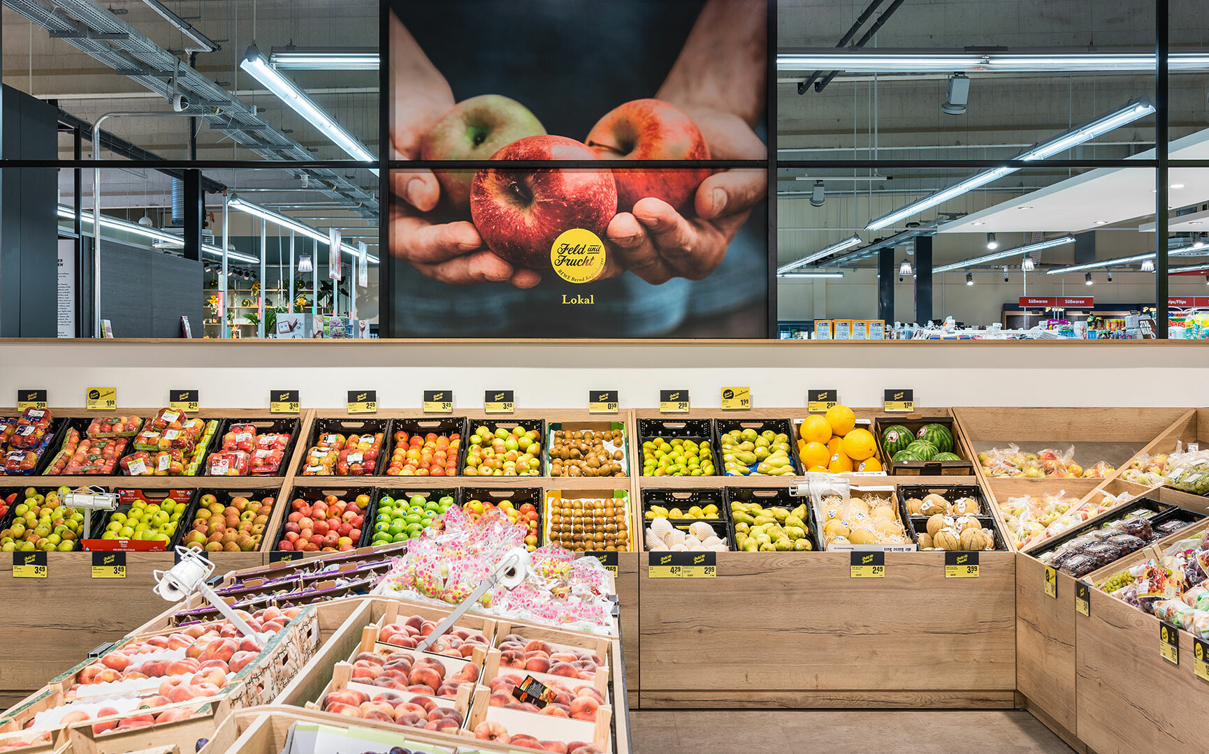 Die Obst- und Gemüseabteilung ist häufig das Aushängeschild eines Supermarktes. Im größten selbstständig geführten REWE des Rhein-Main-Gebiets, dem REWE Bernd Kaffenberger in Bad Vilbel, hatten wir gemeinsam mit der Werbeagentur burnthebunny die Aufgabe, diese Abteilung in ein Einkaufserlebnis zu verwandeln. Die Leitidee der Neugestaltung lautete „der Wochenmarkt im Supermarkt“, weil im neu geordneten und übersichtlicheren Angebot vor allem saisonale und regionale Produkte im Mittelpunkt stehen werden.