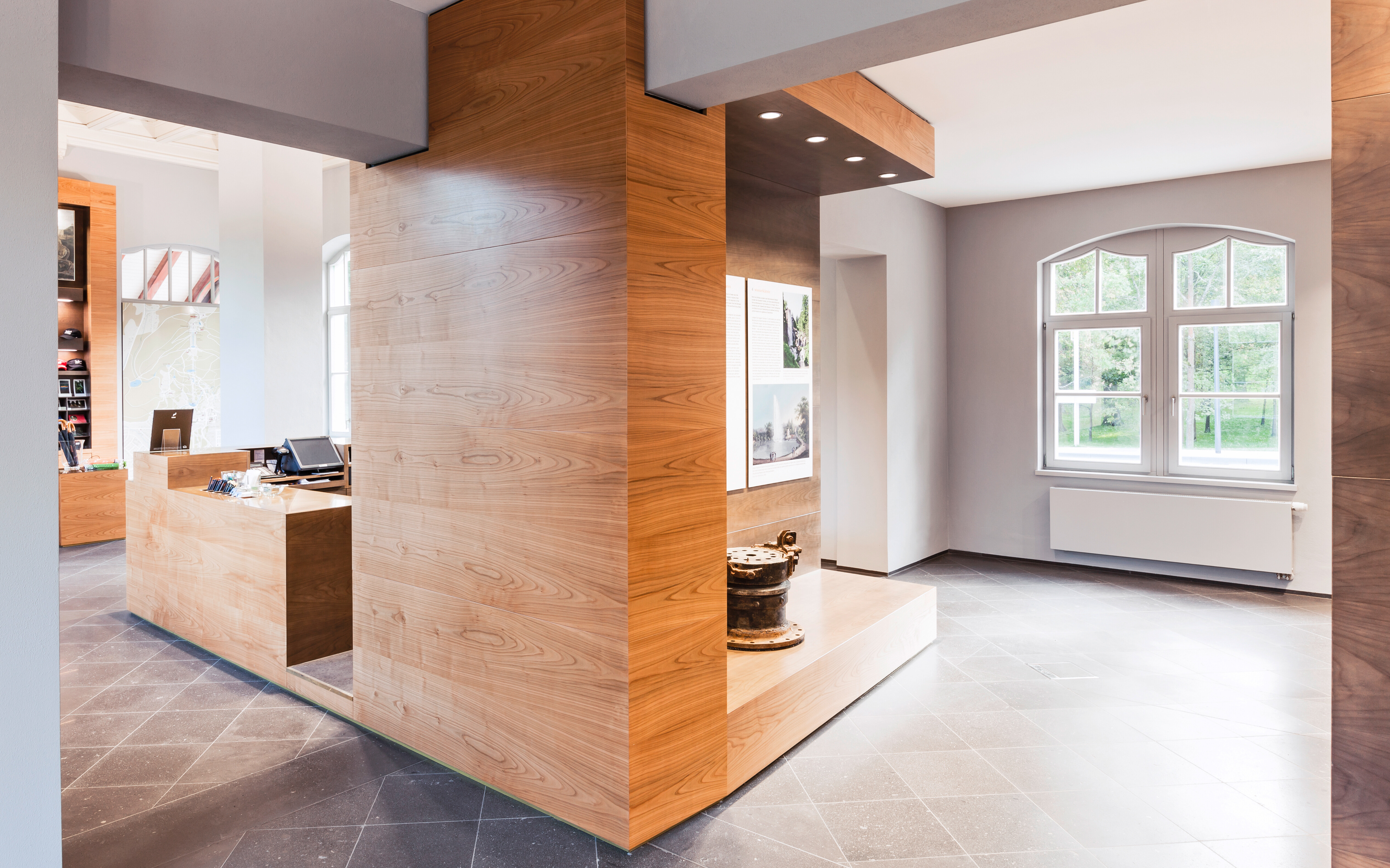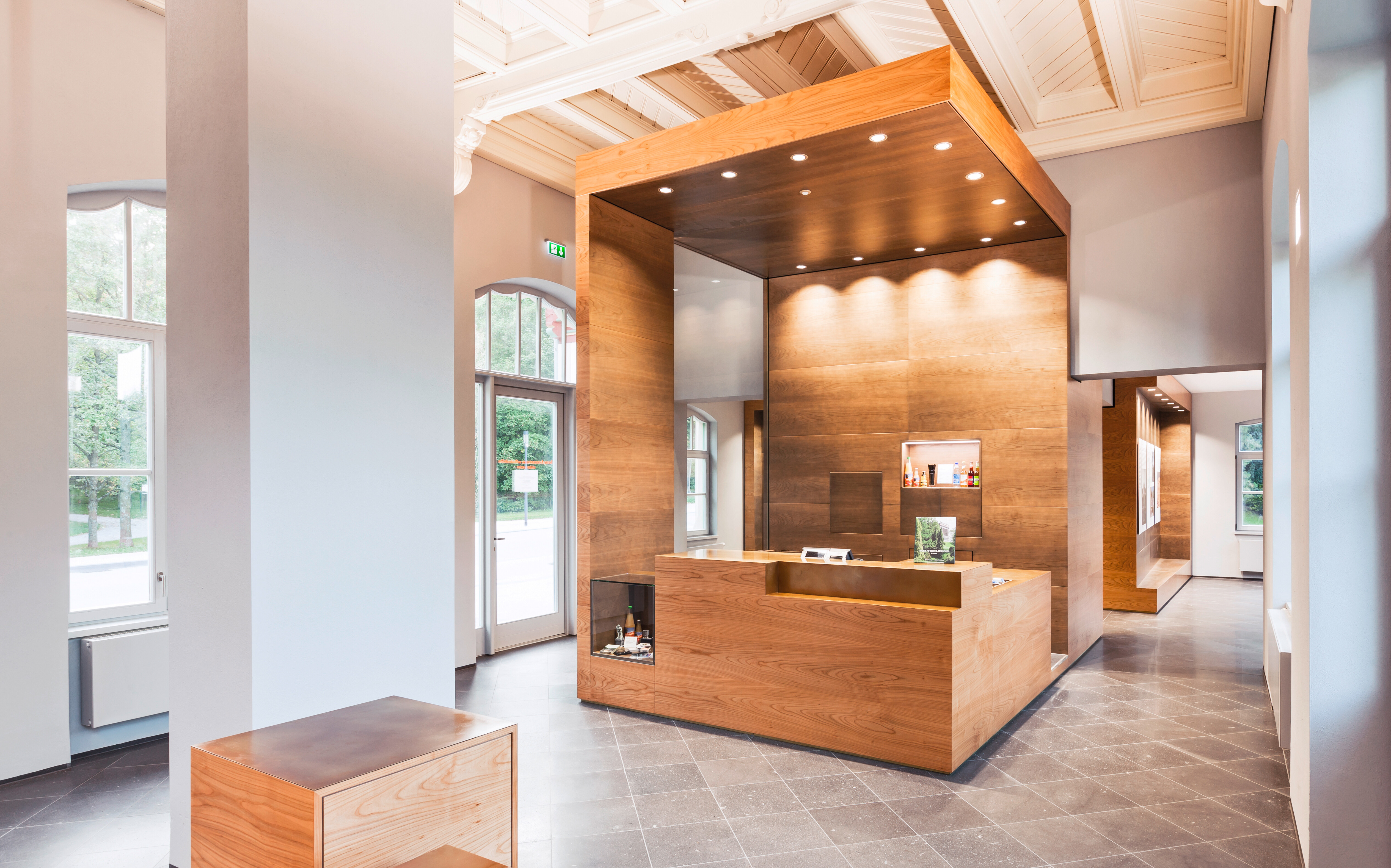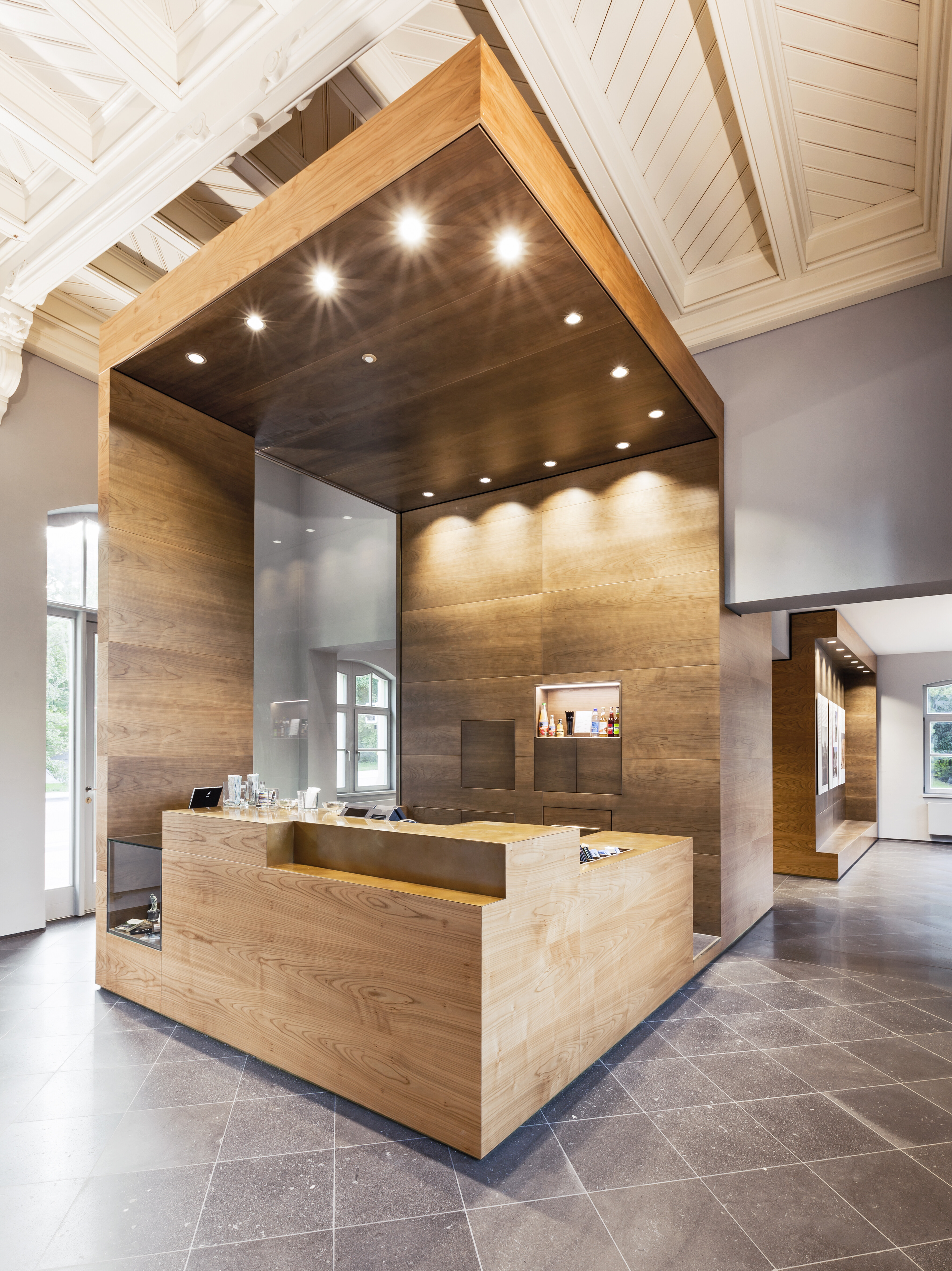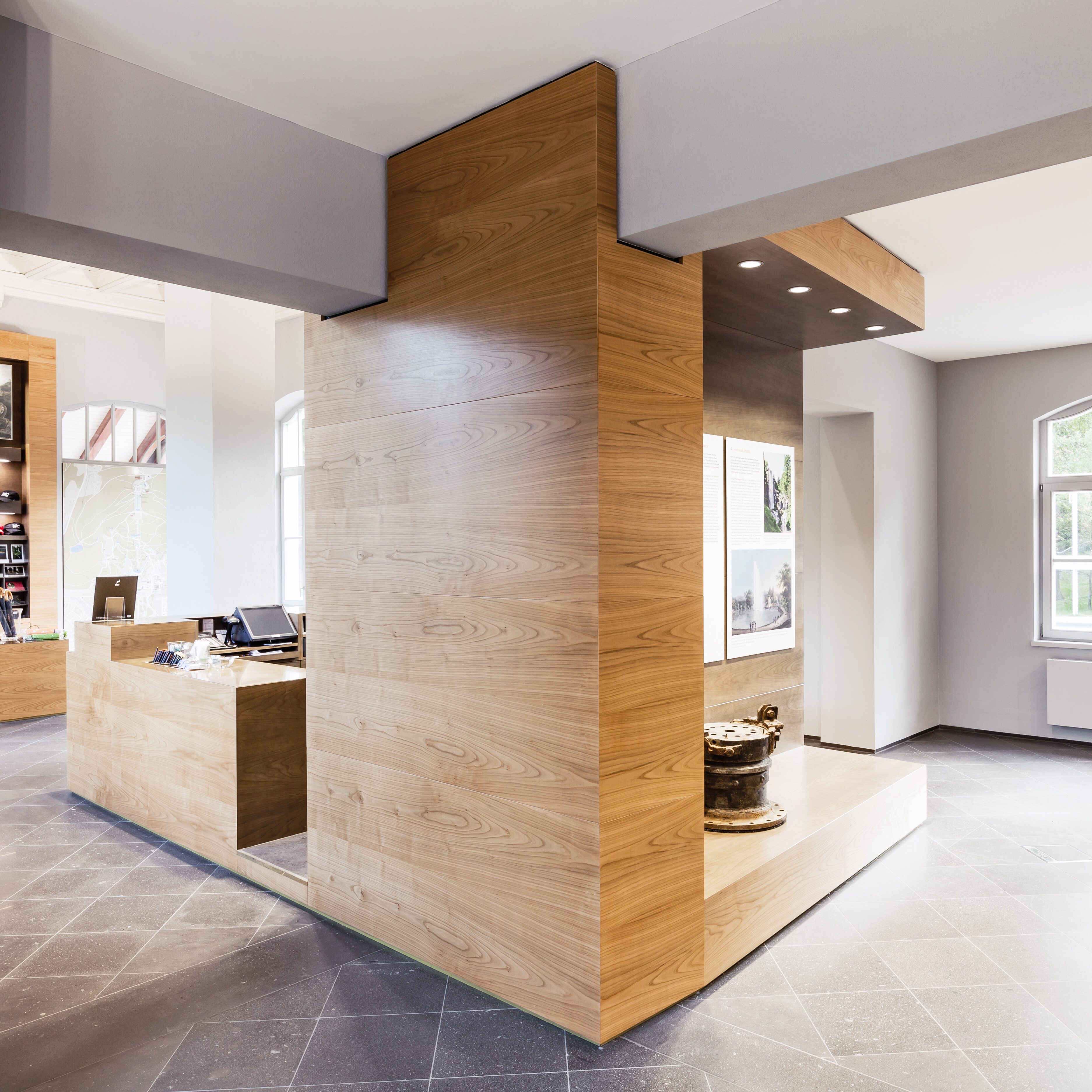 Um fließende Raumübergänge zu schaffen, haben die Architekten jedem der drei Funktionen Volumen in Form eines raumbildenden Kubus zugeordnet. Der zentrale Kubus, der den Informations- und Kassentresen beinhaltet, greift in alle drei vorhandenen Räume ein und verbindet sie auf diese Weise.