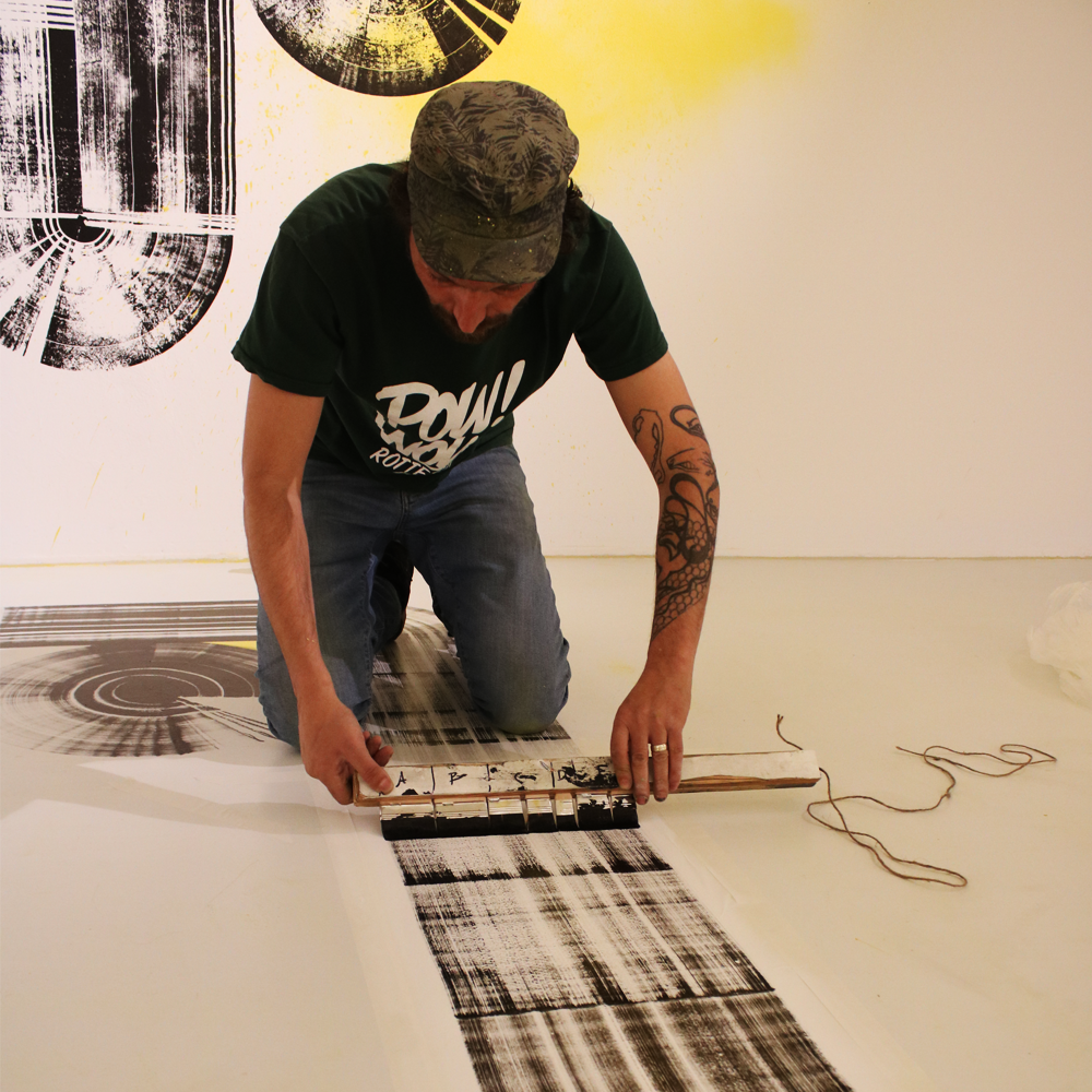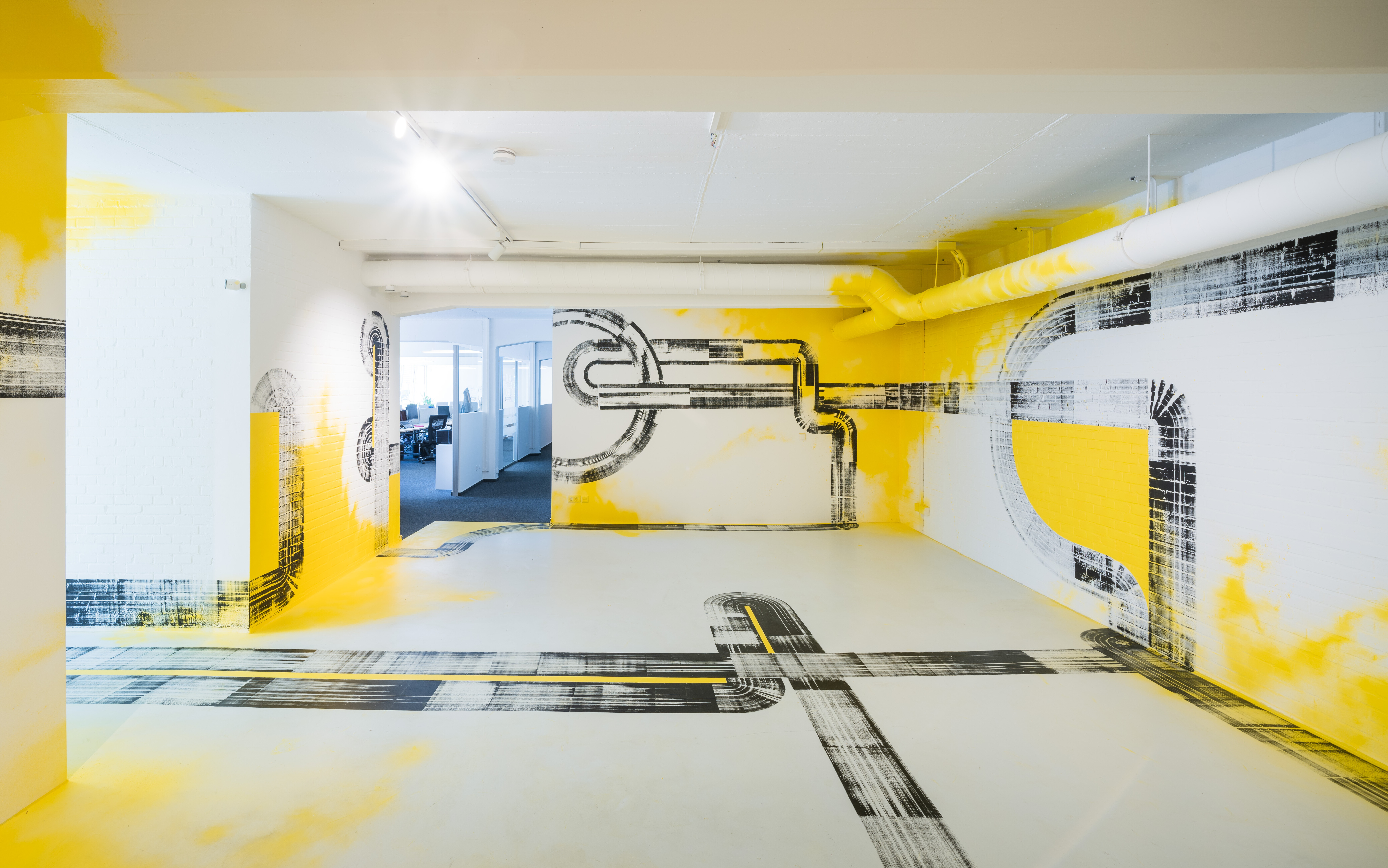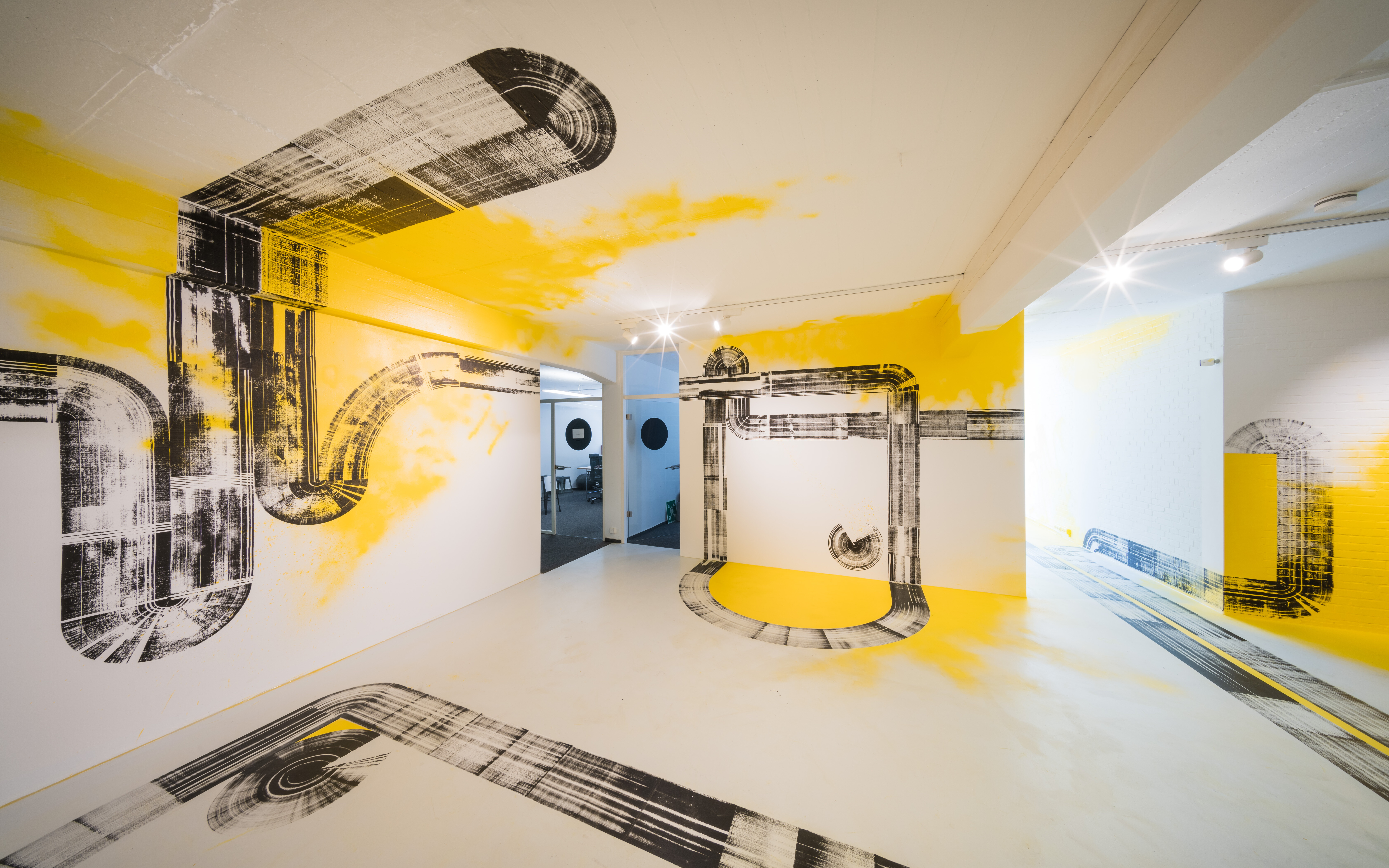 The type of cooperation was also a first for Engin Dogan. The Aschaffenburg artist has been an integral part of the urban art movement since the early 1990s and began painting with acrylic paints and graffiti, later concentrating on calligraphy. In doing so, he does not necessarily depict original typefaces, but rather plays with typefaces and the aesthetics of the individual characters. He combines right angles, circles and lines with calligraphic elements. His works have already been seen in a wide variety of places around the world, working primarily in Germany and Turkey. In his work for the imrfct space, he pursued the idea of creating a walk-in work that takes the viewer on a visual journey of creation and thus ensures a fusion between the present and the future.