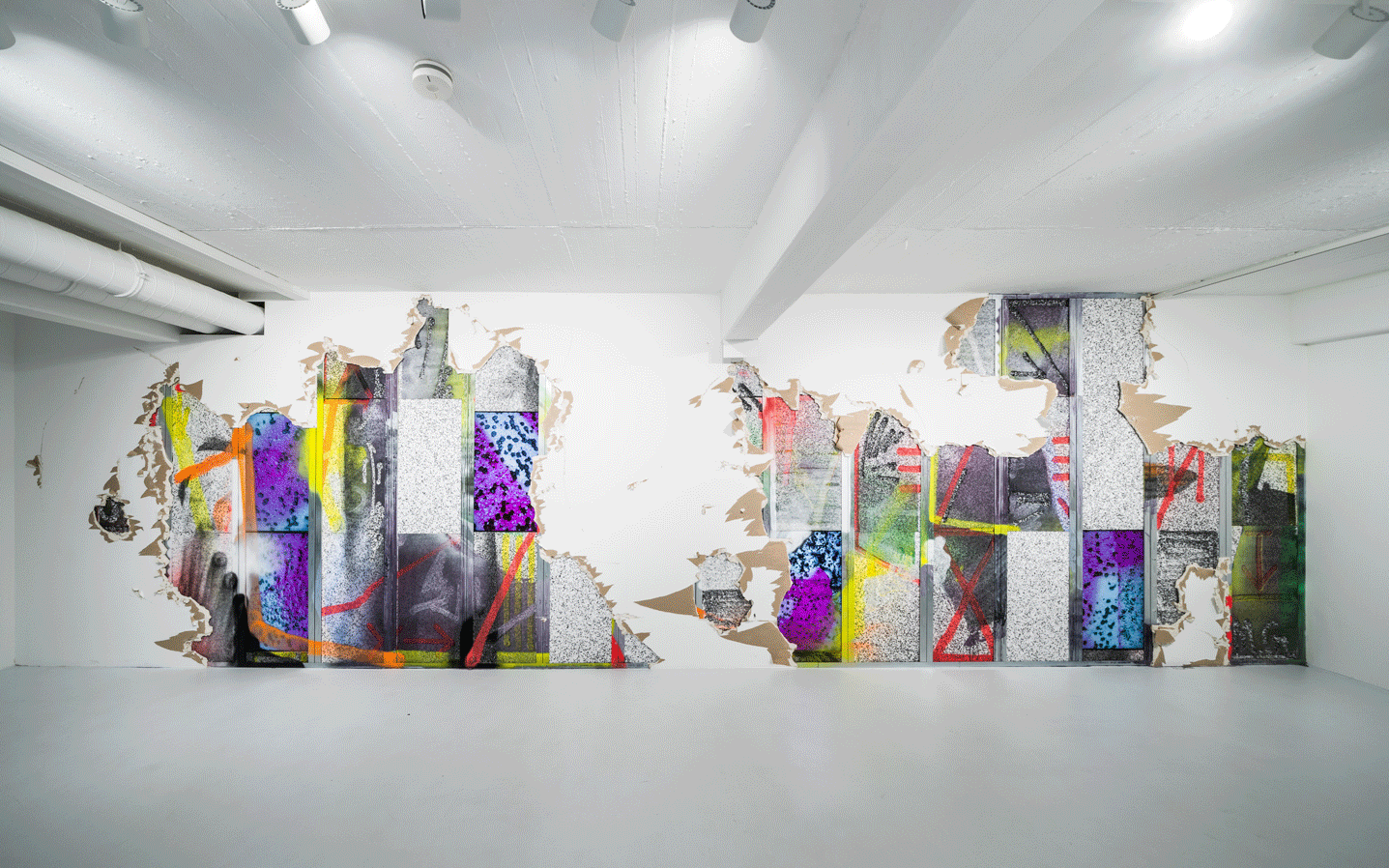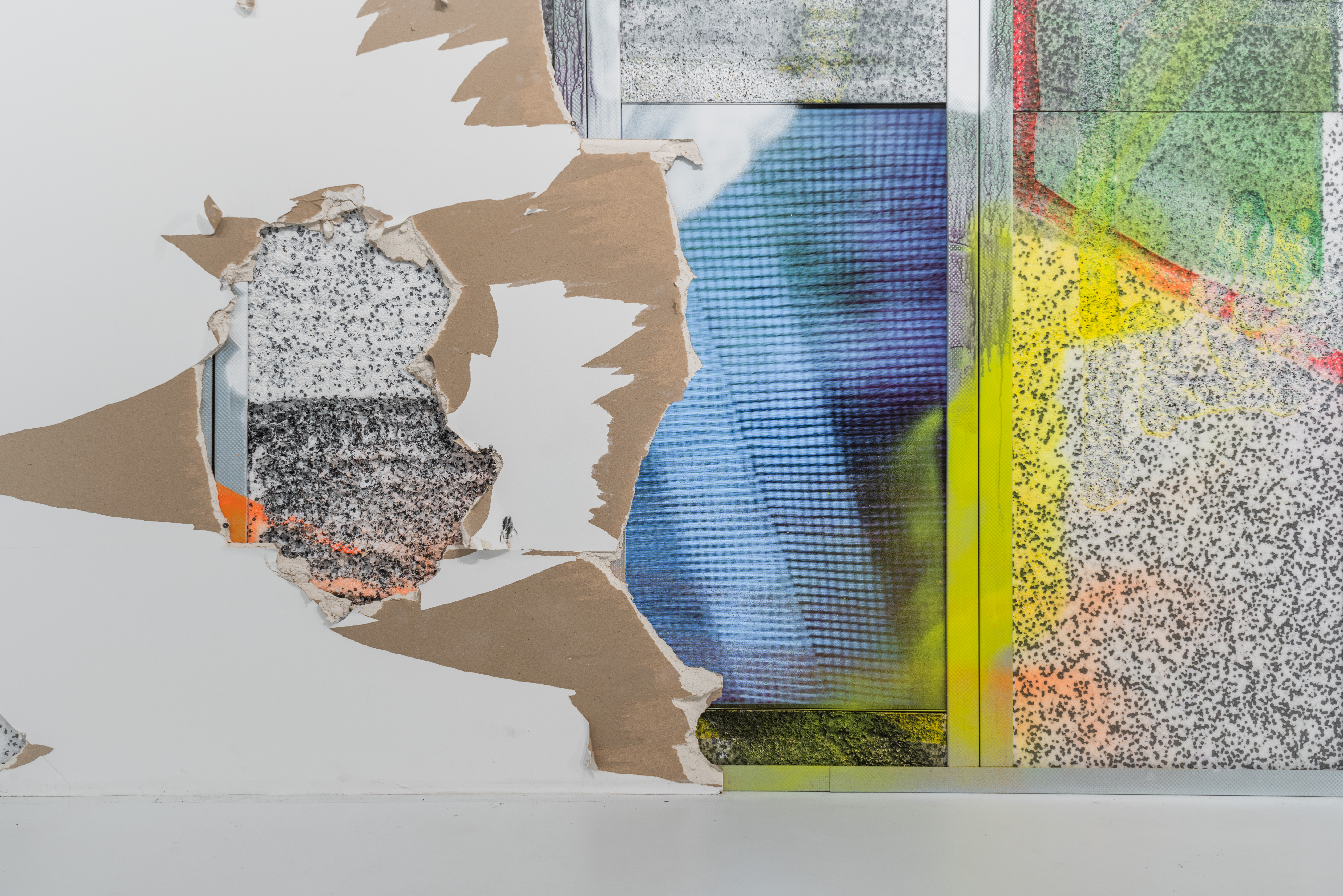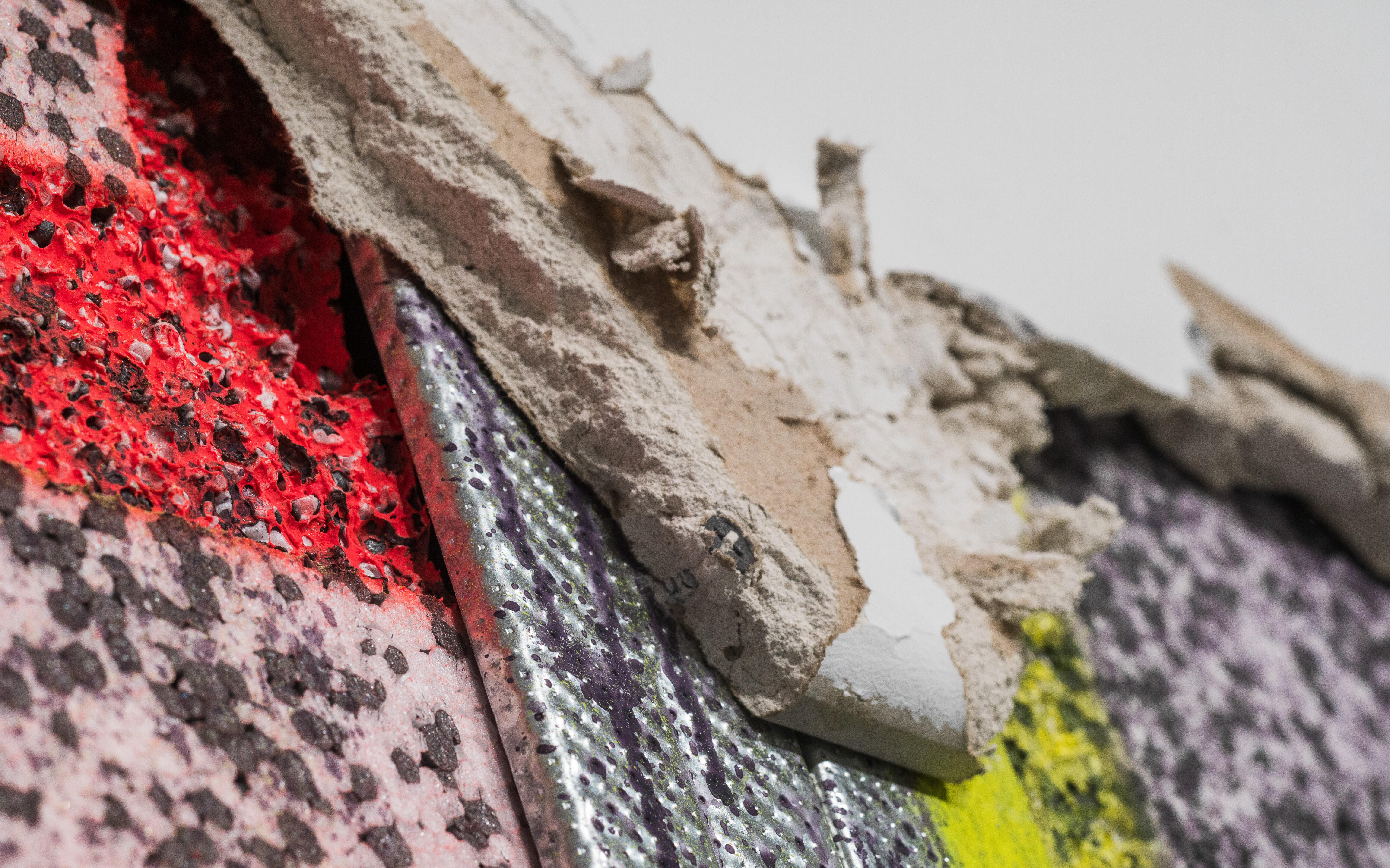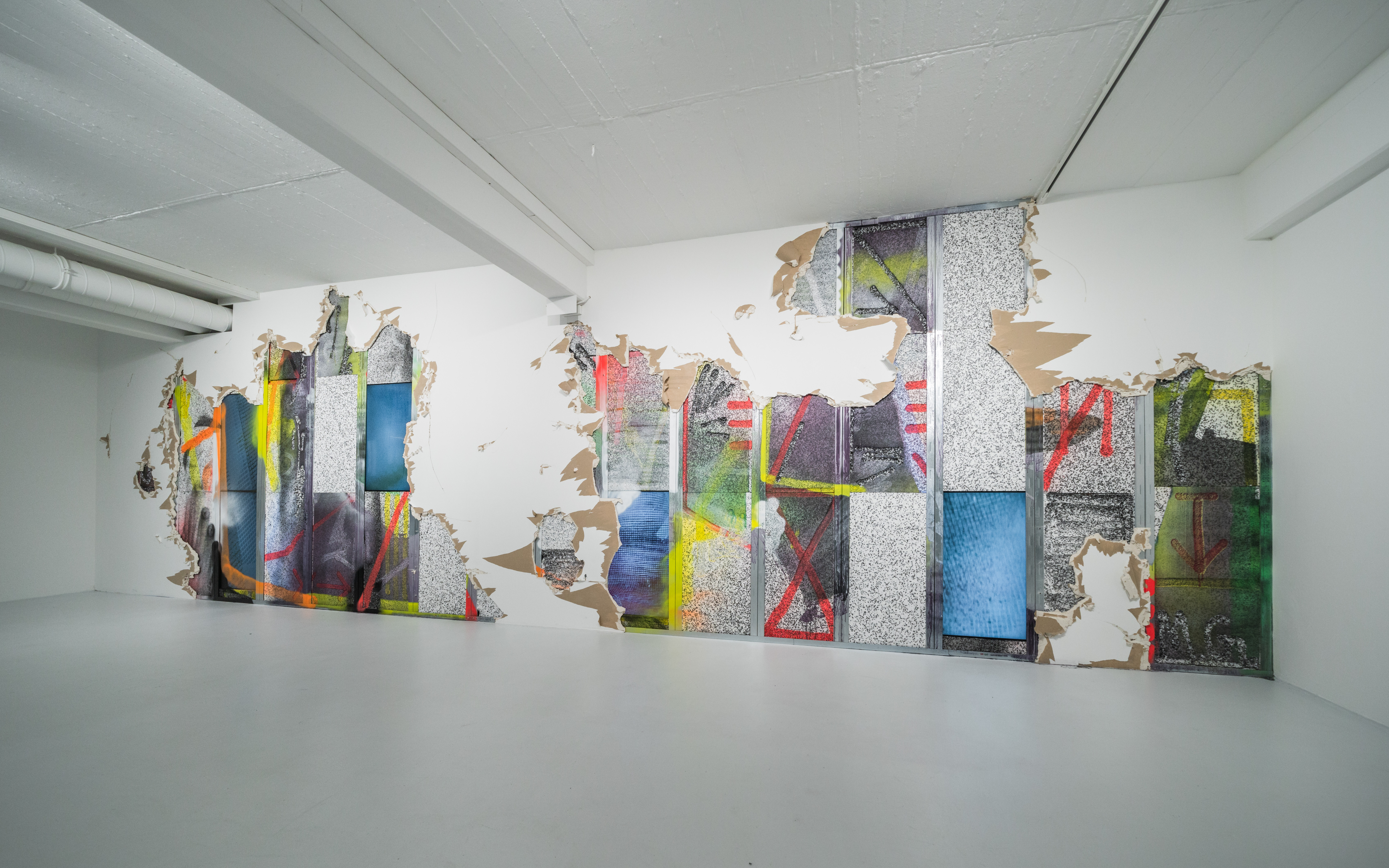 In his artistic practice, Max Geisler is always guided by personal visual experiences, whereby he is often fascinated by banal everyday phenomena in public space. As an artist who works analogously, he is interested in the role and production of painting in the post-digital age. In addition, he creates site-specific spatial installations that present themselves to the viewer as walk-in pictorial spaces. Here, a controlled act of destruction merges with an intuitively controlled painting process and culminates in a kind of frozen snapshot that, through the movement of the viewer, constantly gives new perspectives on image and color constellations. Demolished walls and insulating material are ultimately an integral part of his painterly composition. He often creates different image levels through the additional use of reinforcement mesh.