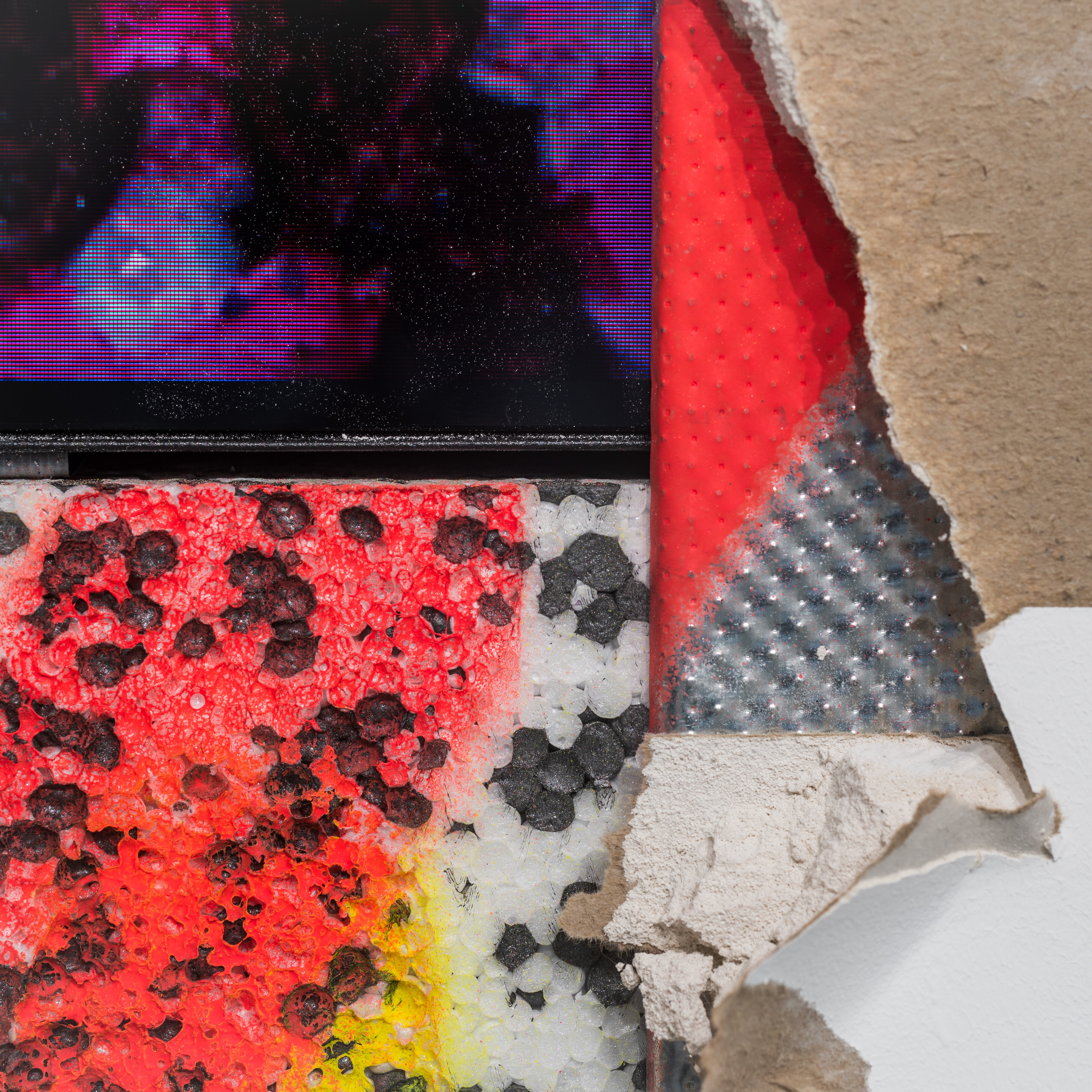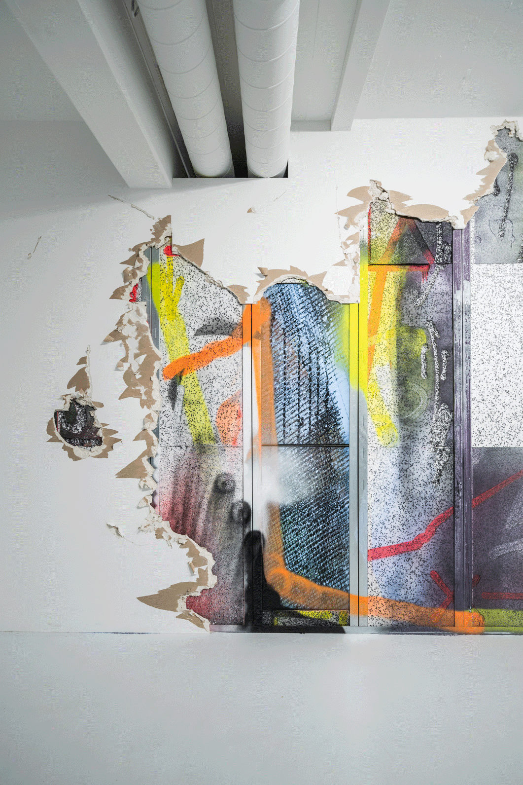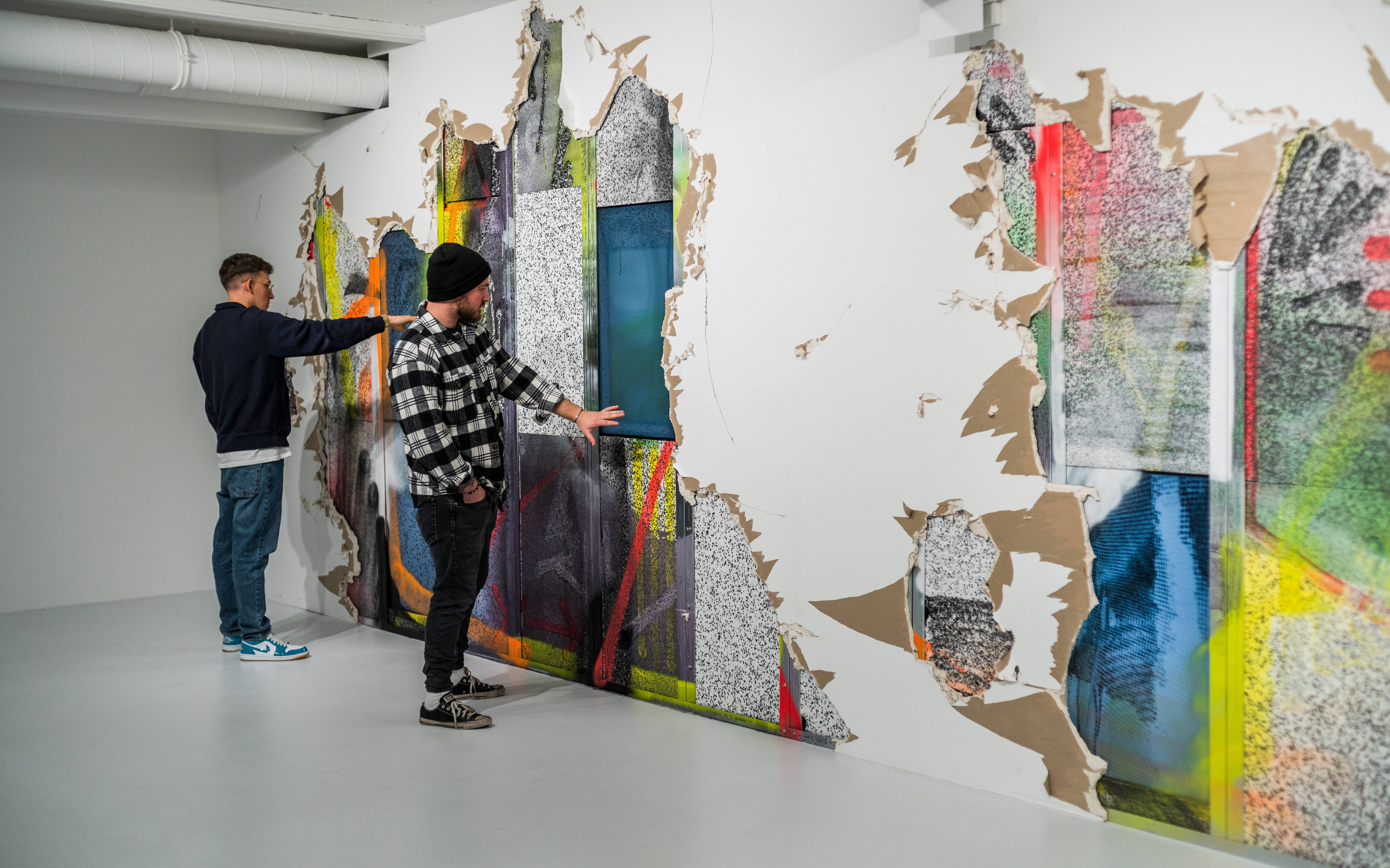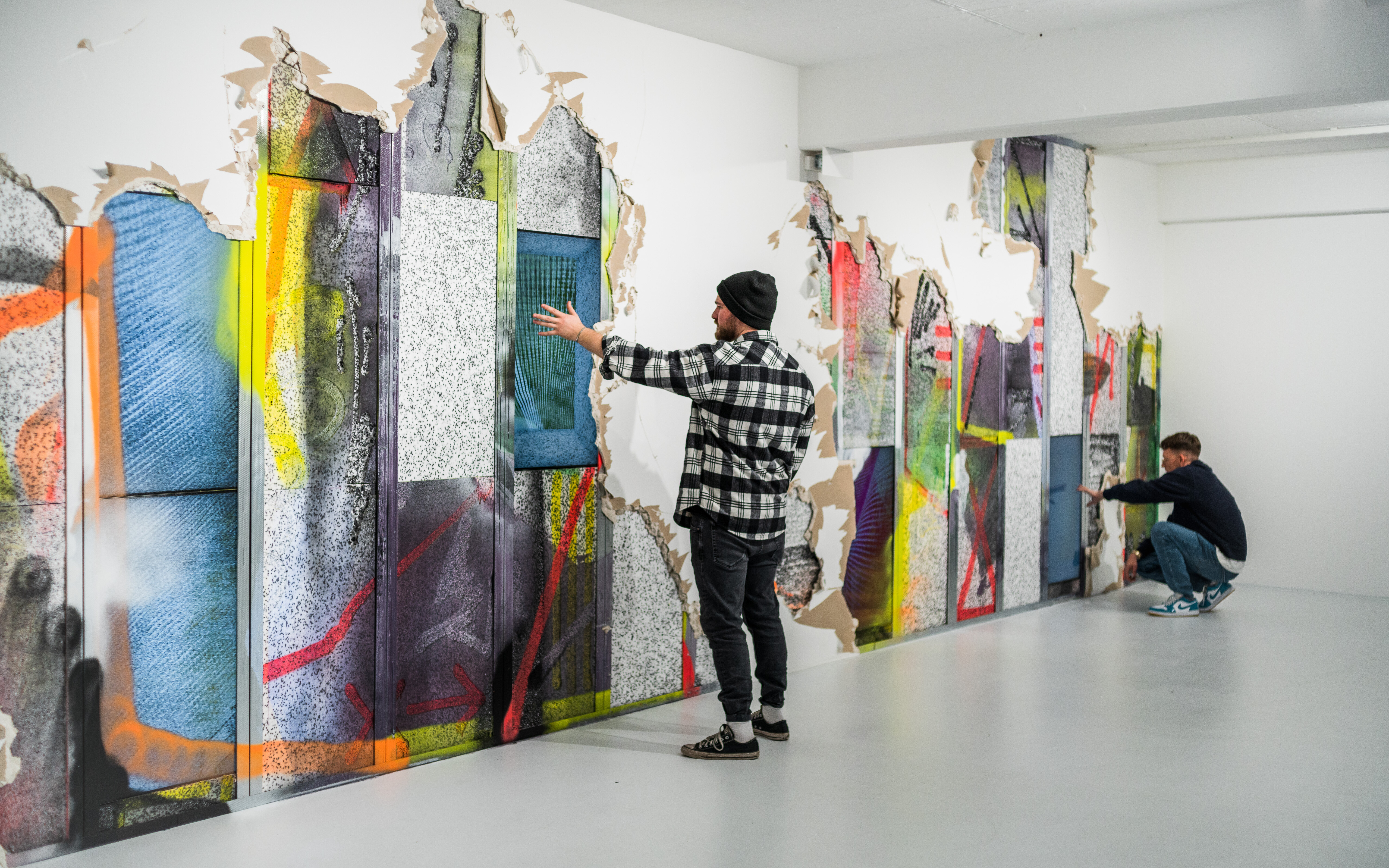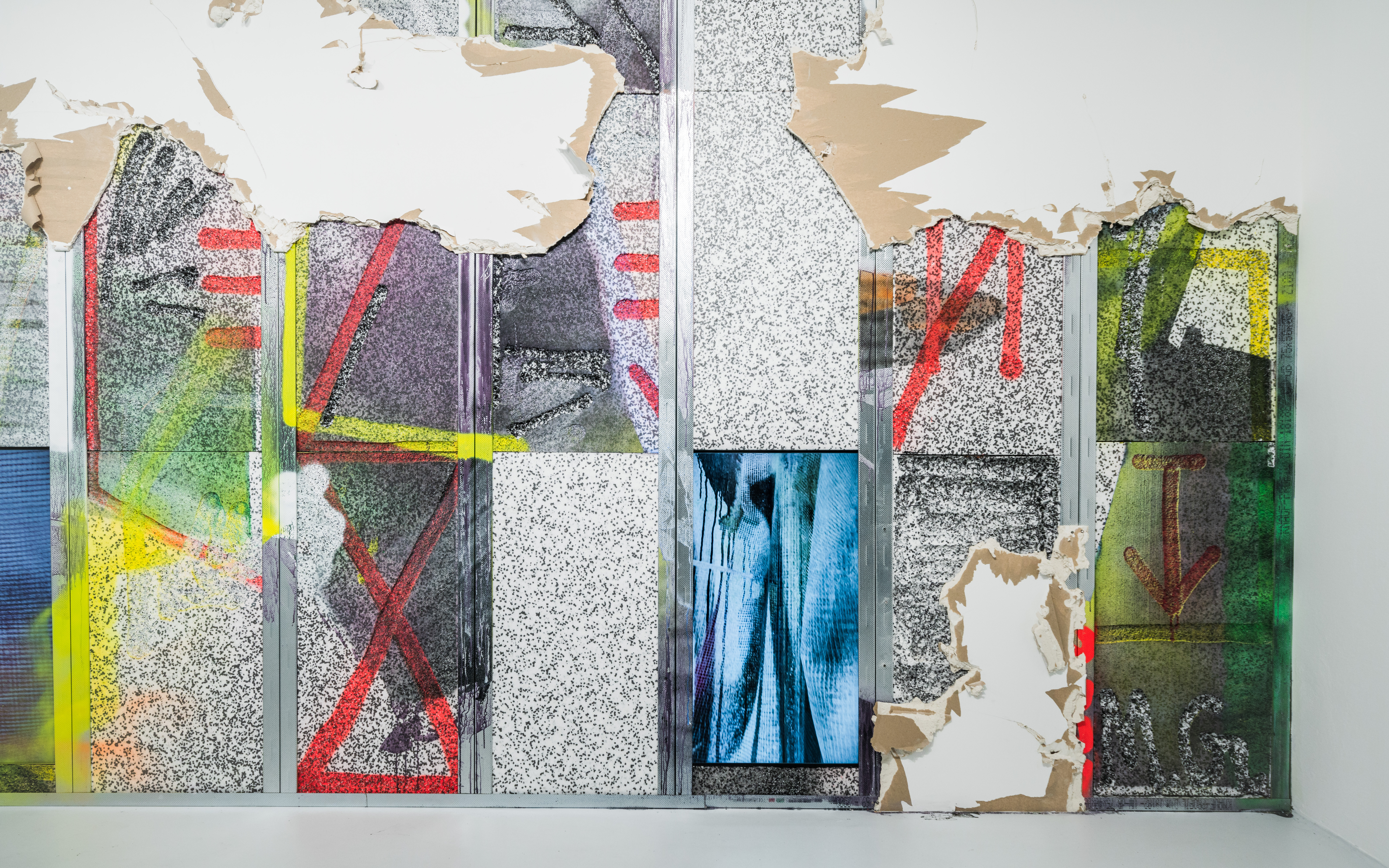 In his artistic practice, Max Geisler is always guided by personal visual experiences, whereby he is often fascinated by banal everyday phenomena in public space. As an artist who works analogously, he is interested in the role and production of painting in the post-digital age. In addition, he creates site-specific spatial installations that present themselves to the viewer as walk-in pictorial spaces. Here, a controlled act of destruction merges with an intuitively controlled painting process and culminates in a kind of frozen snapshot that, through the movement of the viewer, constantly gives new perspectives on image and color constellations. Demolished walls and insulating material are ultimately an integral part of his painterly composition. He often creates different image levels through the additional use of reinforcement mesh.