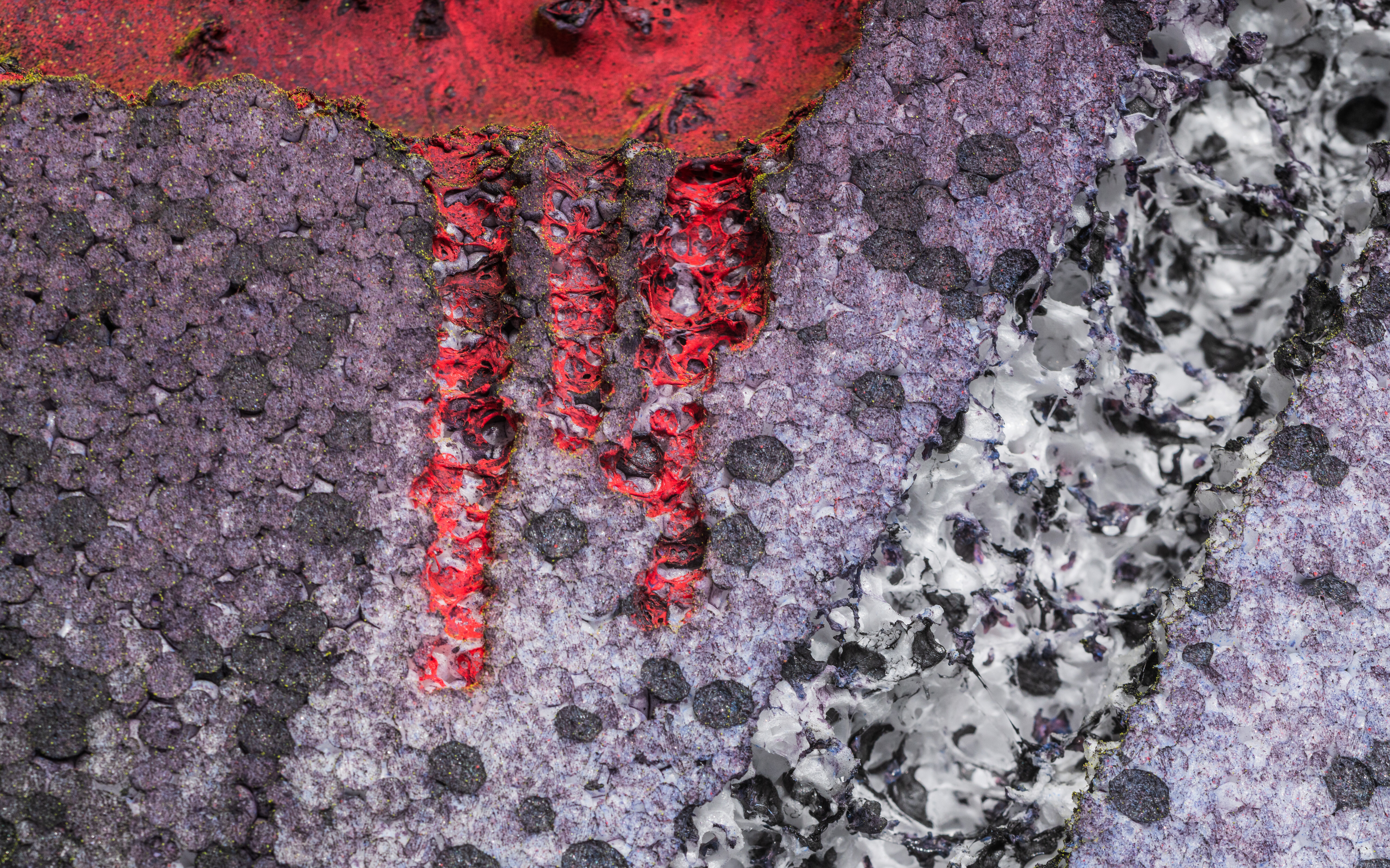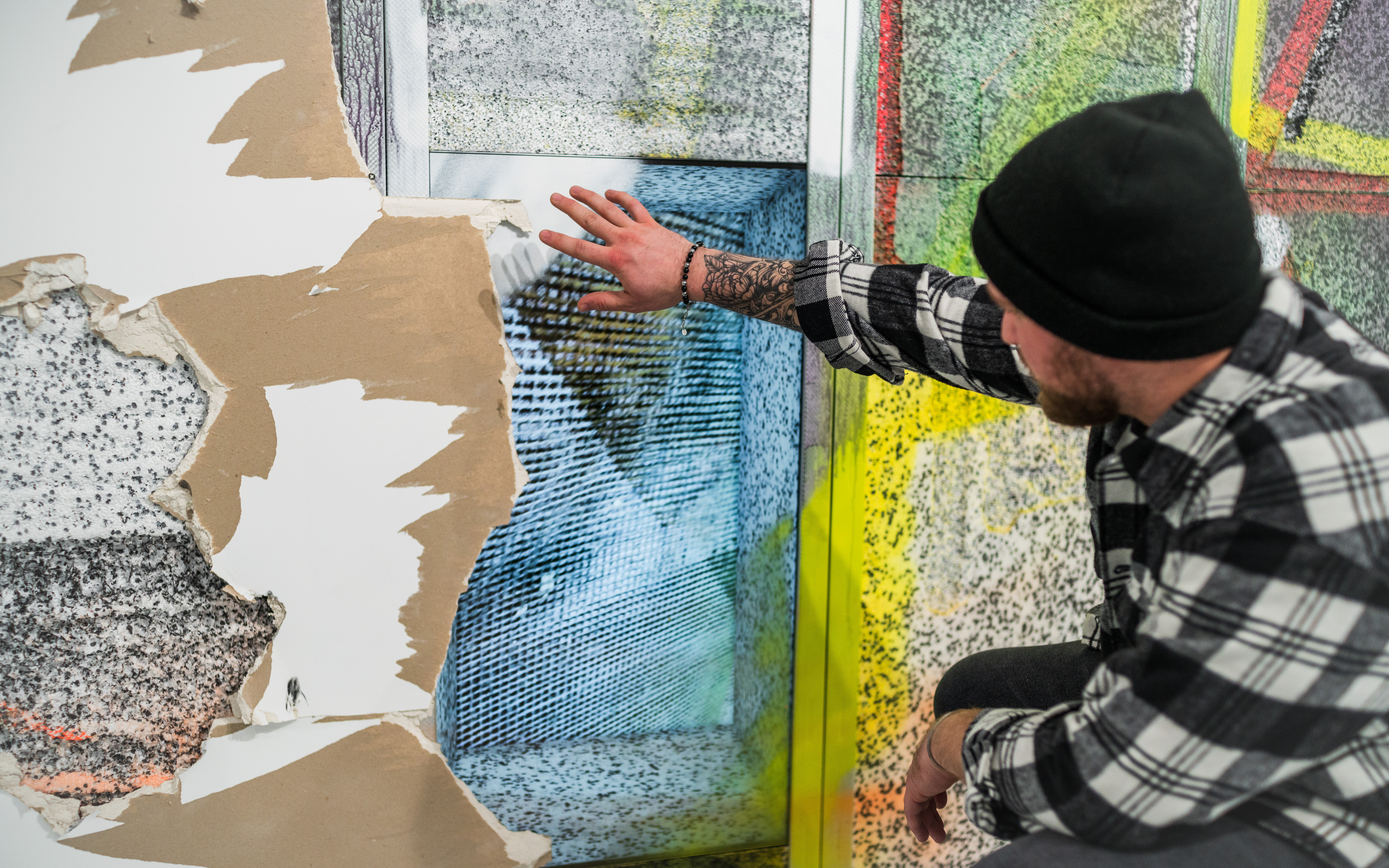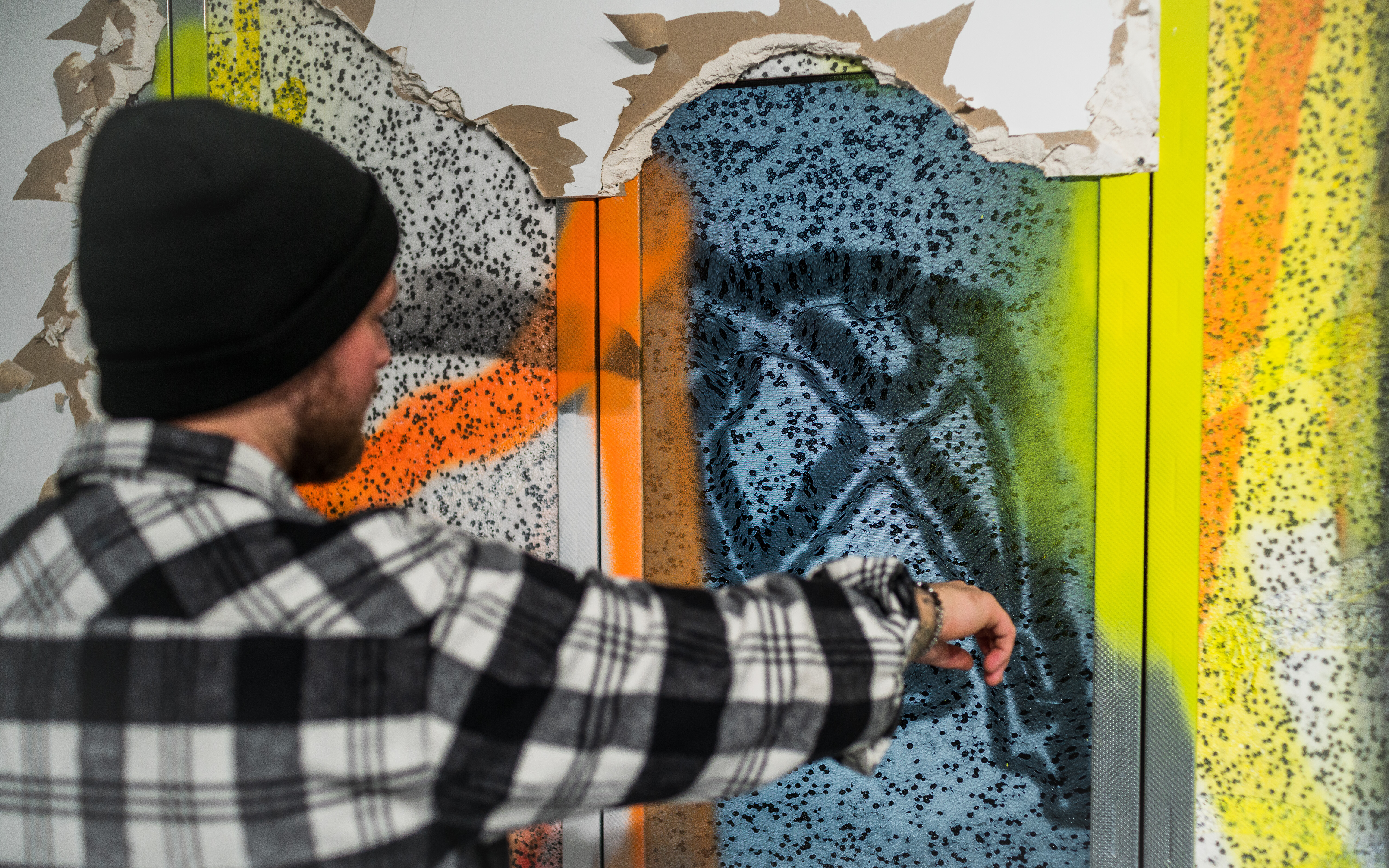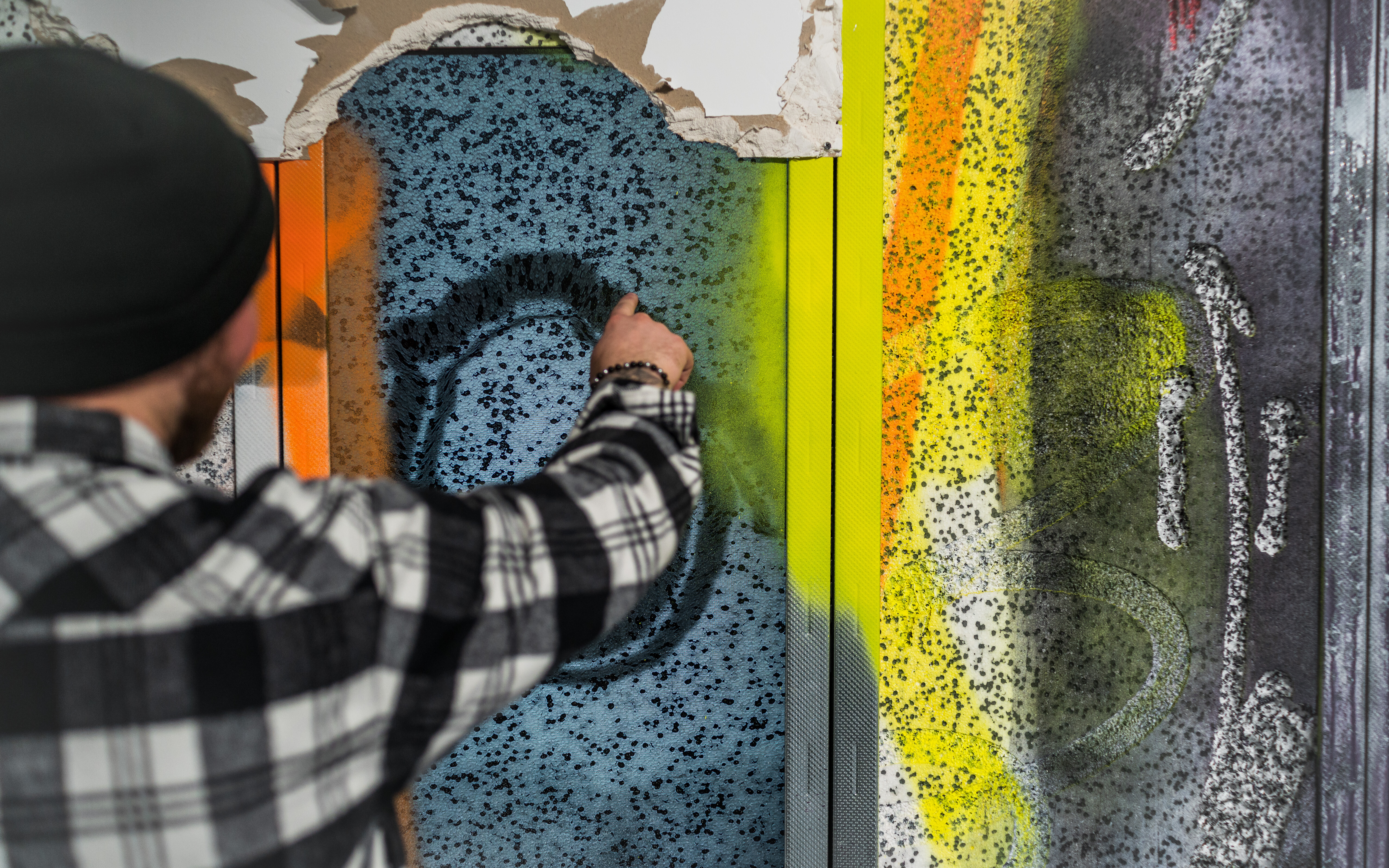 In his artistic practice, Max Geisler is always guided by personal visual experiences, whereby he is often fascinated by banal everyday phenomena in public space. As an artist who works analogously, he is interested in the role and production of painting in the post-digital age. In addition, he creates site-specific spatial installations that present themselves to the viewer as walk-in pictorial spaces. Here, a controlled act of destruction merges with an intuitively controlled painting process and culminates in a kind of frozen snapshot that, through the movement of the viewer, constantly gives new perspectives on image and color constellations. Demolished walls and insulating material are ultimately an integral part of his painterly composition. He often creates different image levels through the additional use of reinforcement mesh.