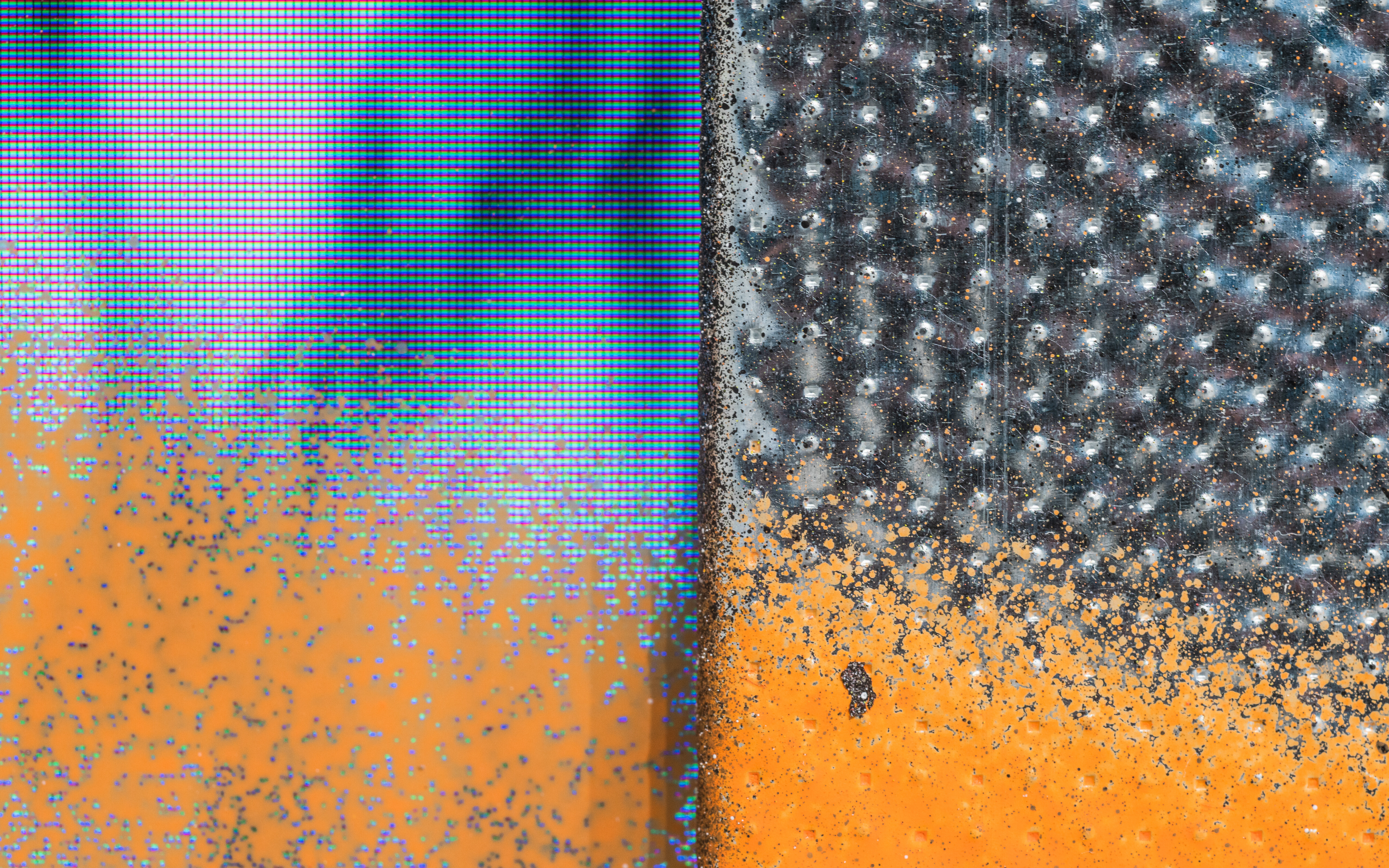 For the imprfct space, he uses exactly these generated image levels. The superimposition of wall and reinforcement fabric creates a moiré-like flickering in his works, which is reminiscent of an analogue materialization of those image disturbances that appear as glitches in digital image processing.