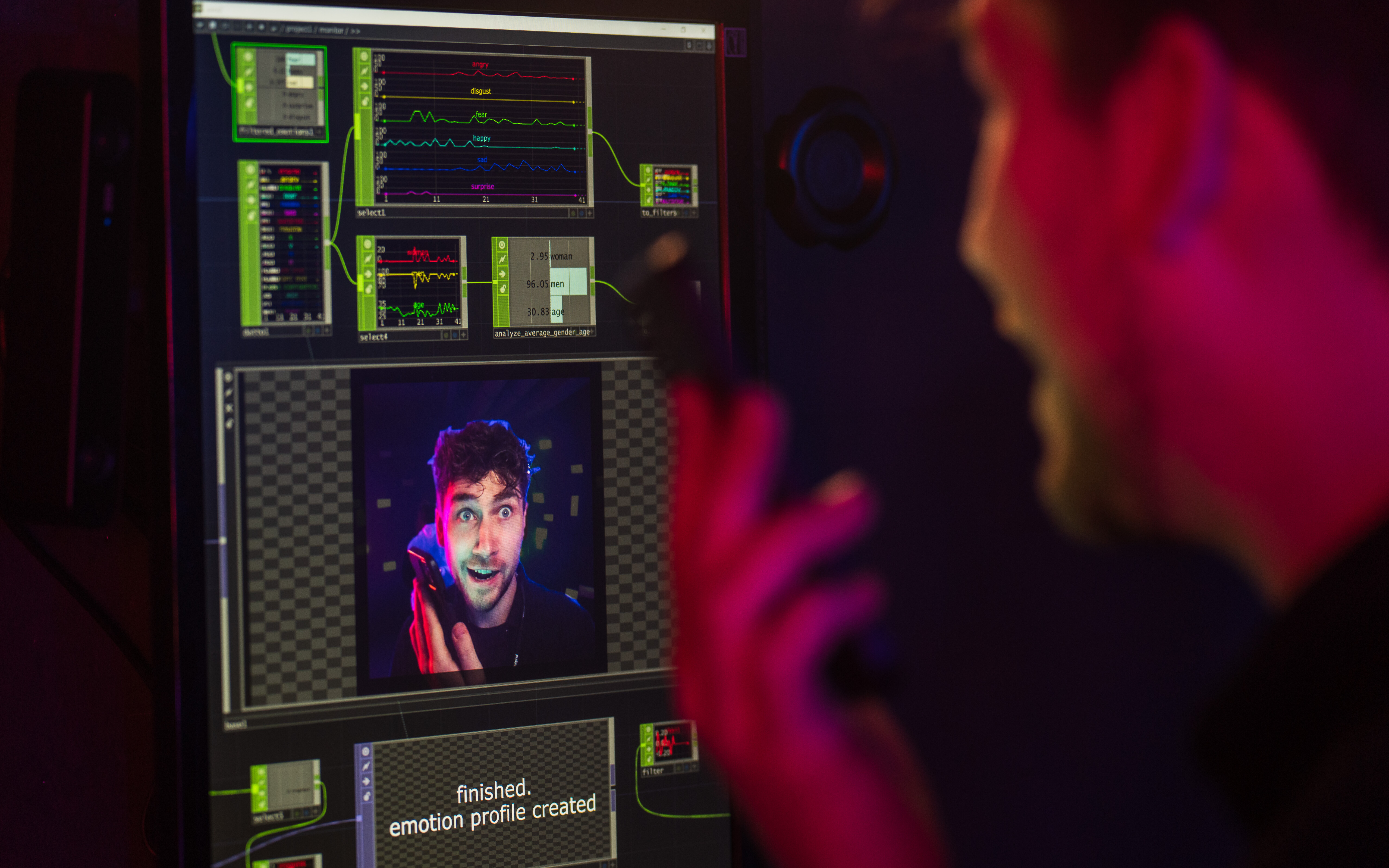 For the installation in the imprfct space, reference was made to Wolfram Gruss' enthusiasm for the reciprocal relationship between sound and image as well as emotionality. The aim was to translate a direct connection between these components into a holistic experience. In this context, the approach to bringing them together is based on the emotions of visitors to the imprfct space: These very emotions are recorded individually by installed cameras, assigned to the visitors and interpreted by AI tools. This results in emotion profiles that lead to real-time generated sound and light effects in the space, bringing it immersively to life.