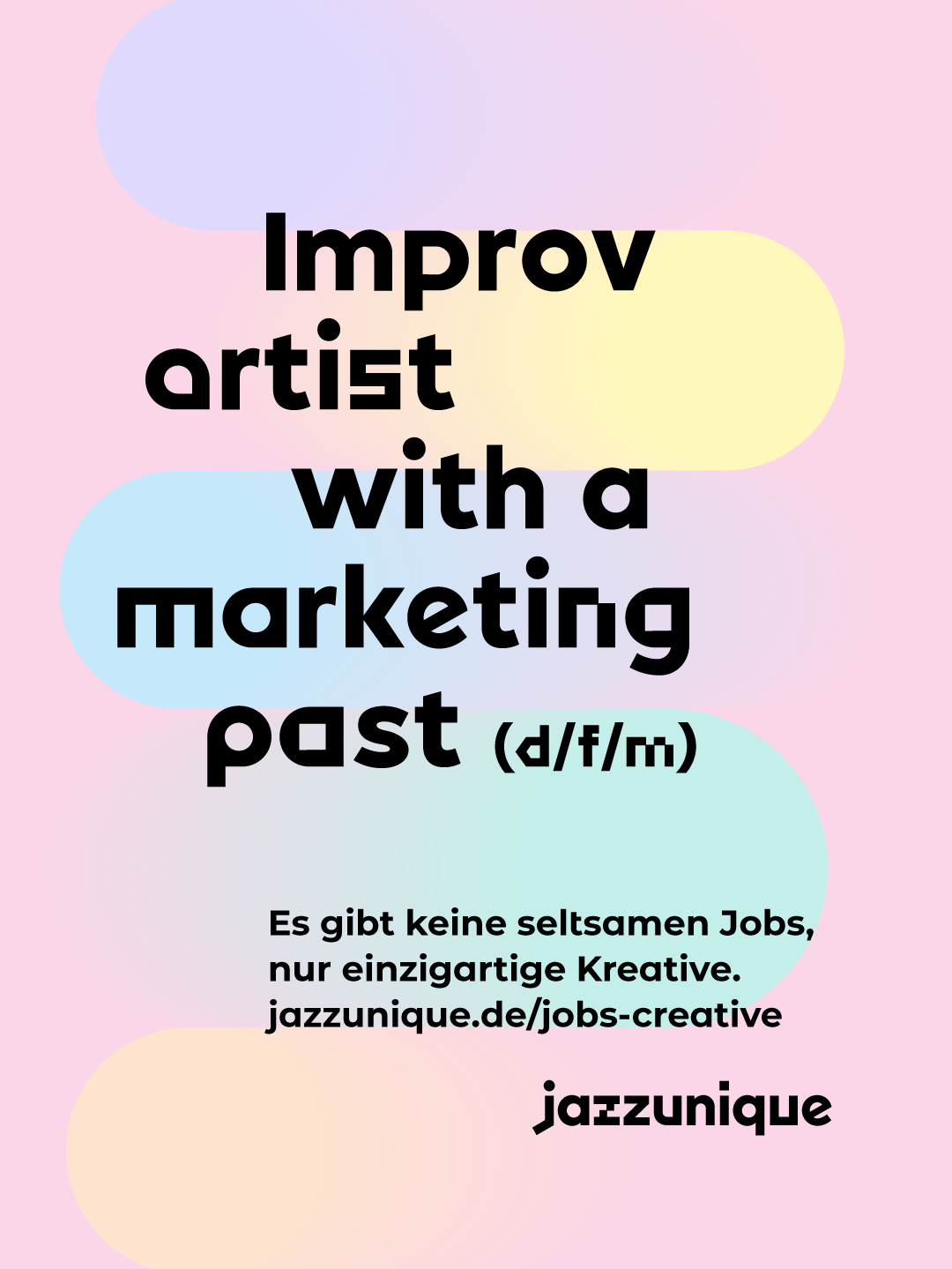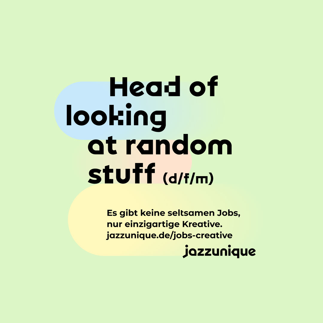 Deswegen sind wir immer auf der Suche nach tollen Kreativen, die unser Team ergänzen. Ob als "Creative expert with a normal sized ego", "Improv artist with a marketing past", "Head of looking at random stuff", als "Manager of lost ideas" oder als "Eccentric with a PPT kink" - wir sind der Meinung dass es keine seltsamen Jobs sondern nur einzigartige Kreative gibt!
