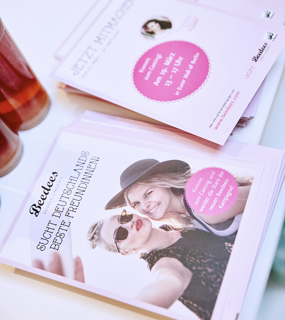 For almost two weeks our generally macho concept developers put themselves in the woman's role, as they tried to invest the upcoming Beedees campaign with a sufficient dose of femininity. The objective of the project was to find two faces for the new Beedees autumn-winter 2016 collection. After a plethora of curves, pink and romance had been negotiated, we soon came to the conclusion that the young Triumph brand called for something other than a standard model election. Hence an idea emerged: Beedees in search of Germany's best girlfriends. A battle where all had equal chances was invoked - a challenge in the name of friendship. To realise this project we organised the planning and execution of the live castings in five German cities, as well as the grand finale and the associated publicity campaign.