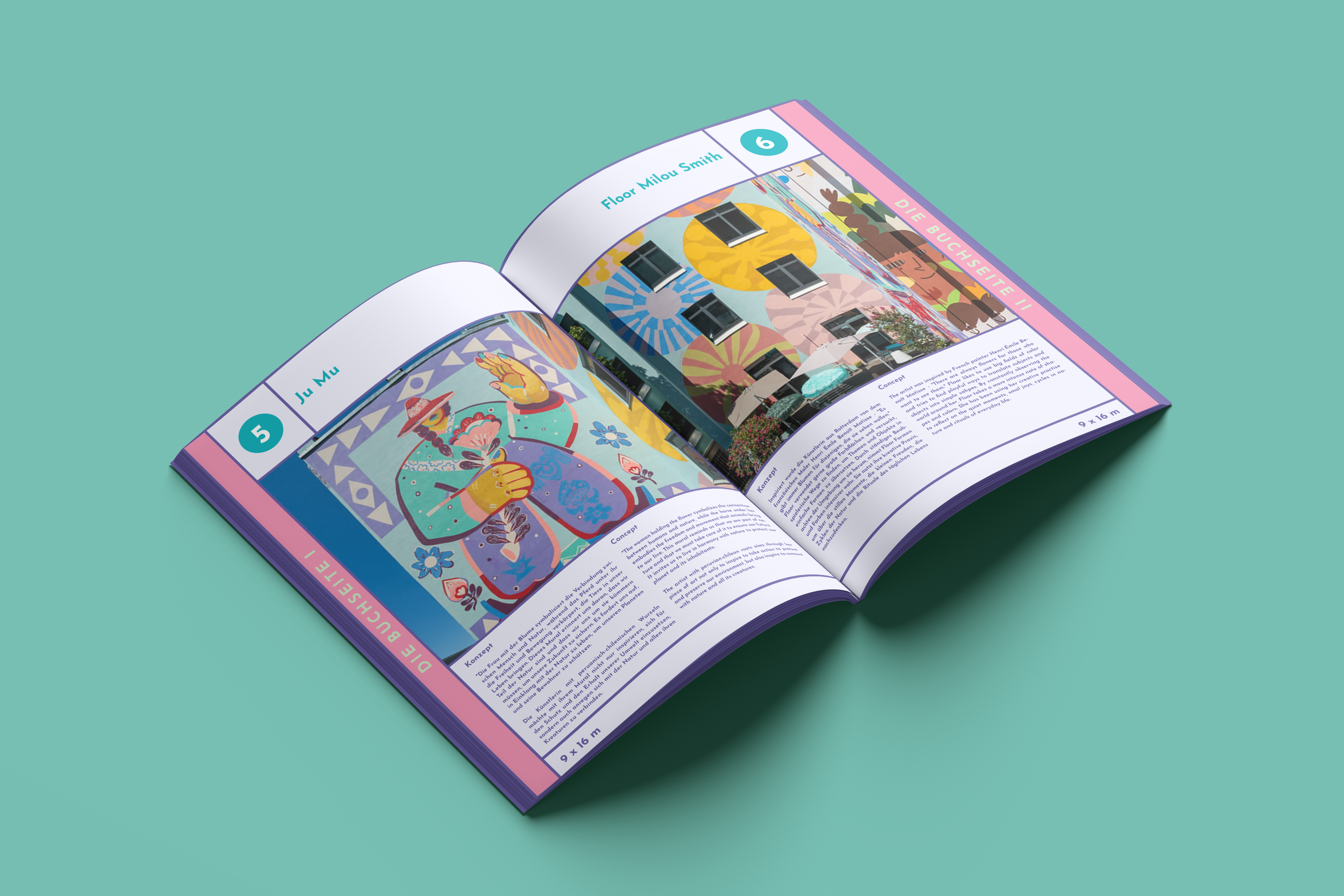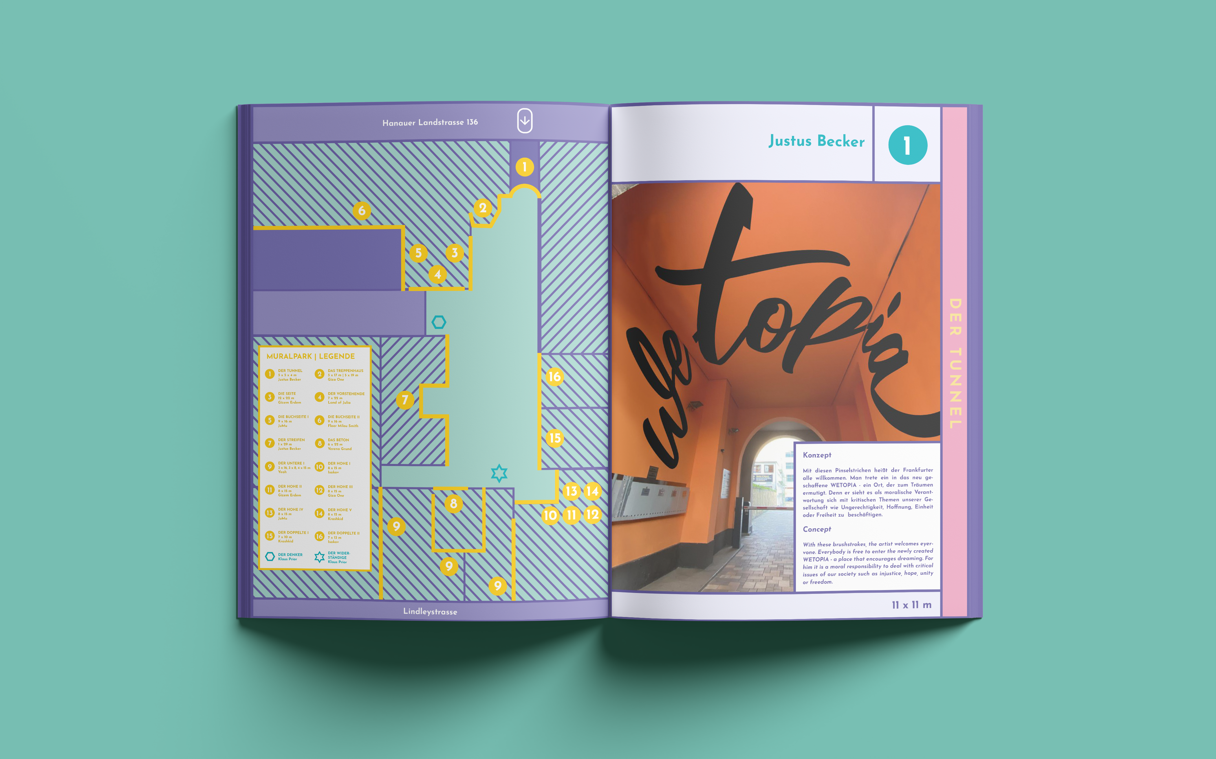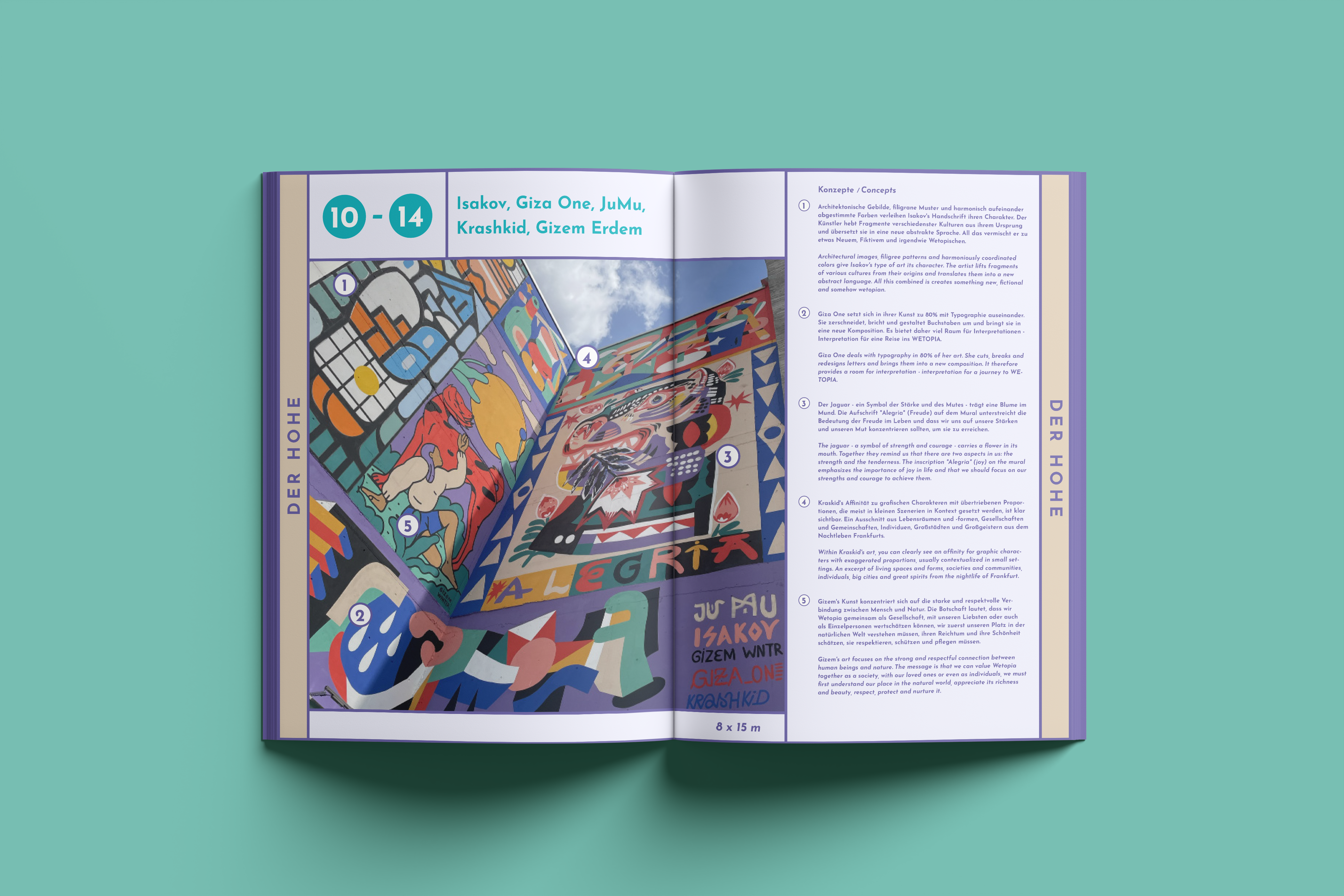 The design used focuses on the artists' murals without being too dominant. Supplemented by informative content about Wetopia as well as the artists and their murals, the result is a magazine that translates the message and aesthetics of the mural park into an appealing format.
