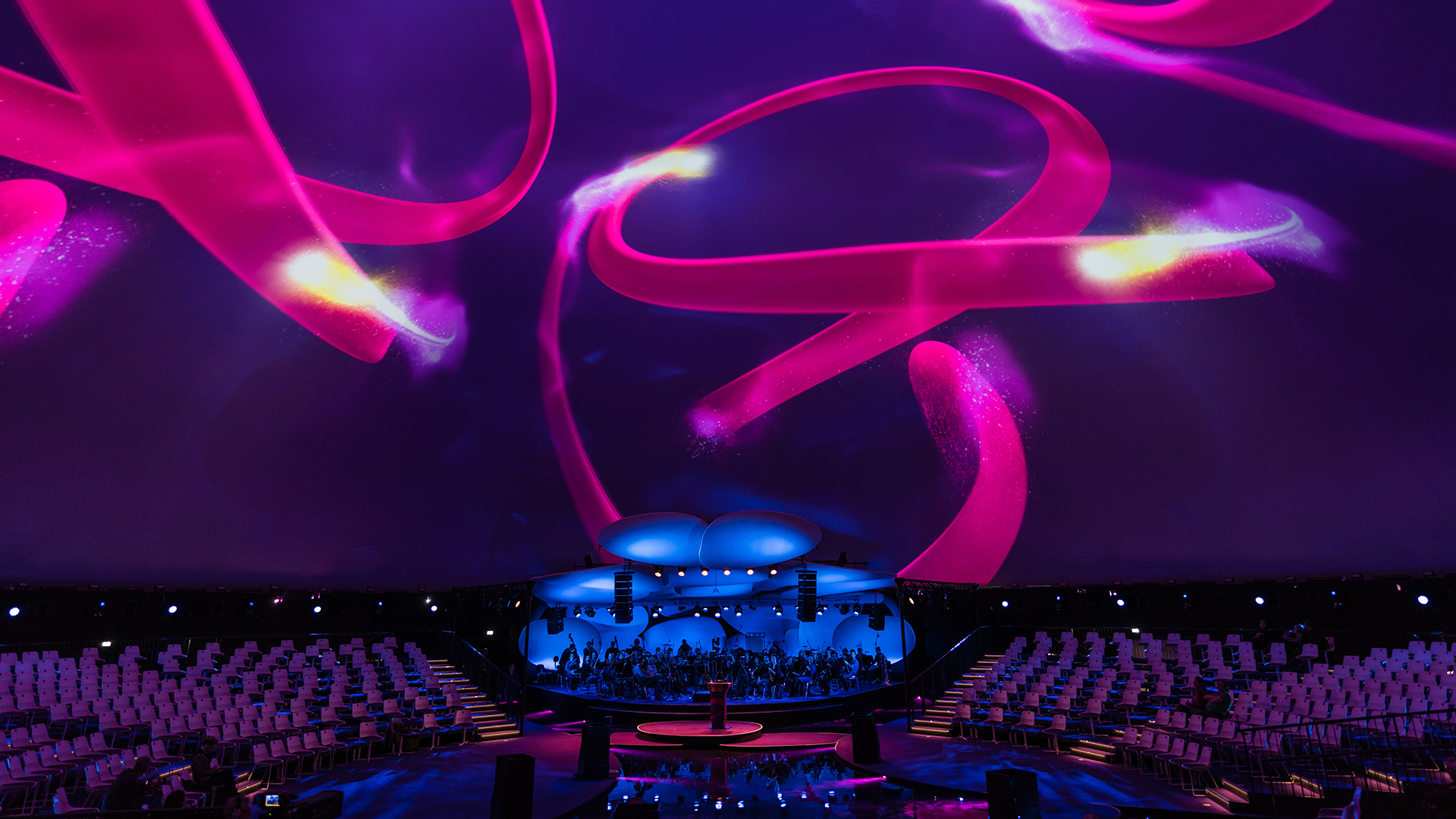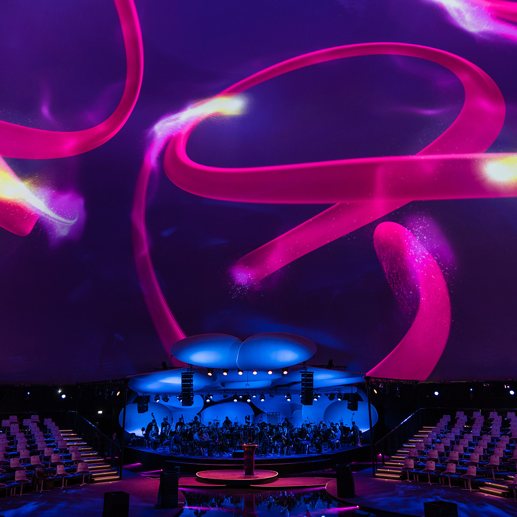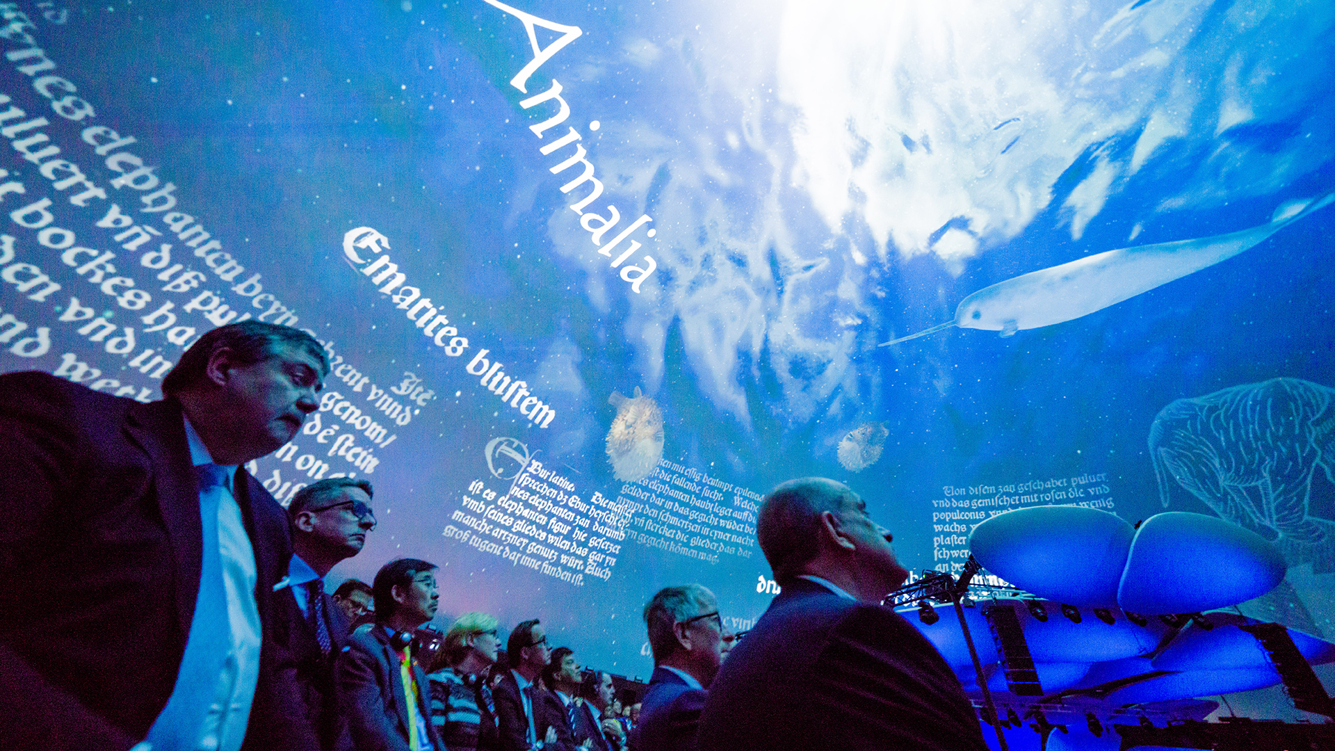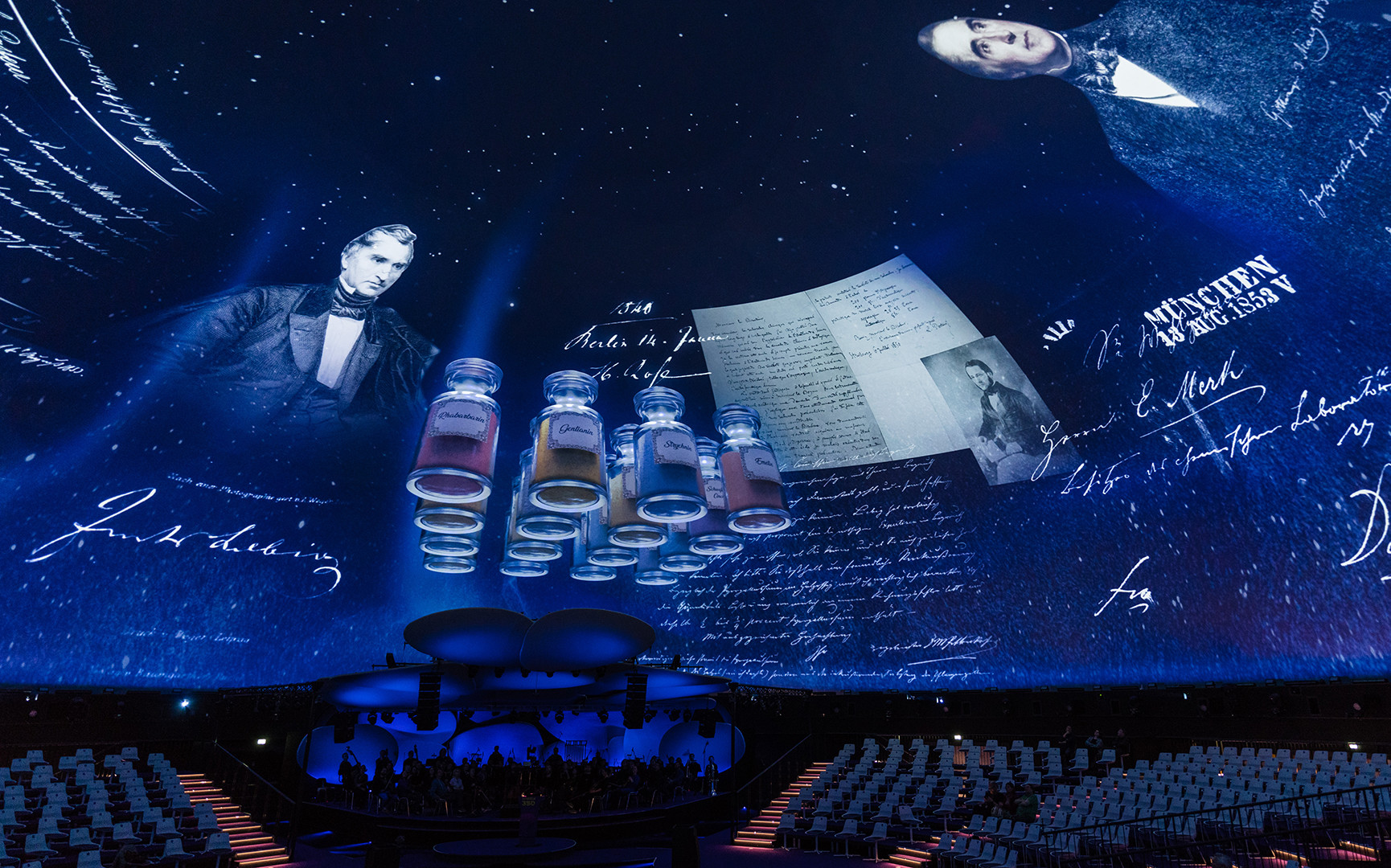 A 360 degree dome film linked significant milestones in the company's history with contemporary scientific and historical events. A water basin, which we had specially designed for the ceremony, emphasised and enlarged the central inner space and accentuated the effect of the media showings with its animated reflections.
