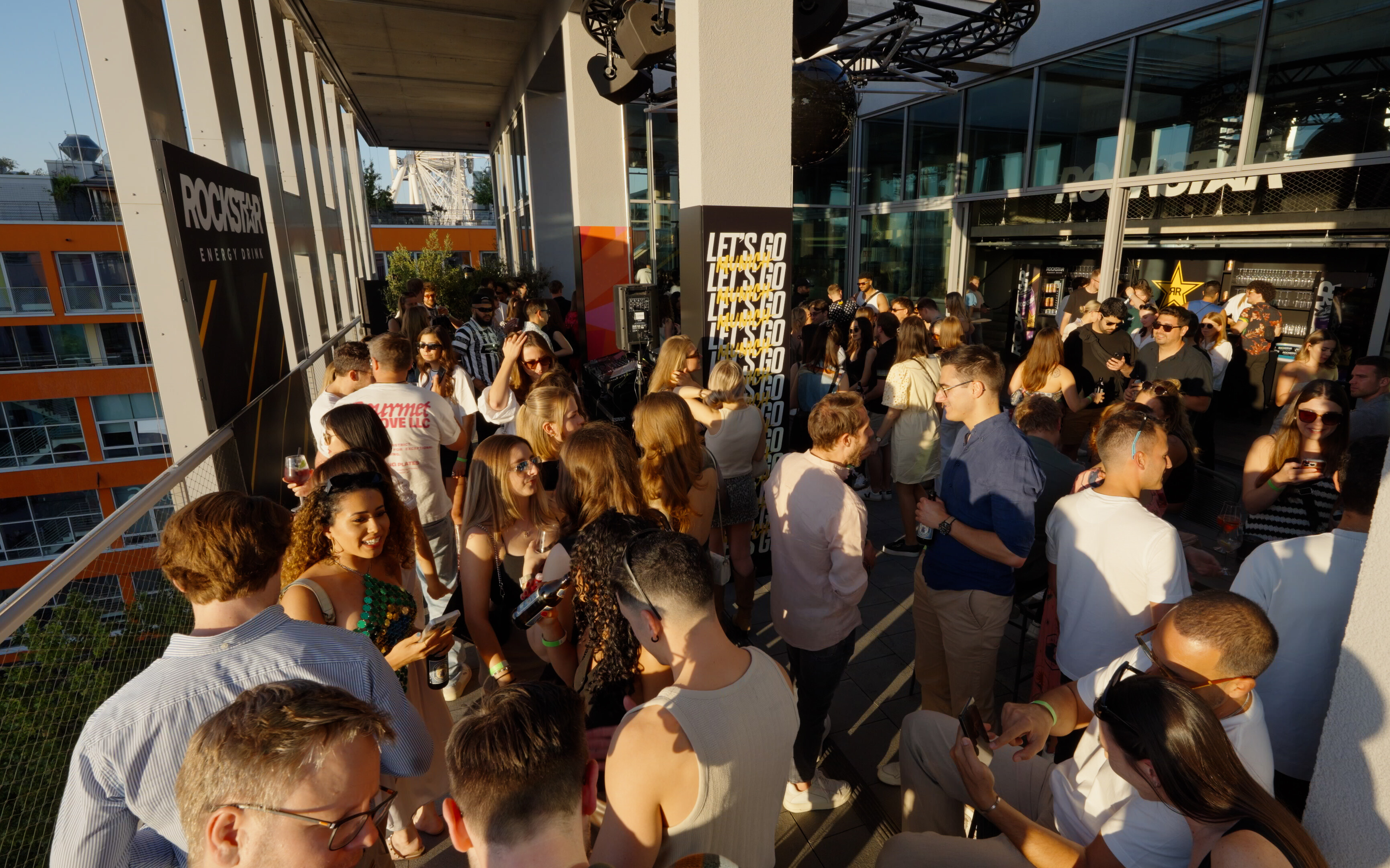 The spatial staging was based on a clear design language and atmospheric details: targeted lighting accents, a strong zoning of the area and the play with lines of sight between the rooftop, DJ set-up and city panorama. The character of the space was consciously used - selectively staged, with a clear effect in the setting. The design conveyed the energy of Rockstar Energy visibly and clearly: with contrasts, striking settings and a brand presence that extended from the bar to the DJ booth. Signature drinks, activating lighting moods and concise branding made the overall effect loud, self-confident and unmissable.