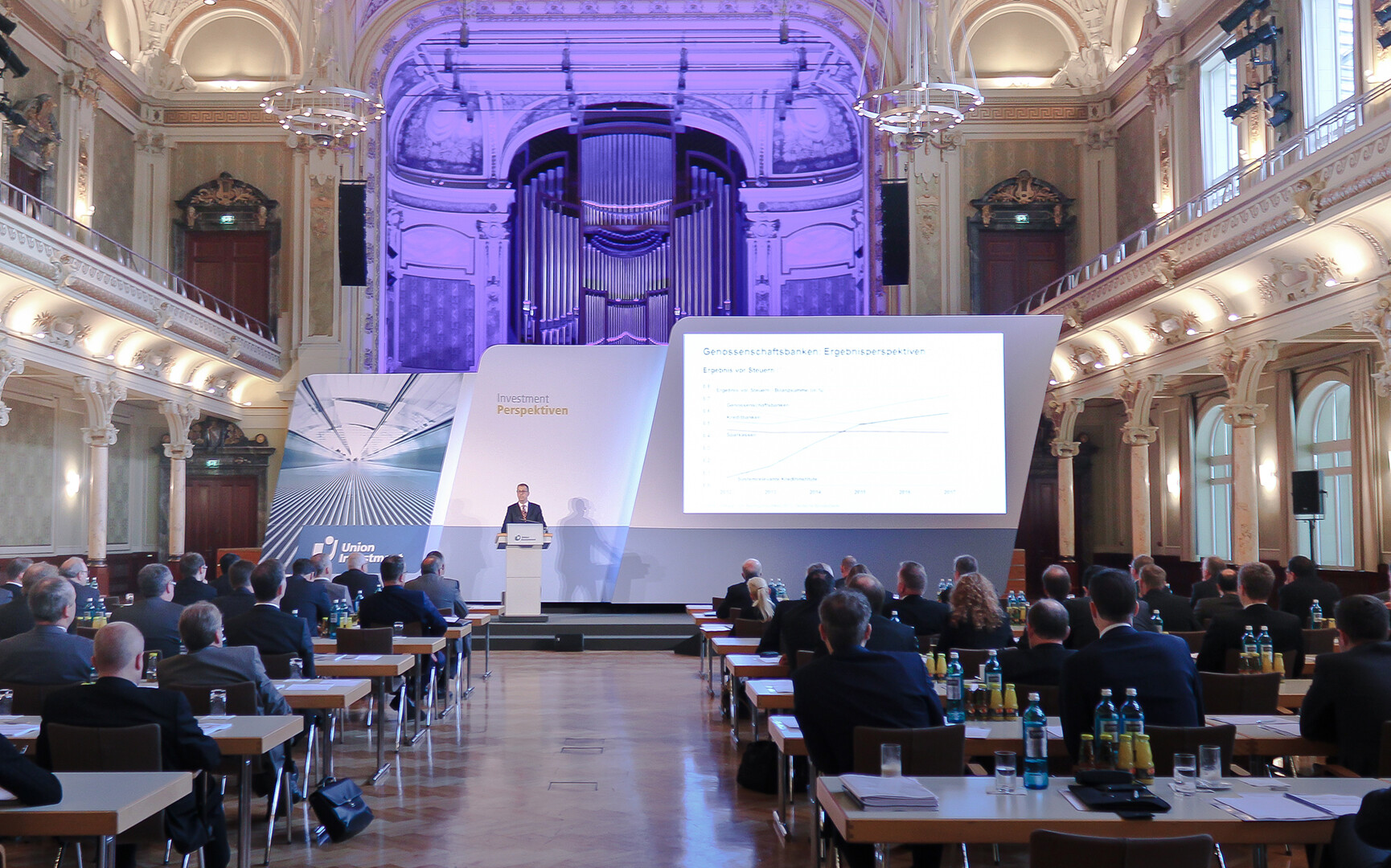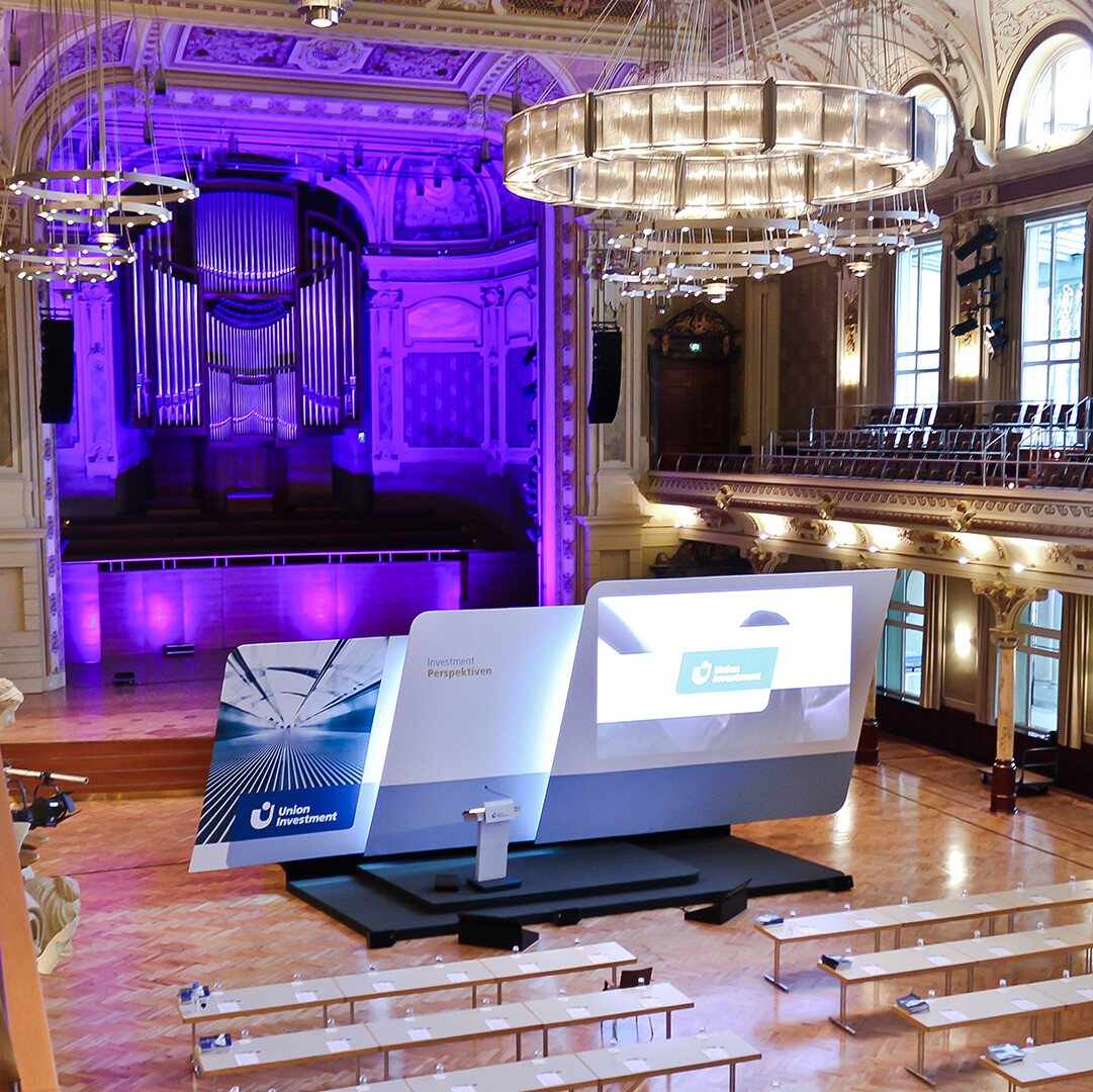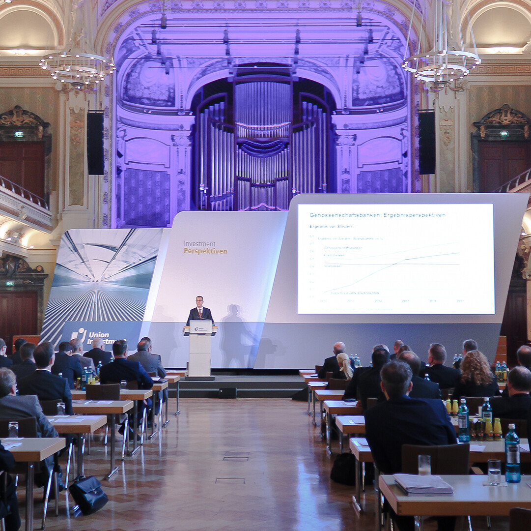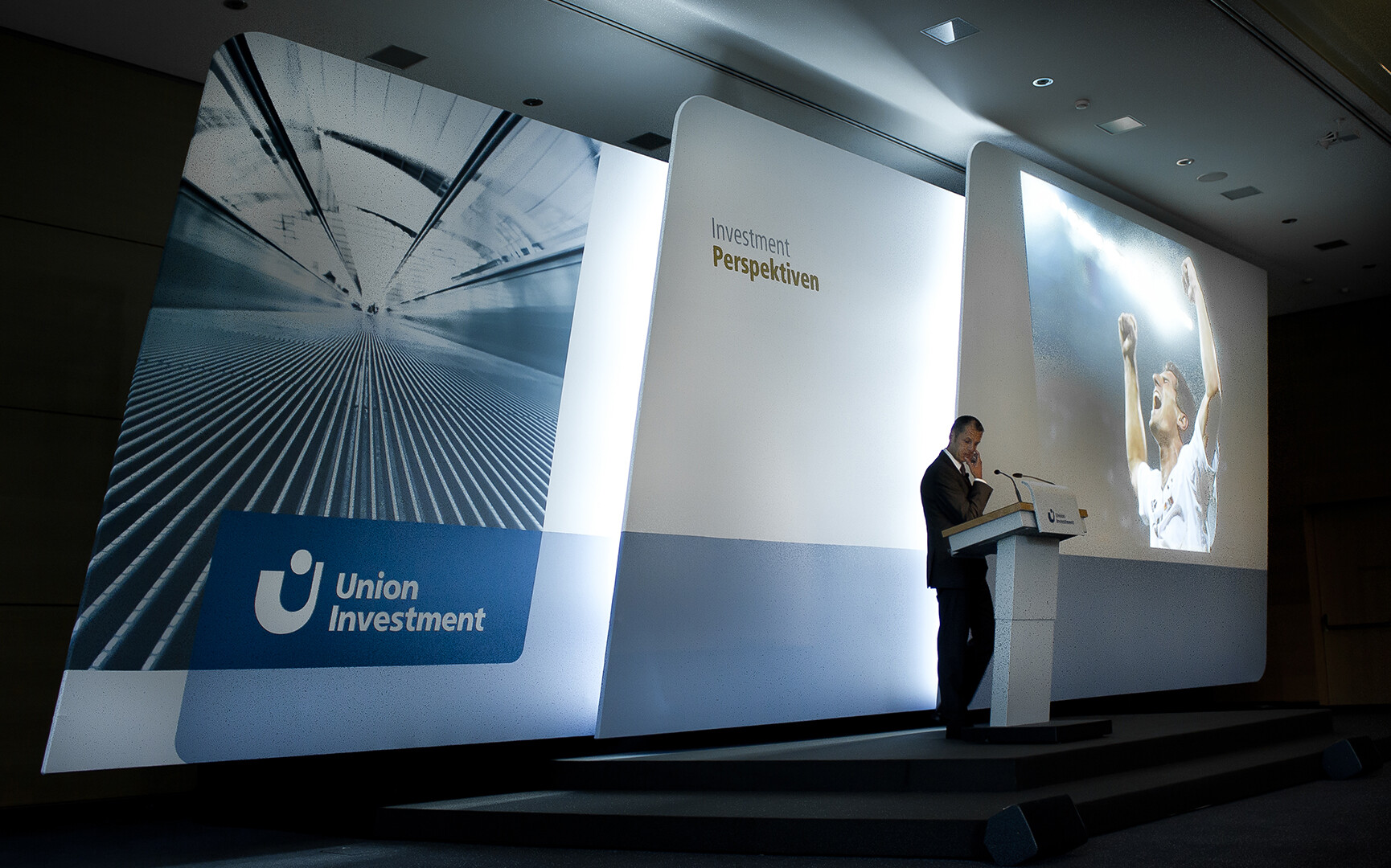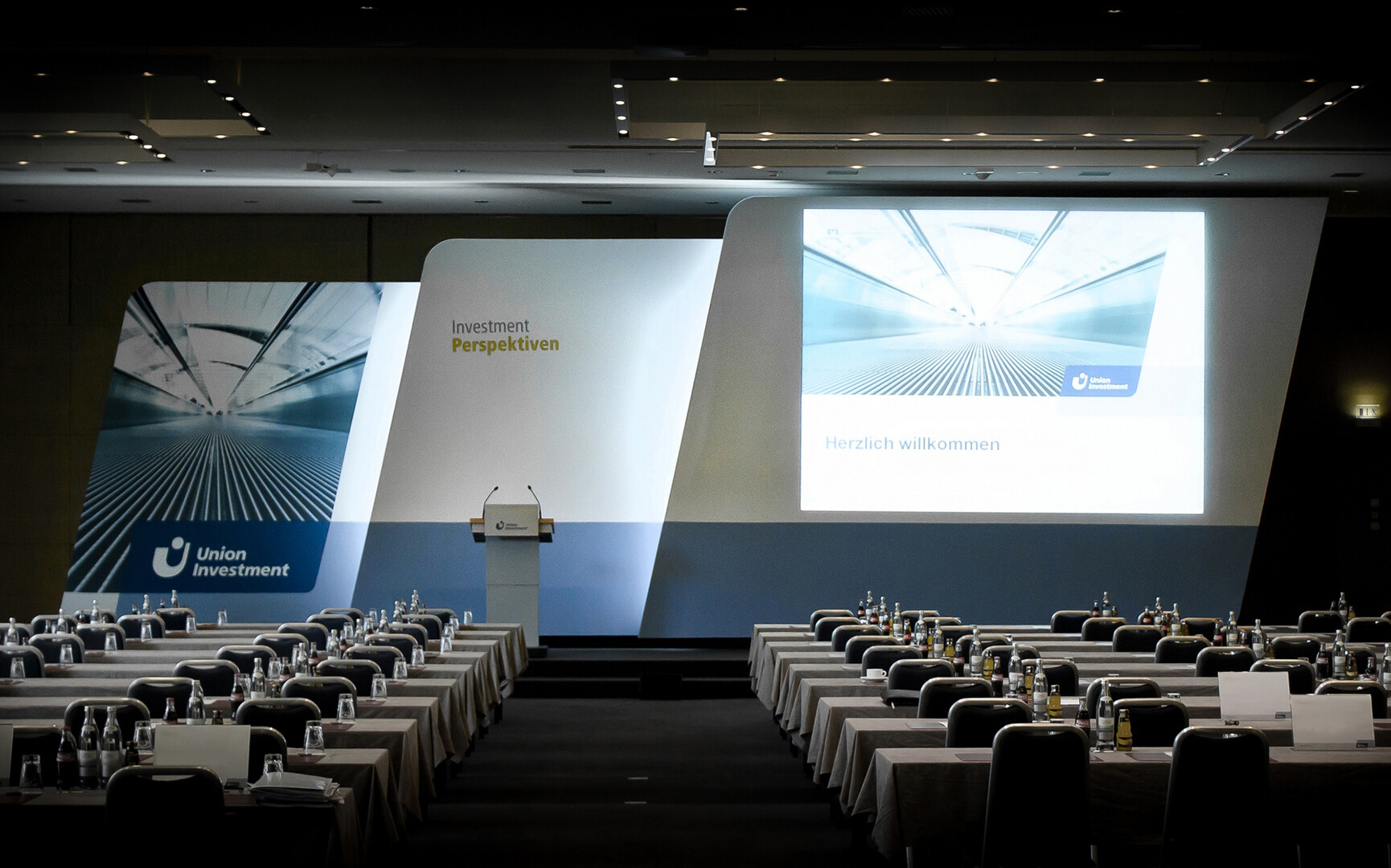 InvestmentPerspektiven", which we have successfully supported since 2012, tours ten German cities over a period of five weeks each year. Depending on the location, between 100 and 250 people attend the event. Participants are board members and managers from cooperative banks. Three 7.5-ton trucks with a team of eight employees go on the road to set up and dismantle the 12 x 5 meter stage setup, the corresponding event technology for sound, lighting and projections as well as the necessary event materials from Union Investment.