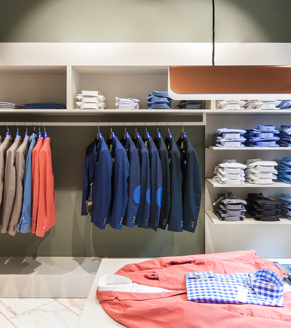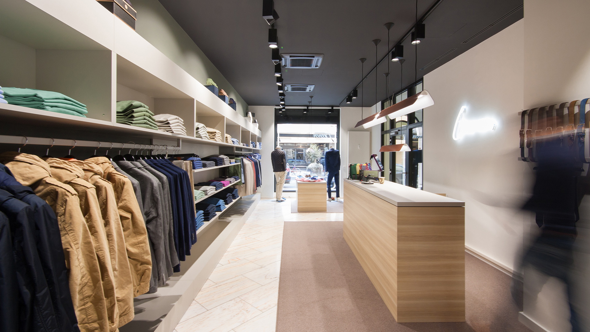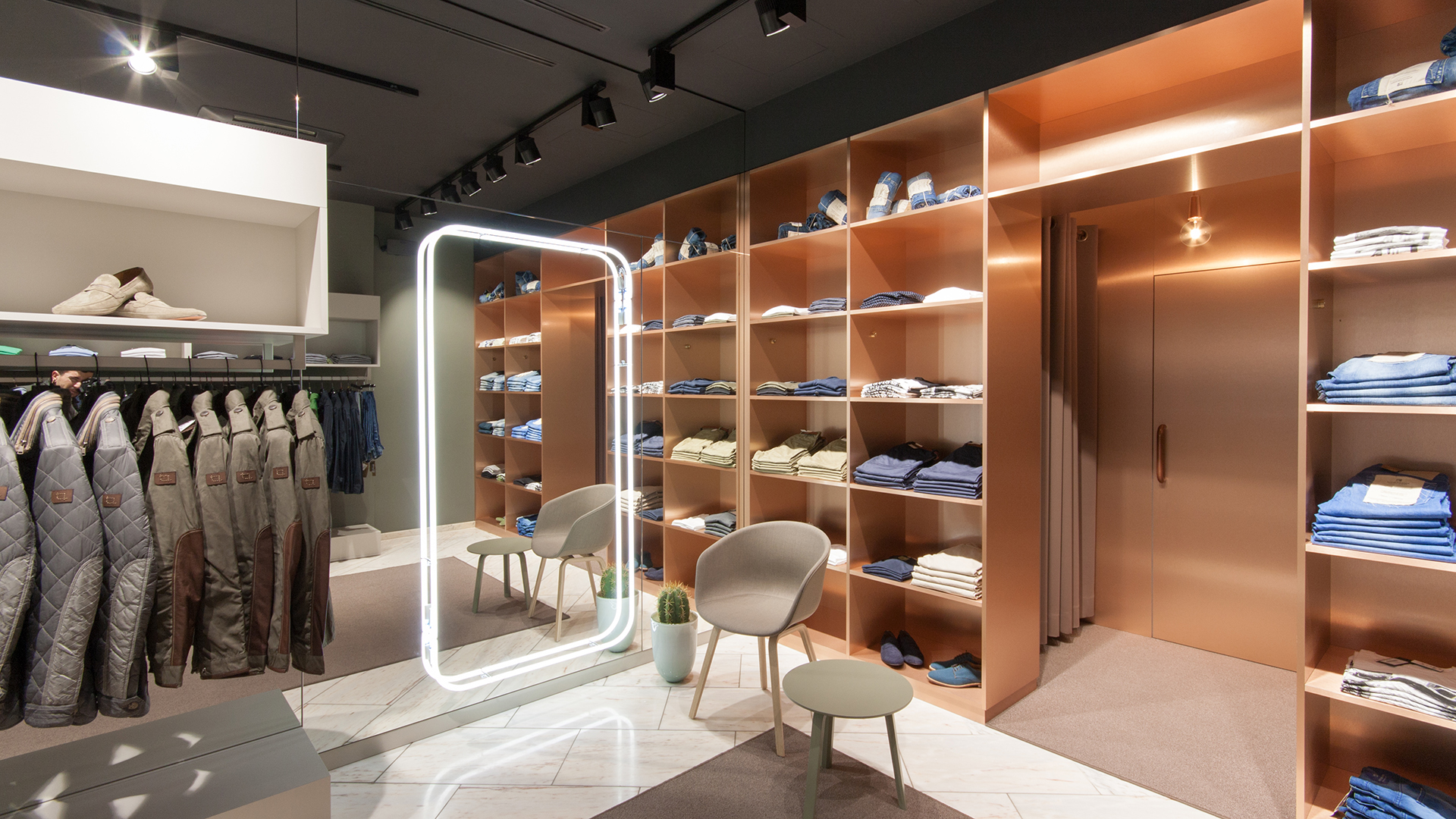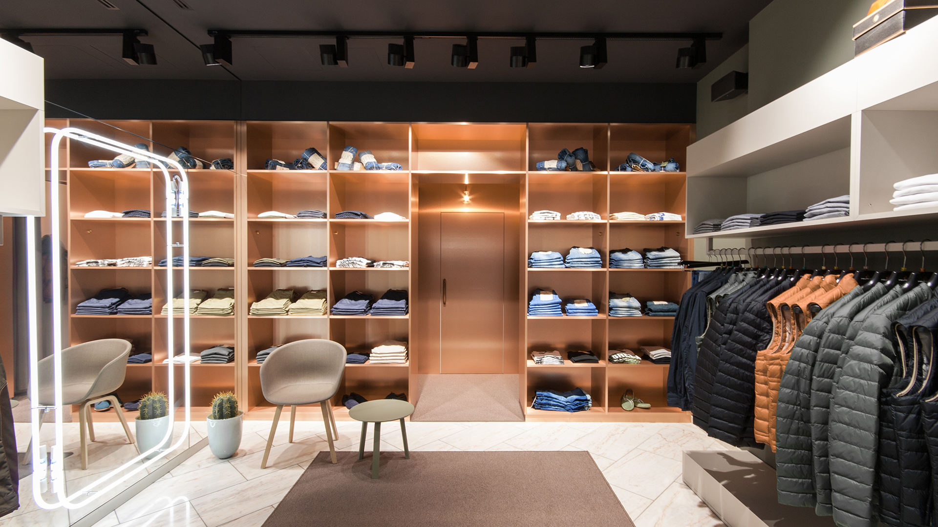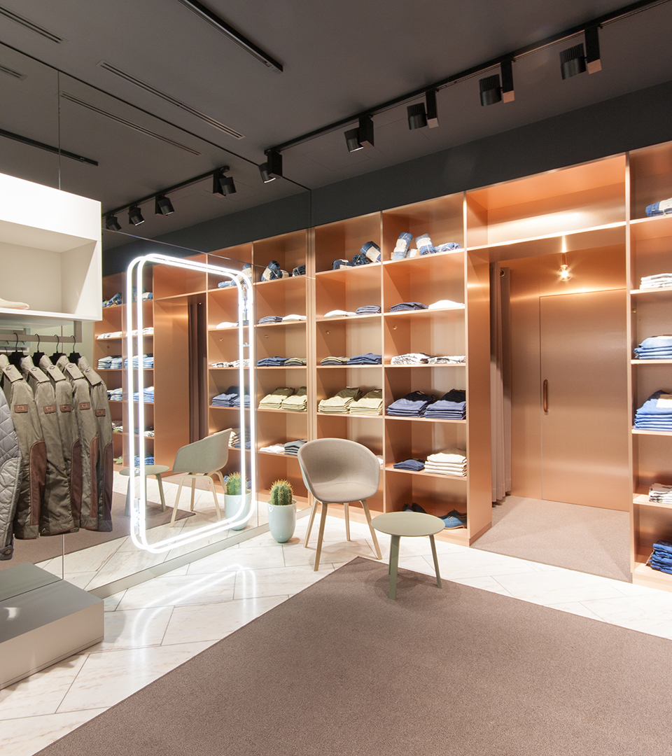 To create this shop concept for the menswear boutique Beenen, Jazzunique went for a scheme that deliberately distances itself from classic pomp. Minimalist design and natural materials like copper and wood complement the superb marble floors, and give exclusive fashion items sufficient room to make an impression. Particularly eyecatching are the copper chandeliers, specially designed by ourselves, and various neon contours that appear in the shop window and at the till as a conspicuous design feature. Distinguished furnishings and clear rectilinear outlines make the store an attractive space to spend time in.