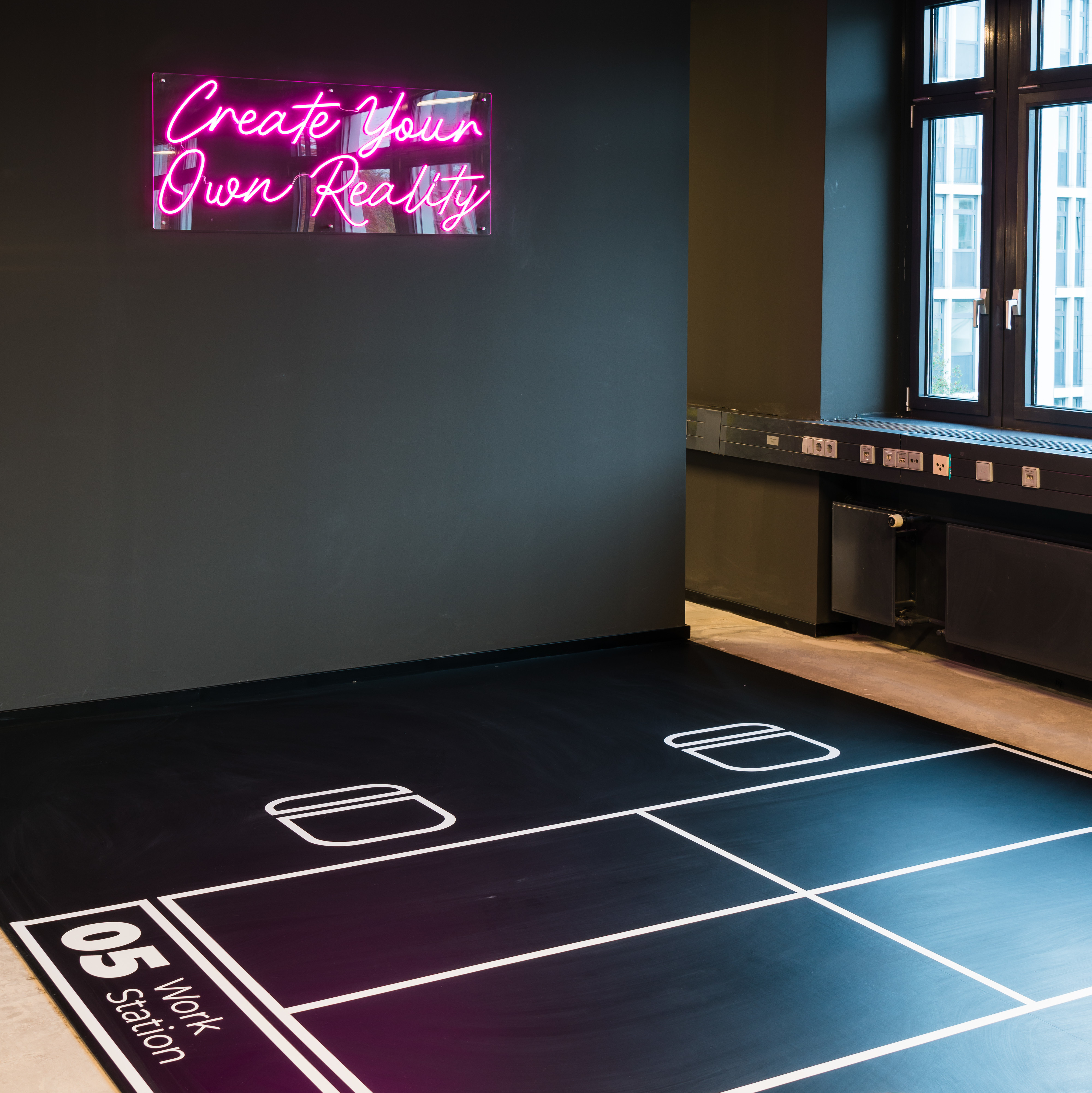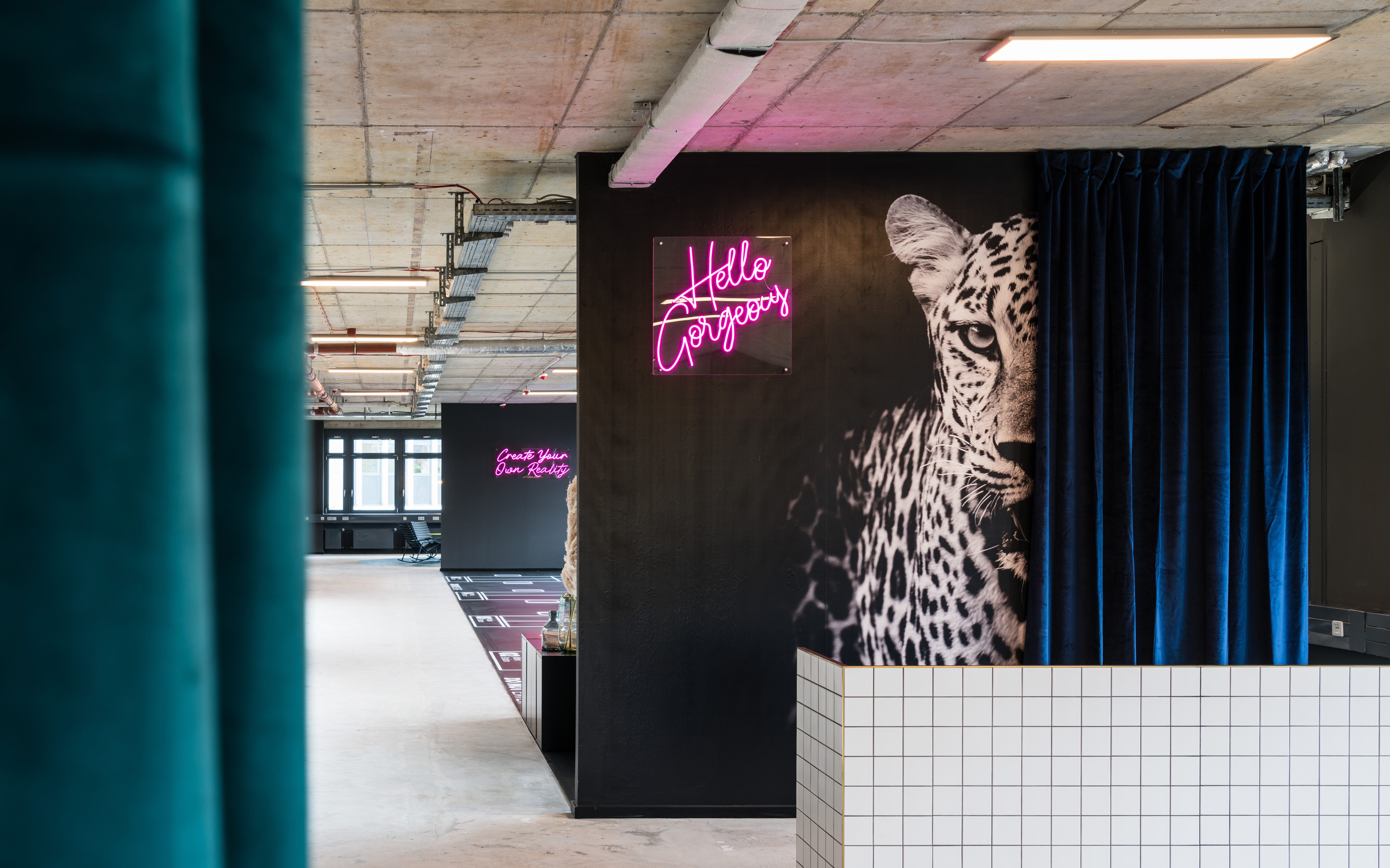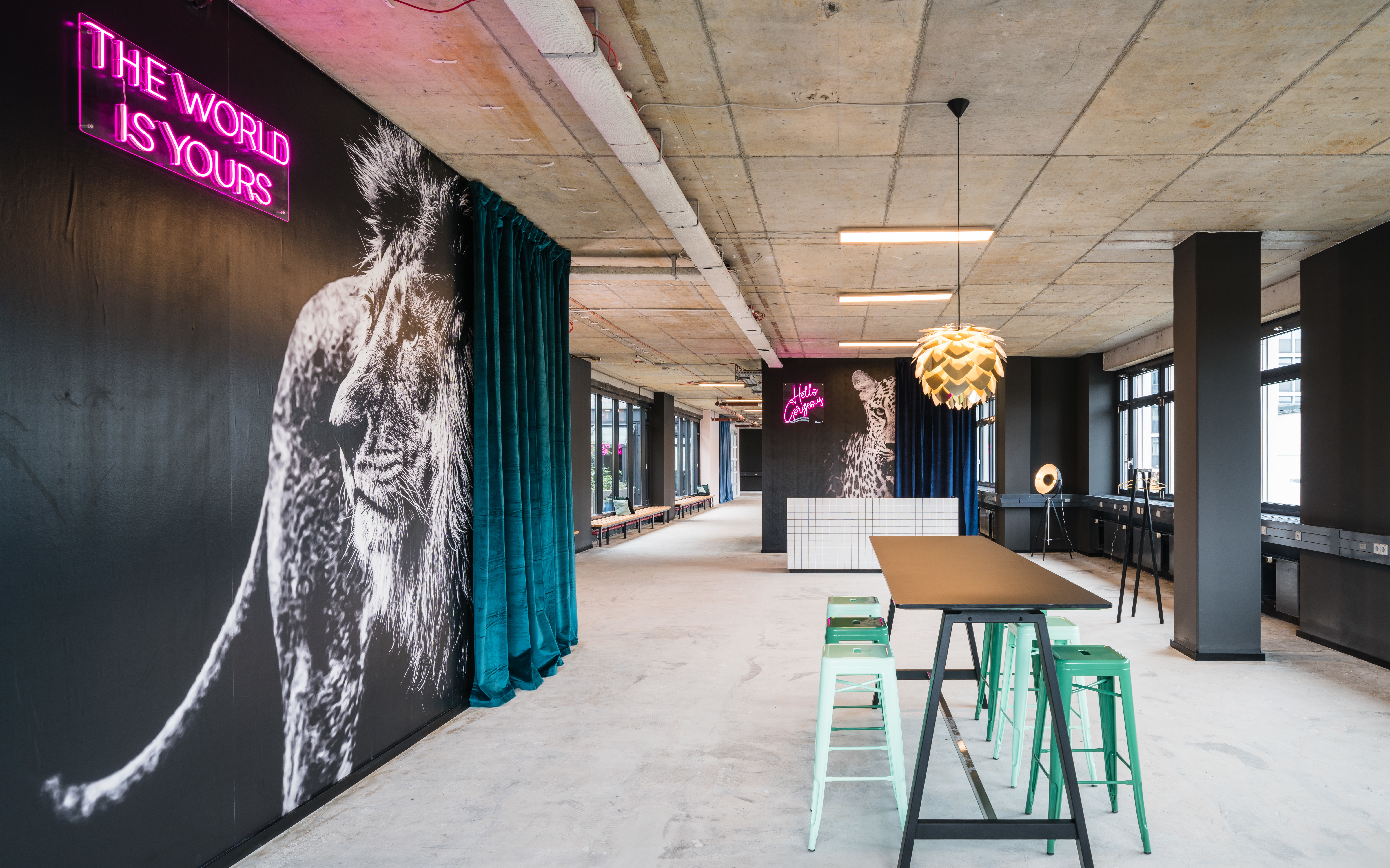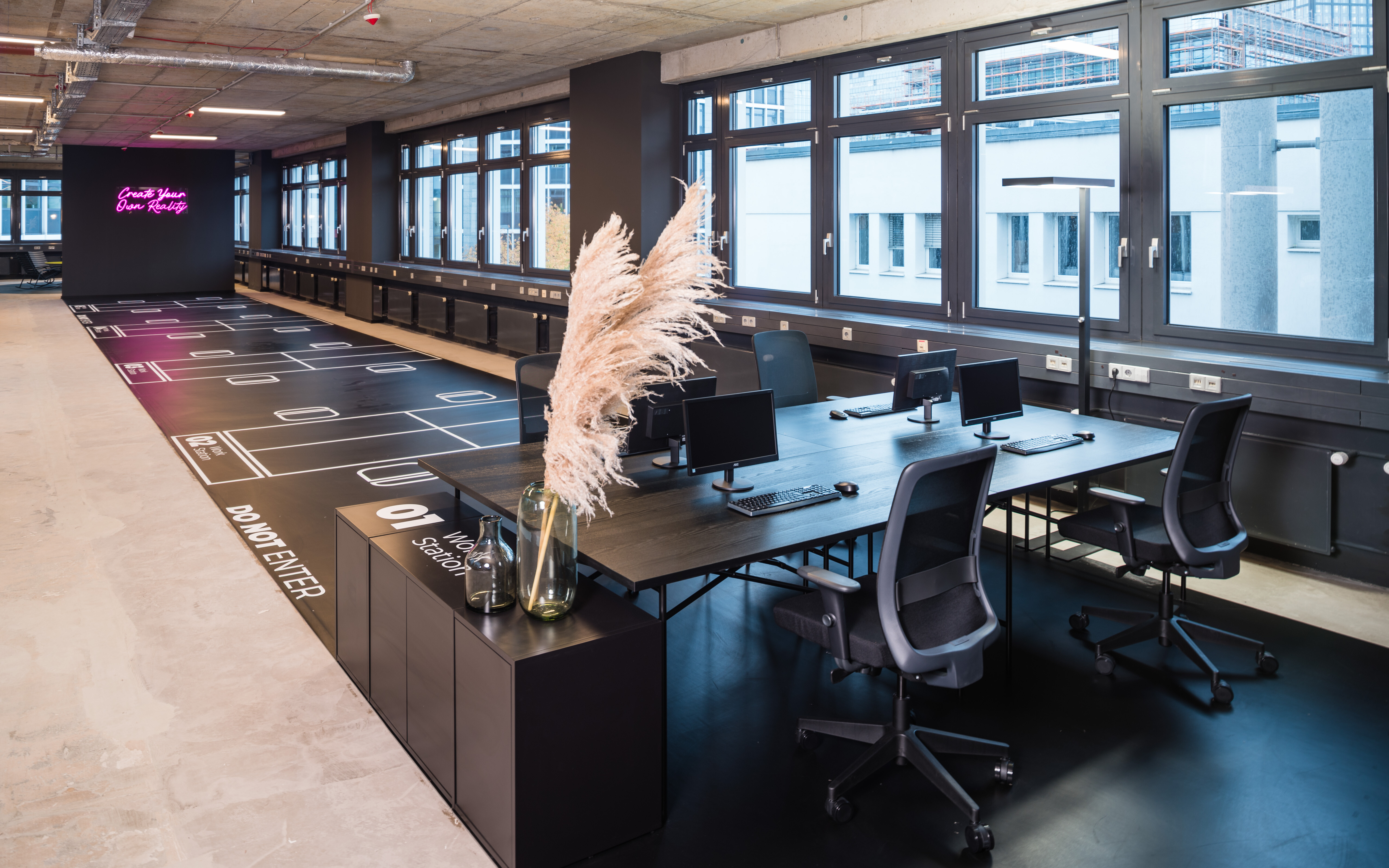 We created a somewhat different office show floor in the AHA7 office complex in Frankfurt/Eschborn: With its high-ceilinged rooms and an atrium, "Haus B" from the nineties holds enormous potential for new office worlds - especially for young start-ups looking for that certain something for their own company. Our goal was to make this potential tangible through unconventional and bold measures.