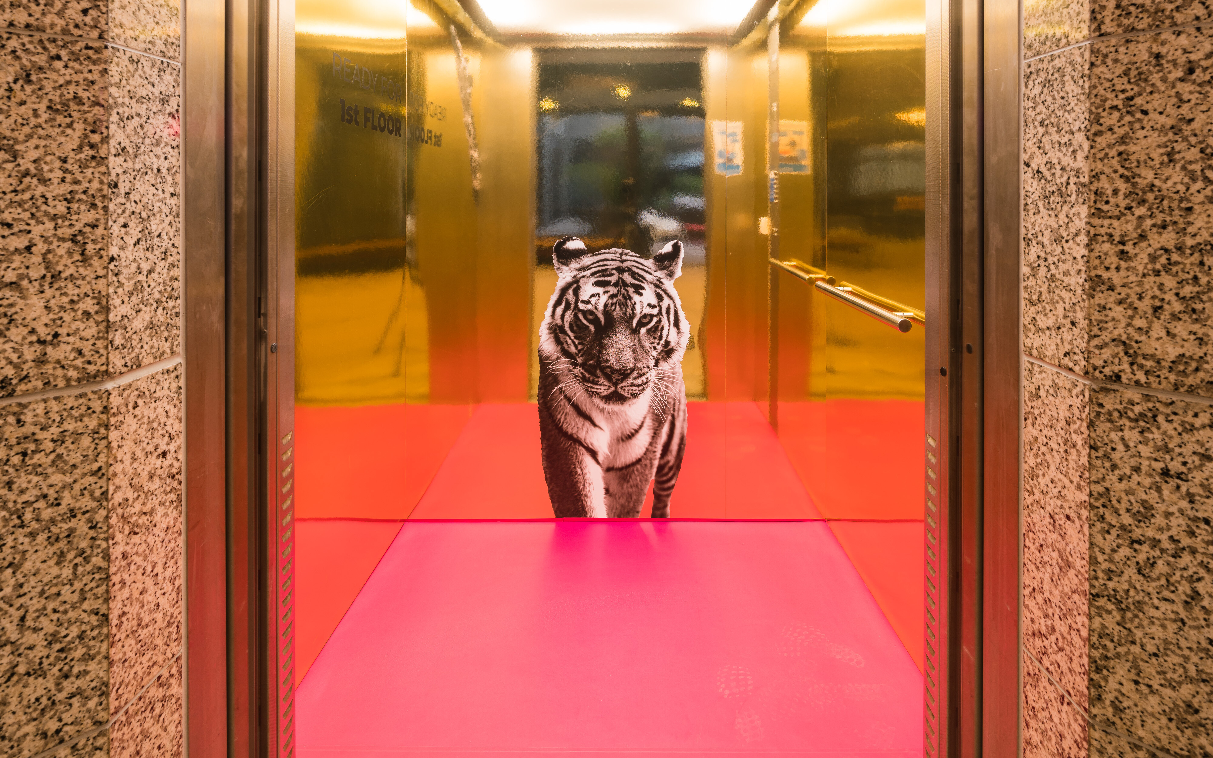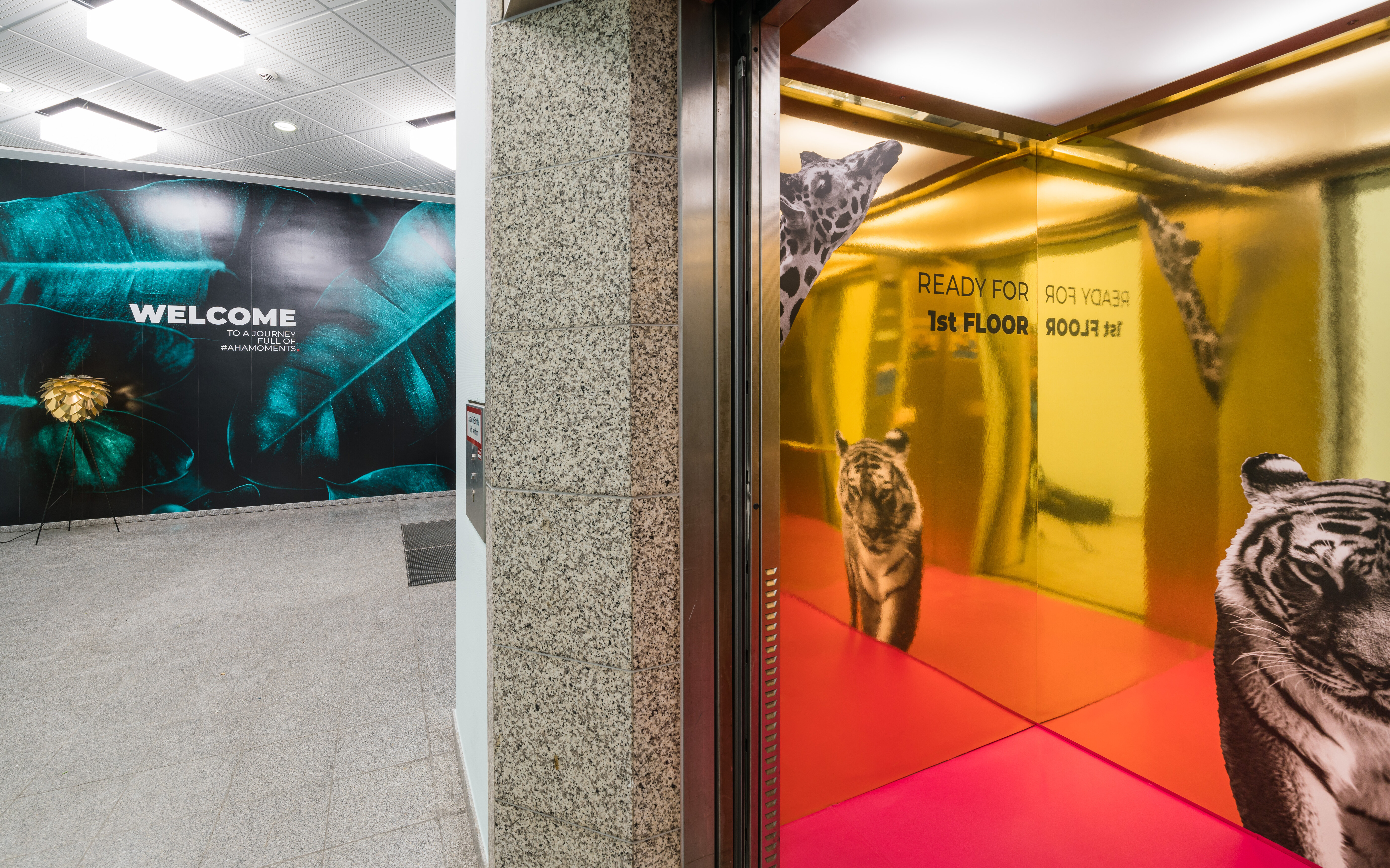 Already at the beginning of the customer journey - when entering the lift - a statement is made: The golden mirrored lion cage already teases what will be continued in the further course of the walk. This must be the place!