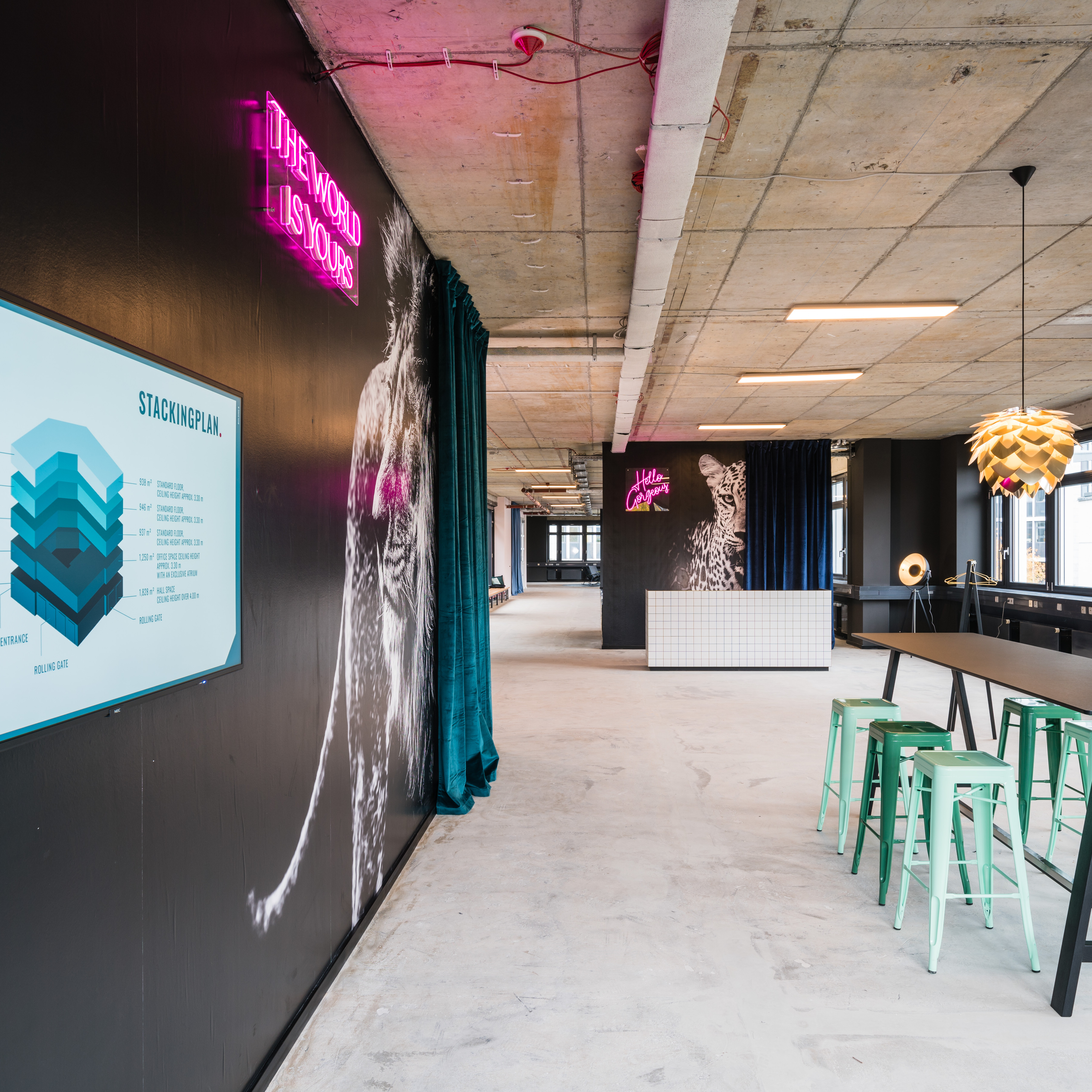 The brand lounge with reception and broker wall for the digital presentation of real estate features such as stacking plans, floor plans and visualisations are dominated on the one hand by animalistic large-scale image motifs, but also depict the spatial design potential of the office space.