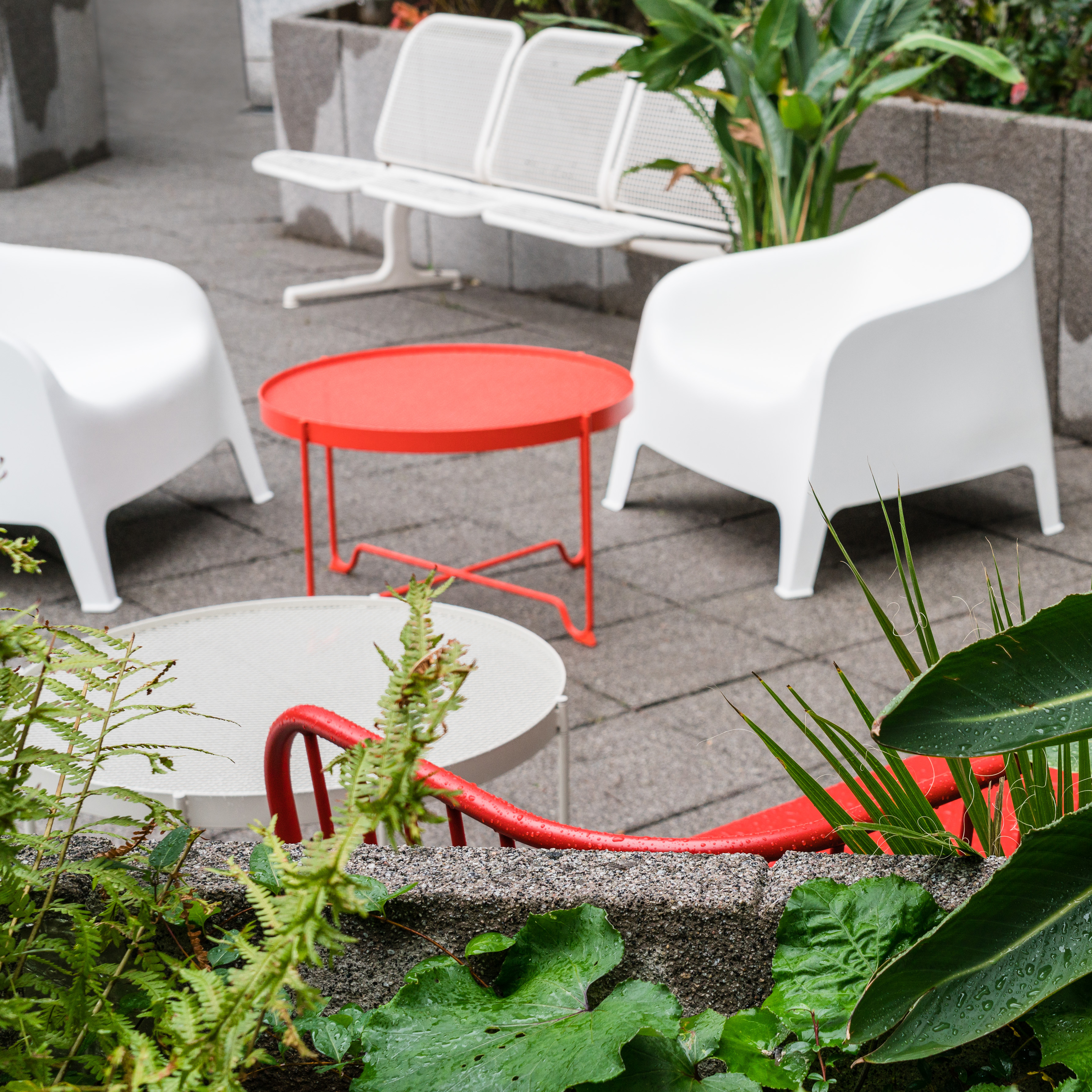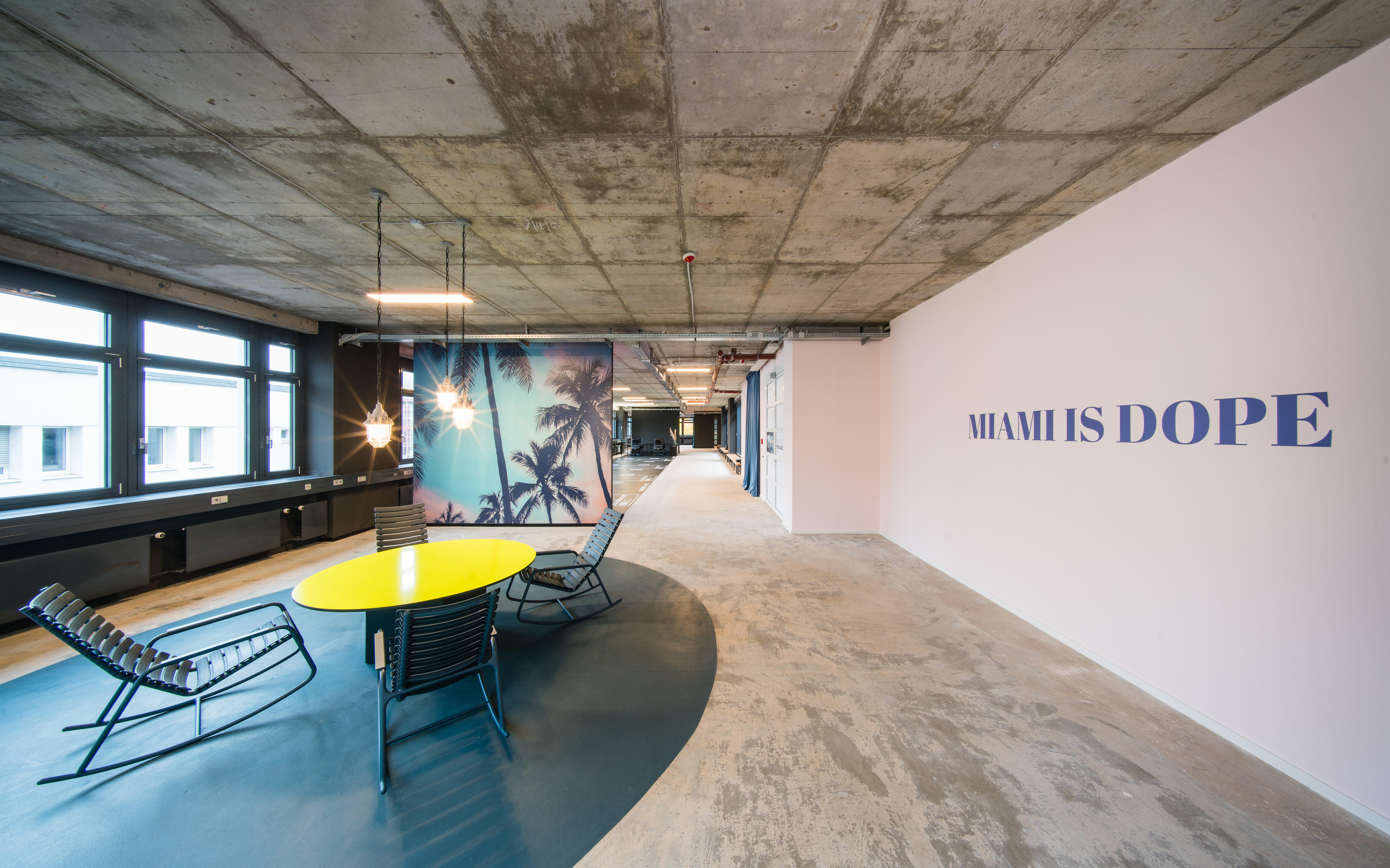 Miami is dope! In the subsequent meeting area, an unconventional furniture installation shows that a meeting can also be held in deck chairs with a view of palm trees.