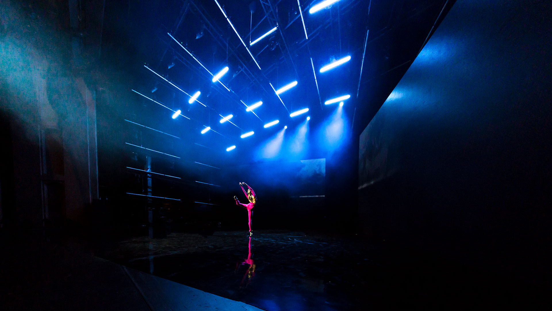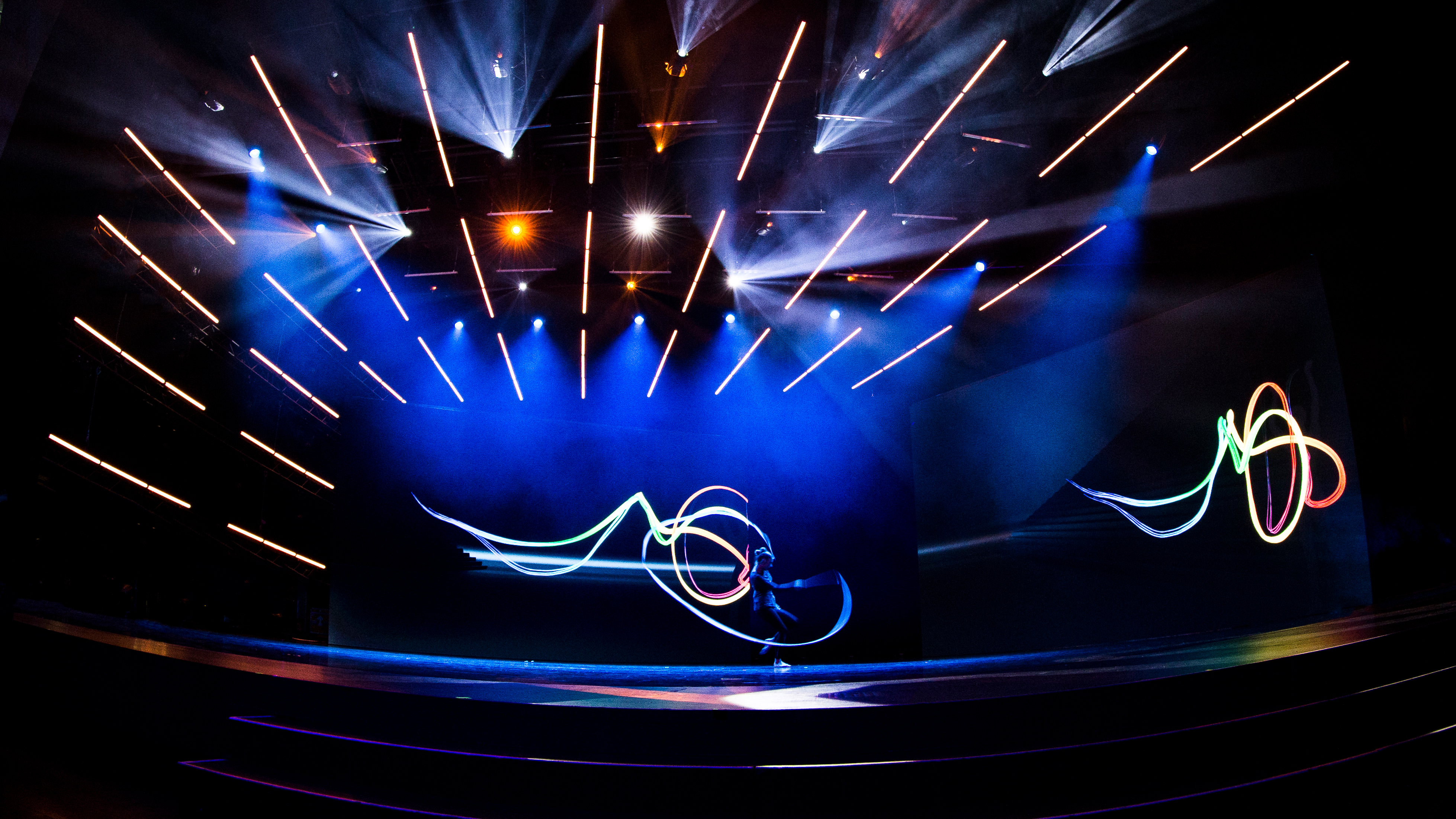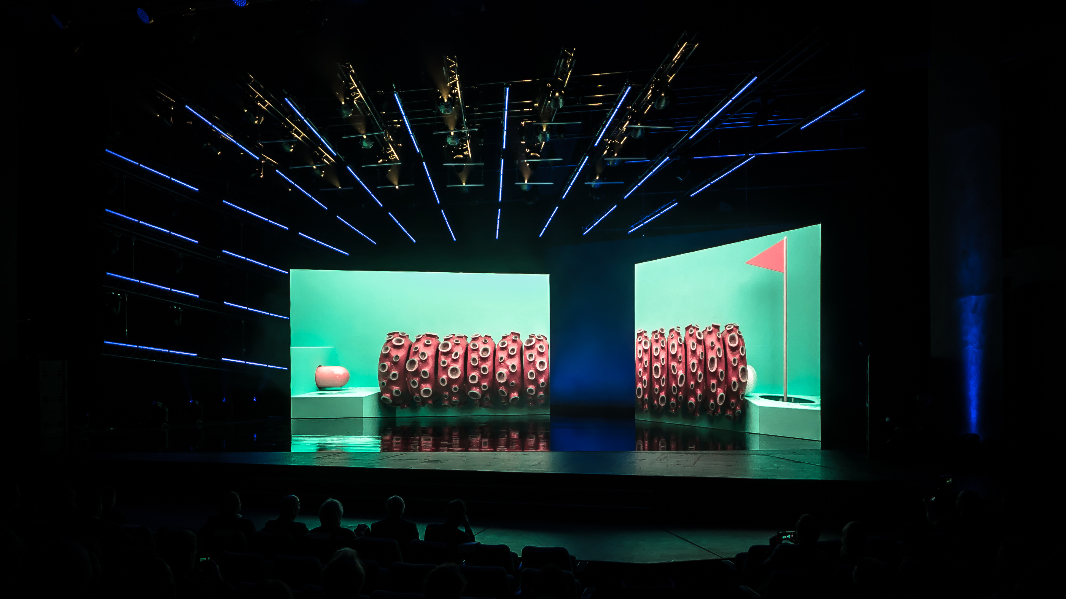 Two screens, freely positioned in space on a mirror surface, created extra visual depth for the stage while at the same time giving the spectators a completely new perspective. With artistic media content from Congaz, Björn Hermann's lighting design and the minimalist design of the stage area, we were able to create a different space for each item on the programme.