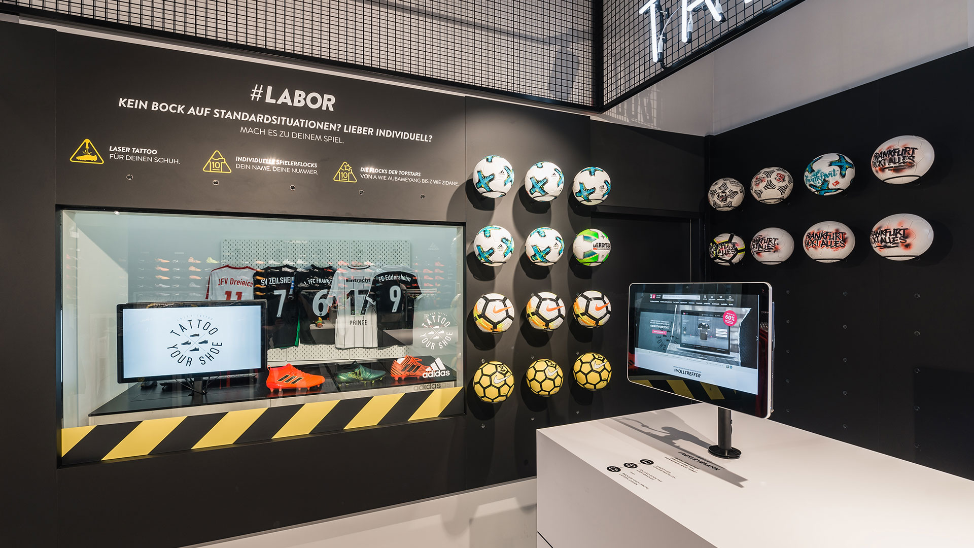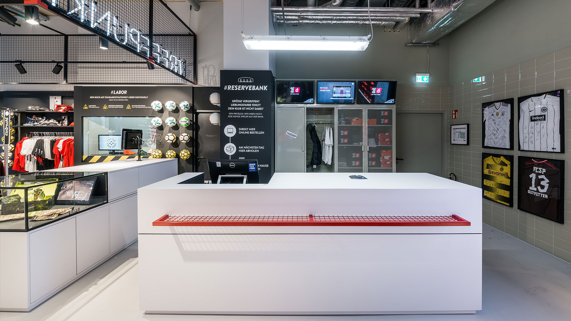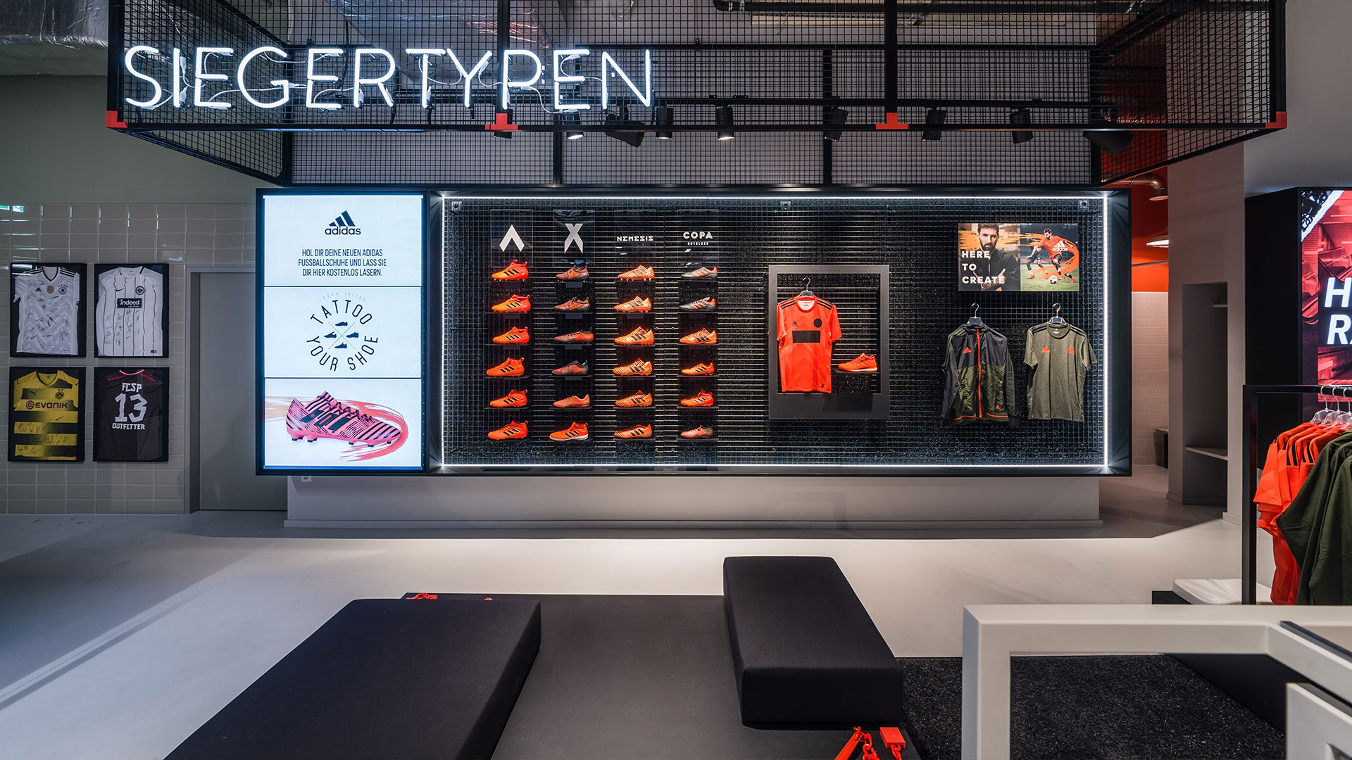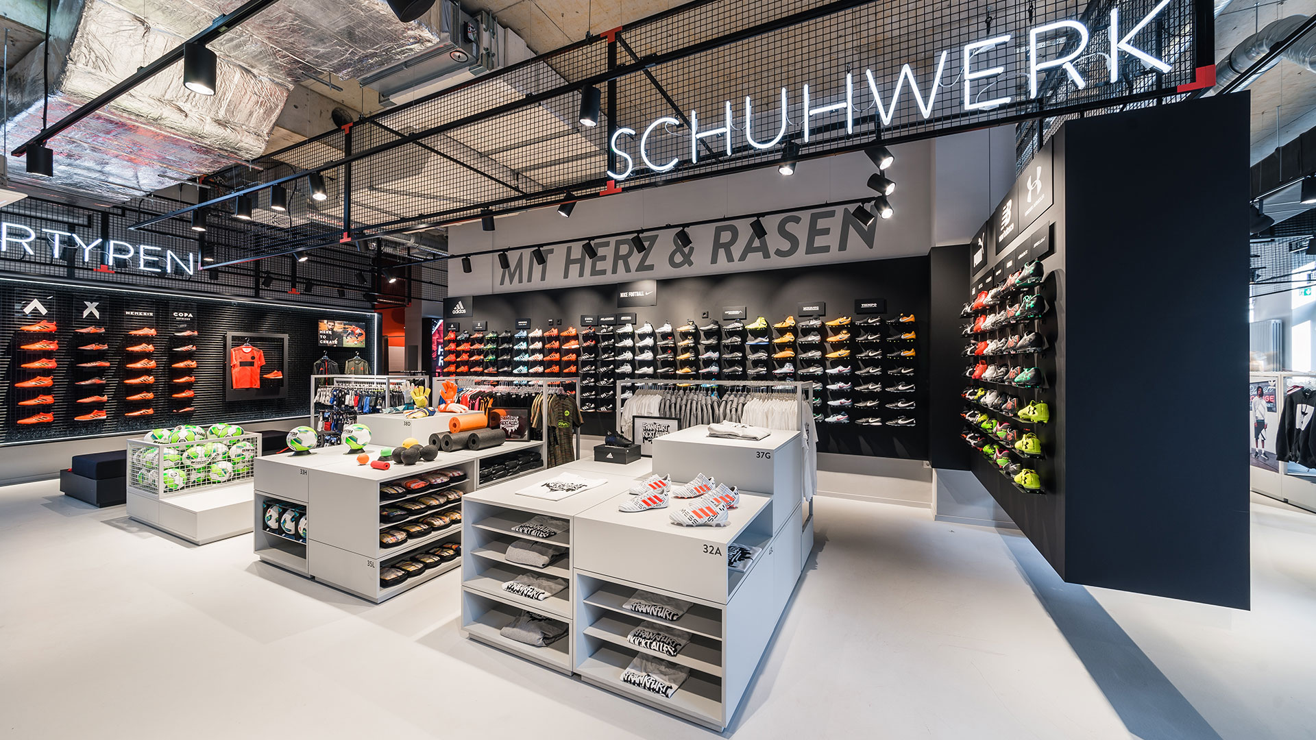 In designing the 510 square metre area of the shop, we were faithful to the slogan 'With heart and turf', focusing entirely on urban football culture and anchoring it effectively in the pulse of the Main metropolis. The resulting store design boasts an impressively clear ambiance, with occasional dramatically effective highlights, like the cages evocative of city football grounds.