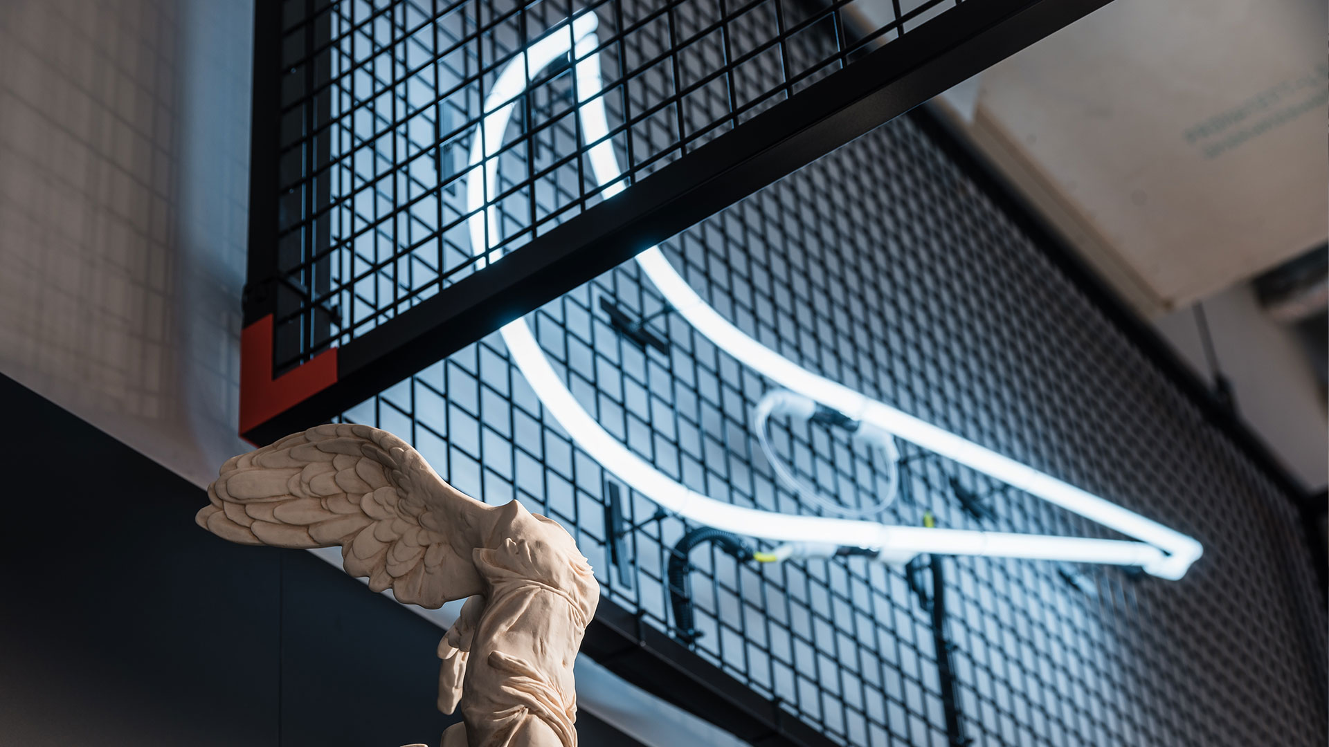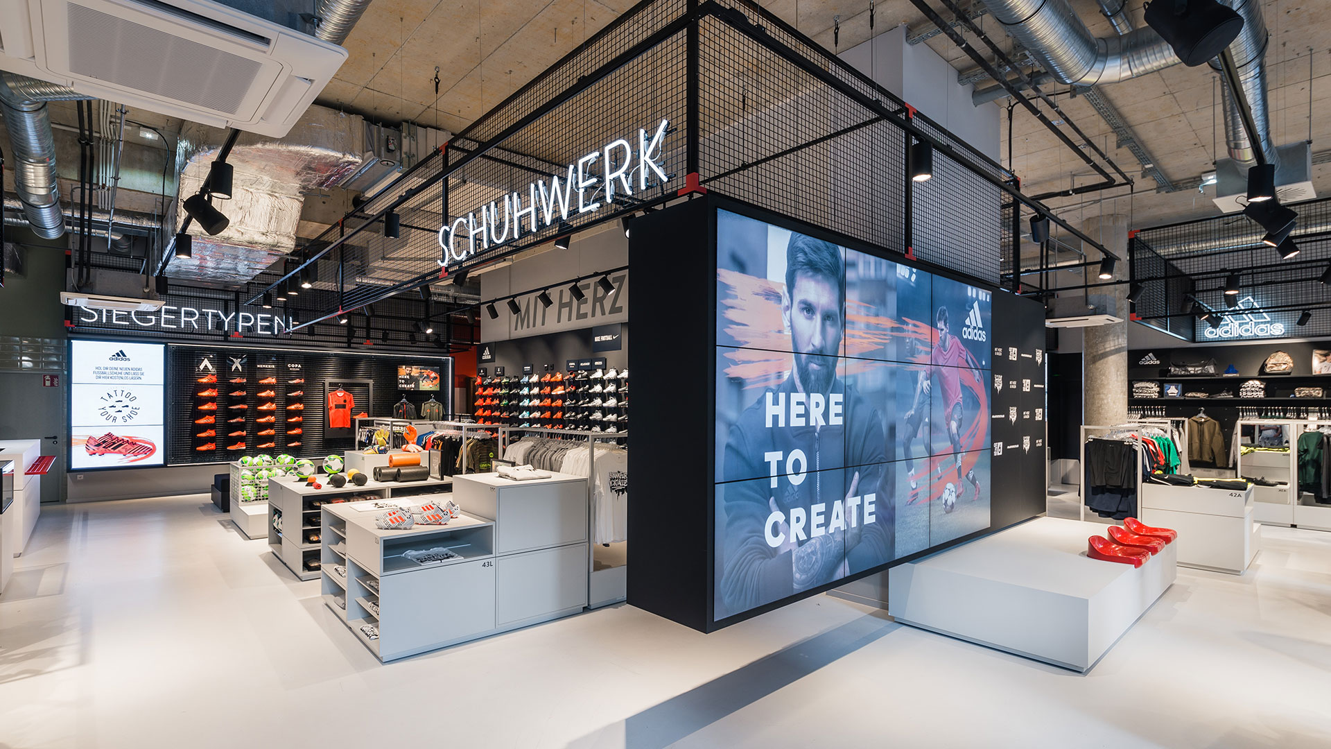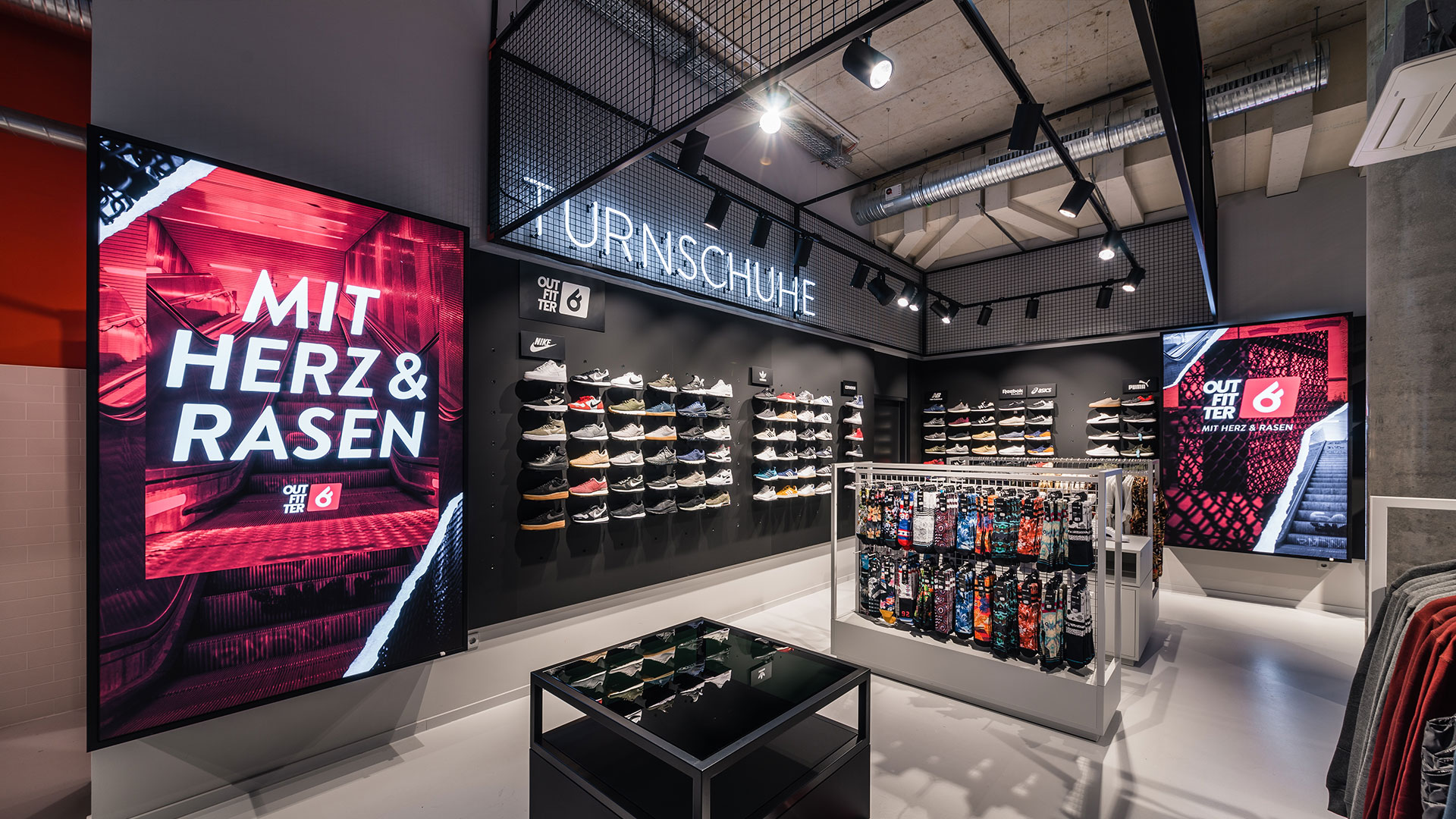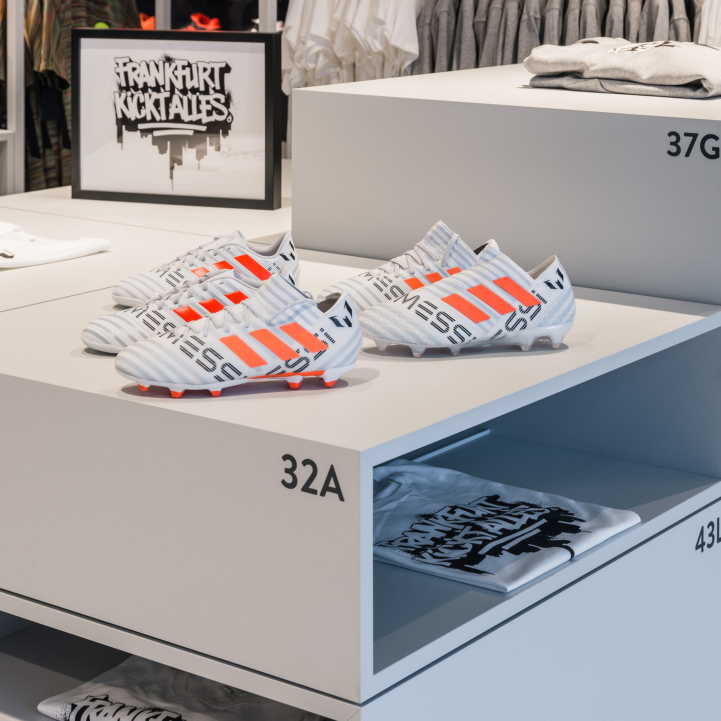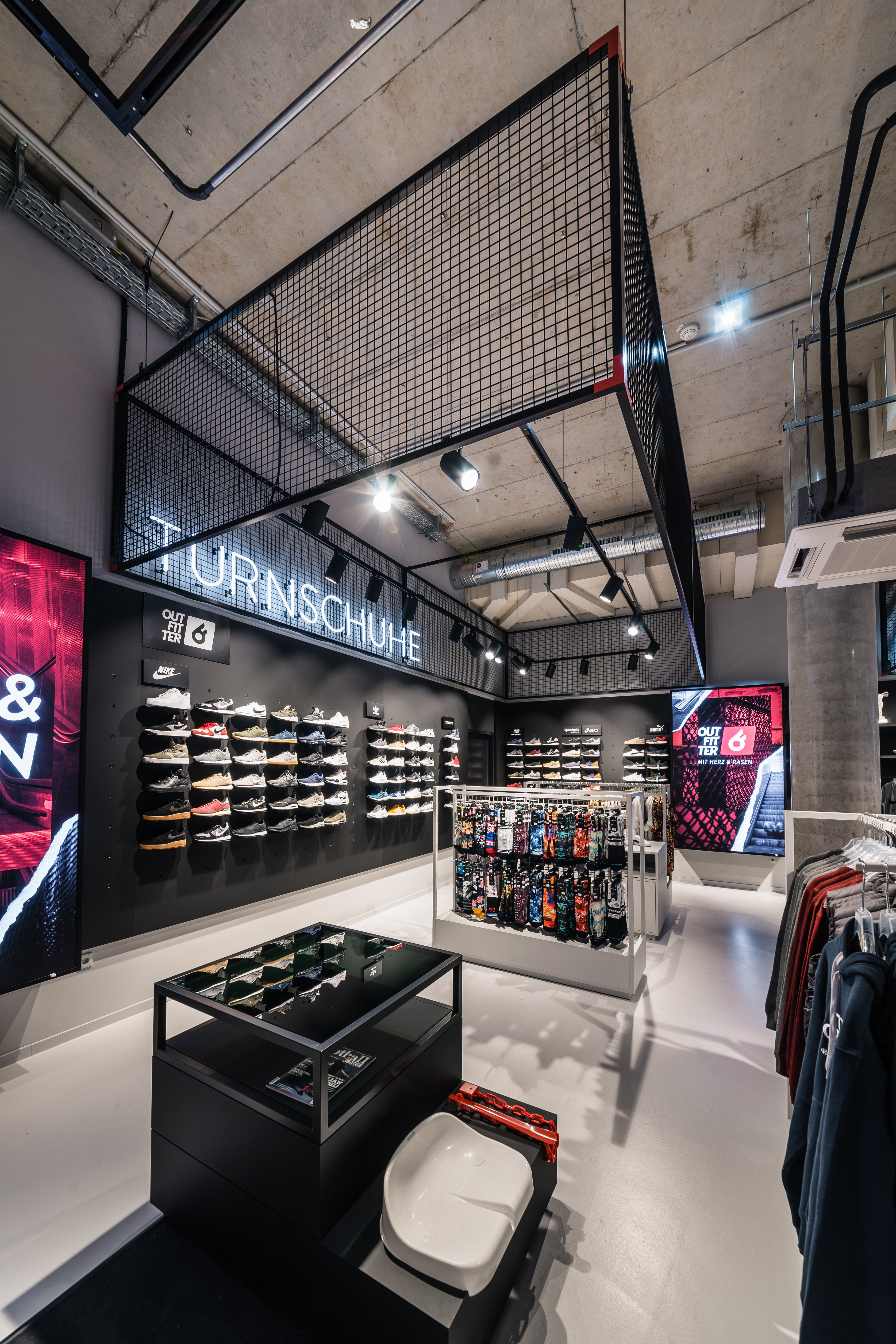 In designing the 510 square metre area of the shop, we were faithful to the slogan 'With heart and turf', focusing entirely on urban football culture and anchoring it effectively in the pulse of the Main metropolis. The resulting store design boasts an impressively clear ambiance, with occasional dramatically effective highlights, like the cages evocative of city football grounds.