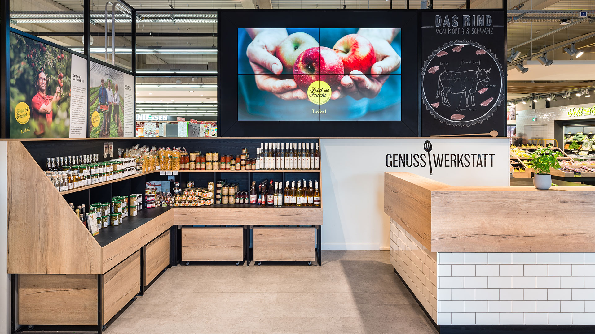 Graphic elements from Burn the Bunny, coupled with our spatial designs, resulted in an urban look that is at once authentic and classy. The dominant design idea for us was to allow the product itself - the fruit and vegetables - to take centre stage. Thanks to the differentiated furnishings, each section now has a quite distinctive look, so that customers can suddenly find their way around much more easily.