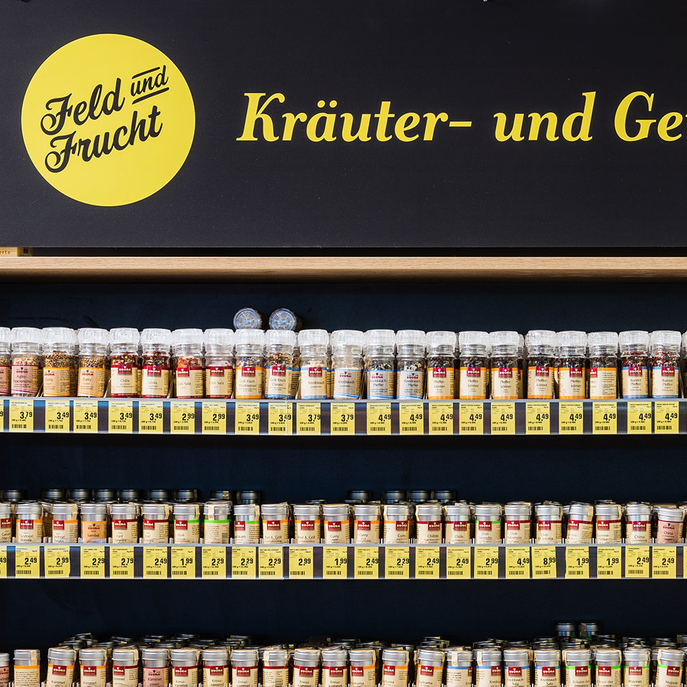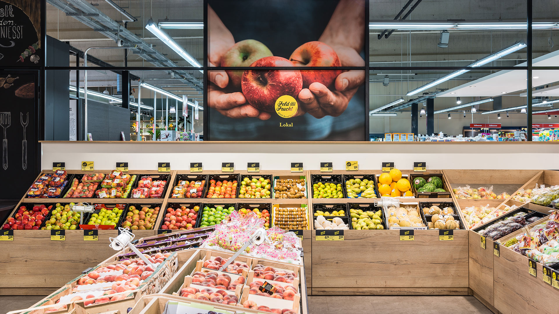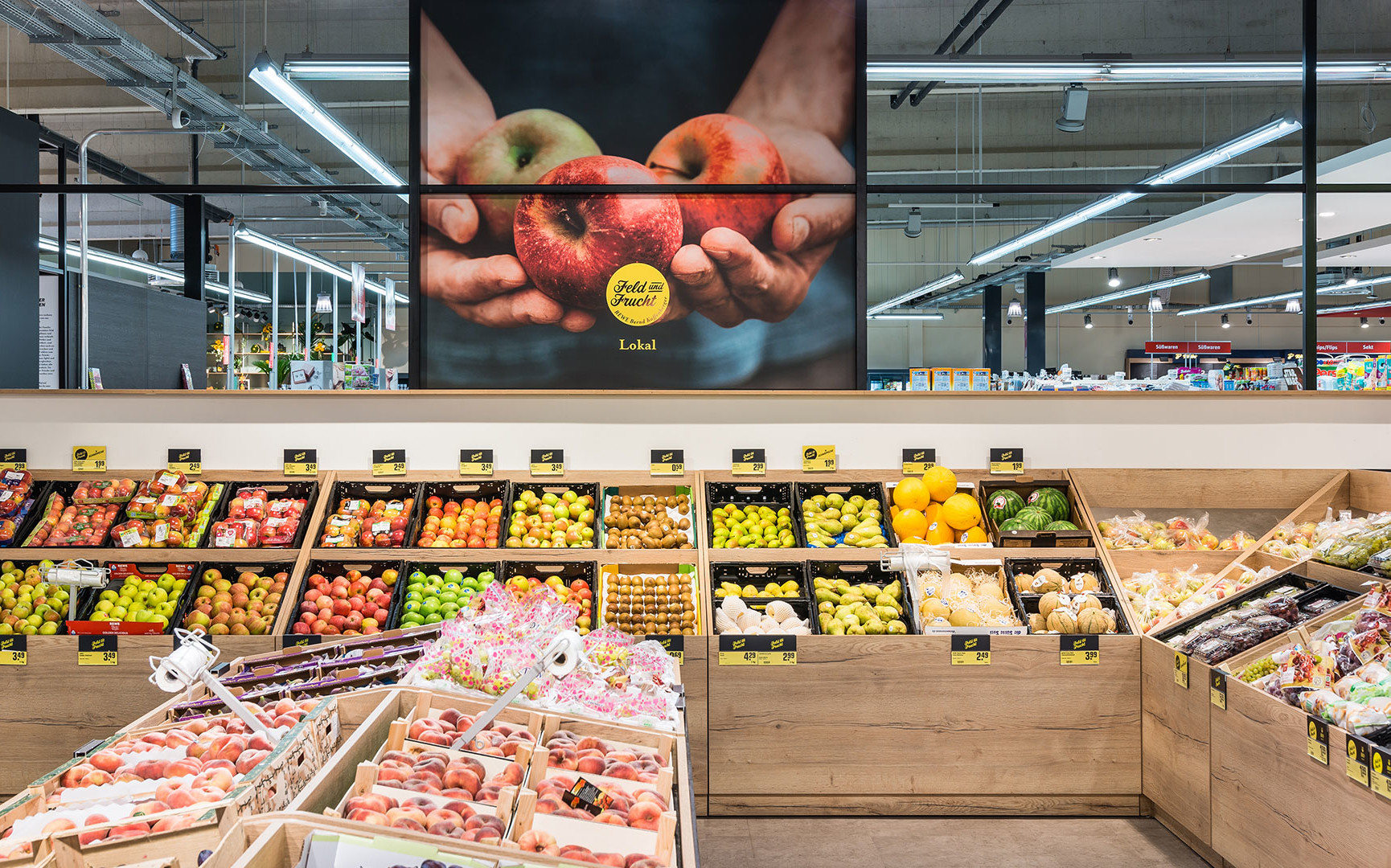The fruit and vegetables department often functions as the visiting card of a supermarket. At the biggest independently managed REWE store of the Rhine-Main region, the Bernd Kaffenberger REWE in Bad Vilbel, we were commissioned, in partnership with the advertising agency Burn the Bunny, to make this sector a real shopping experience. The leading idea of the new design was 'the supermarket's weekly market', because the user-friendly display of rearranged products focuses above all on the seasonal and the regional.