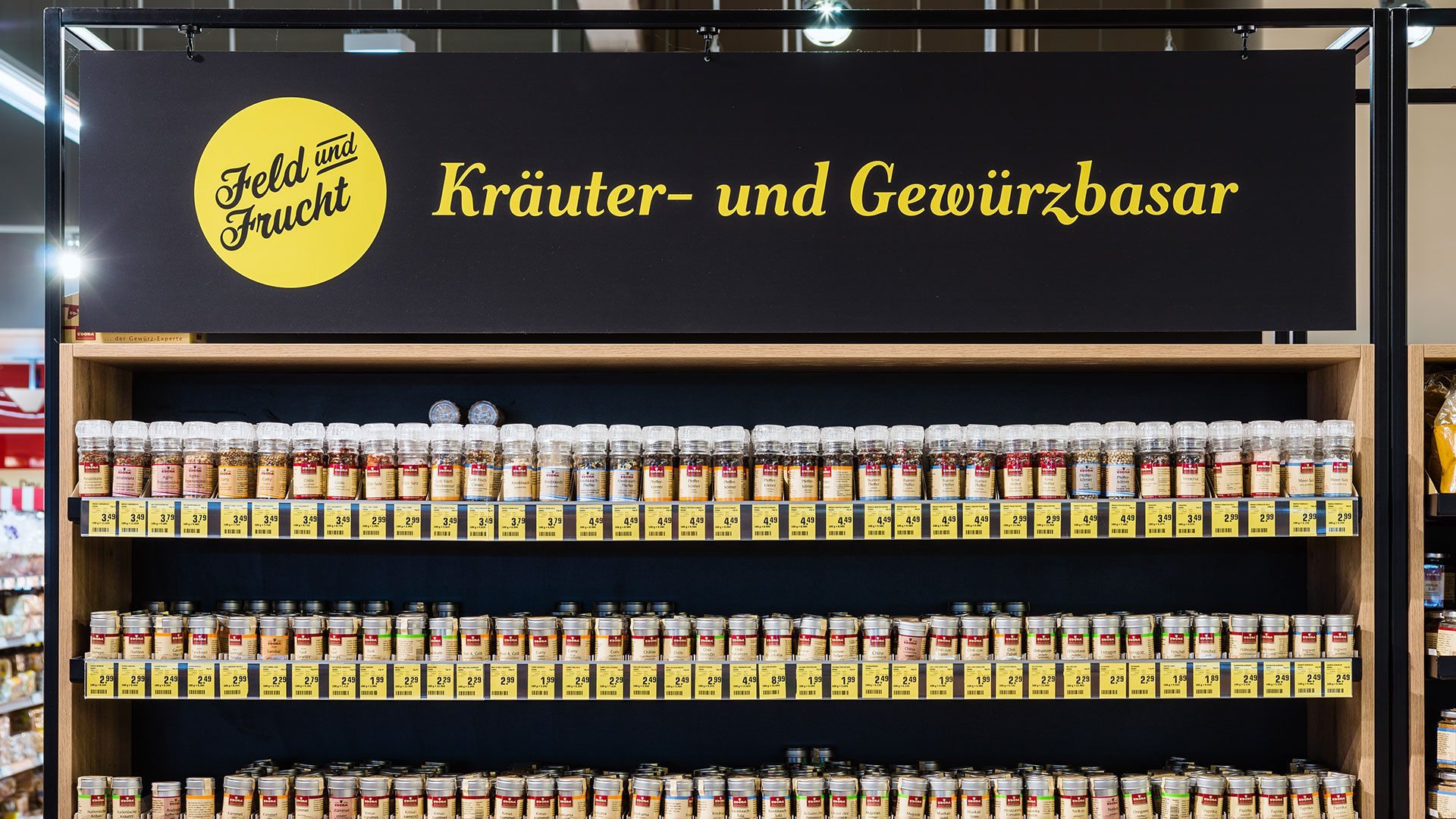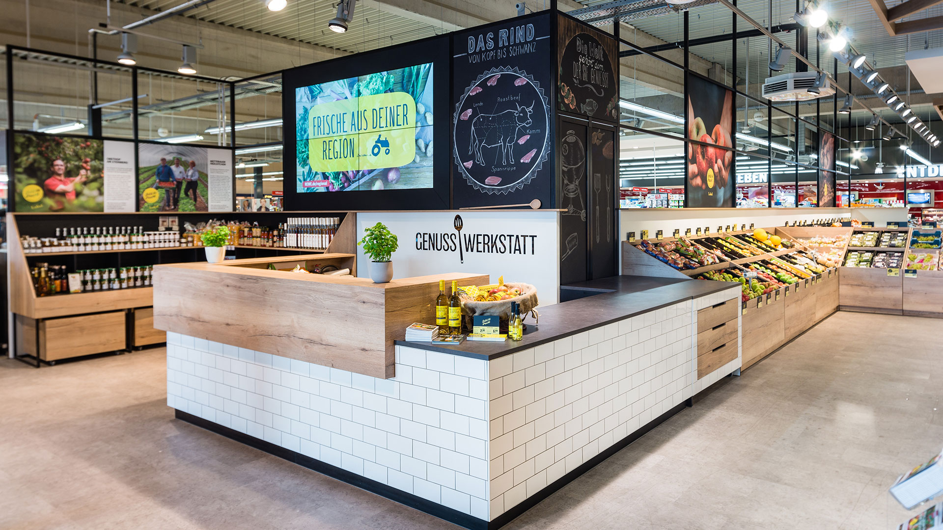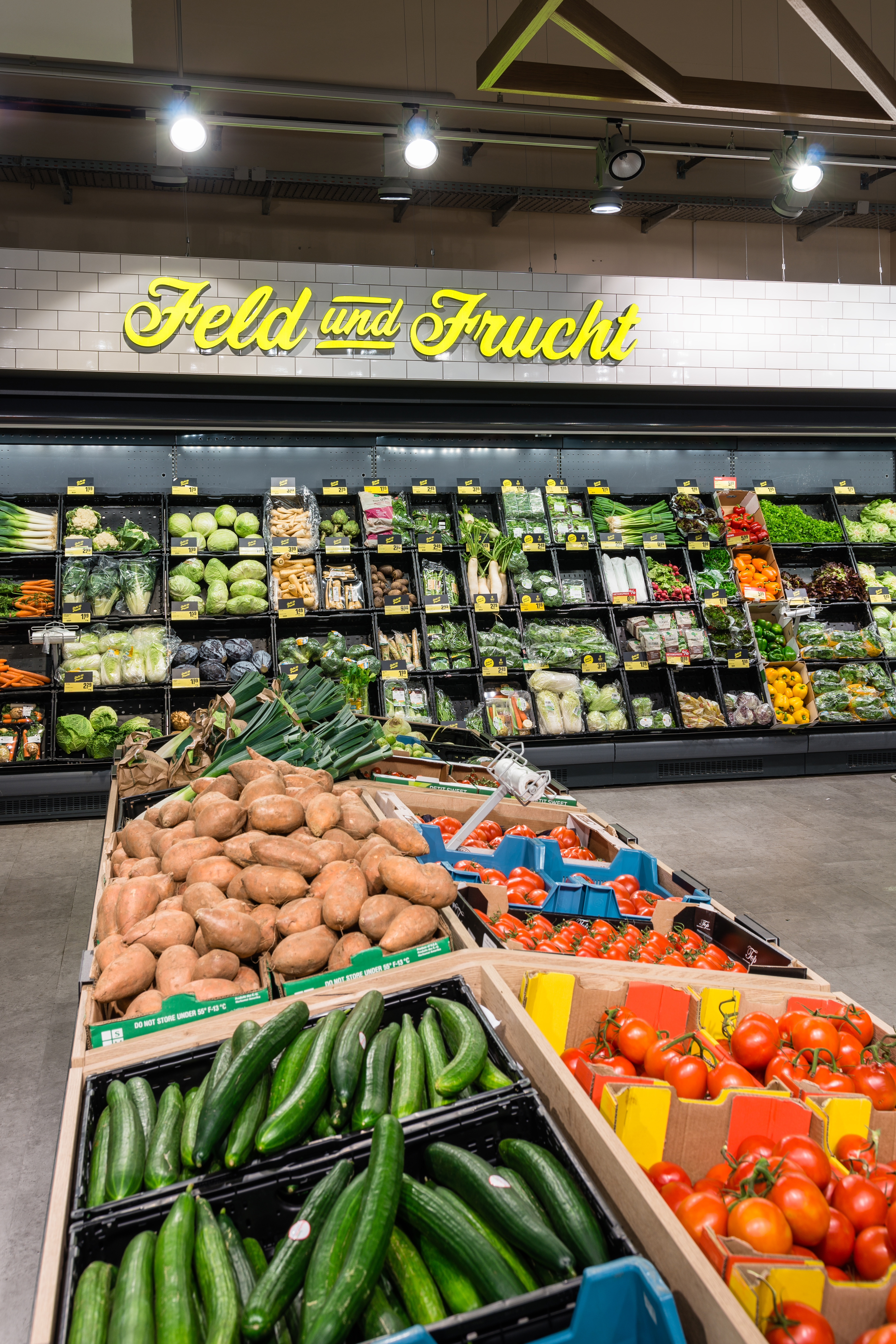 The fruit and vegetables department often functions as the visiting card of a supermarket. At the biggest independently managed REWE store of the Rhine-Main region, the Bernd Kaffenberger REWE in Bad Vilbel, we were commissioned, in partnership with the advertising agency Burn the Bunny, to make this sector a real shopping experience. The leading idea of the new design was 'the supermarket's weekly market', because the user-friendly display of rearranged products focuses above all on the seasonal and the regional.