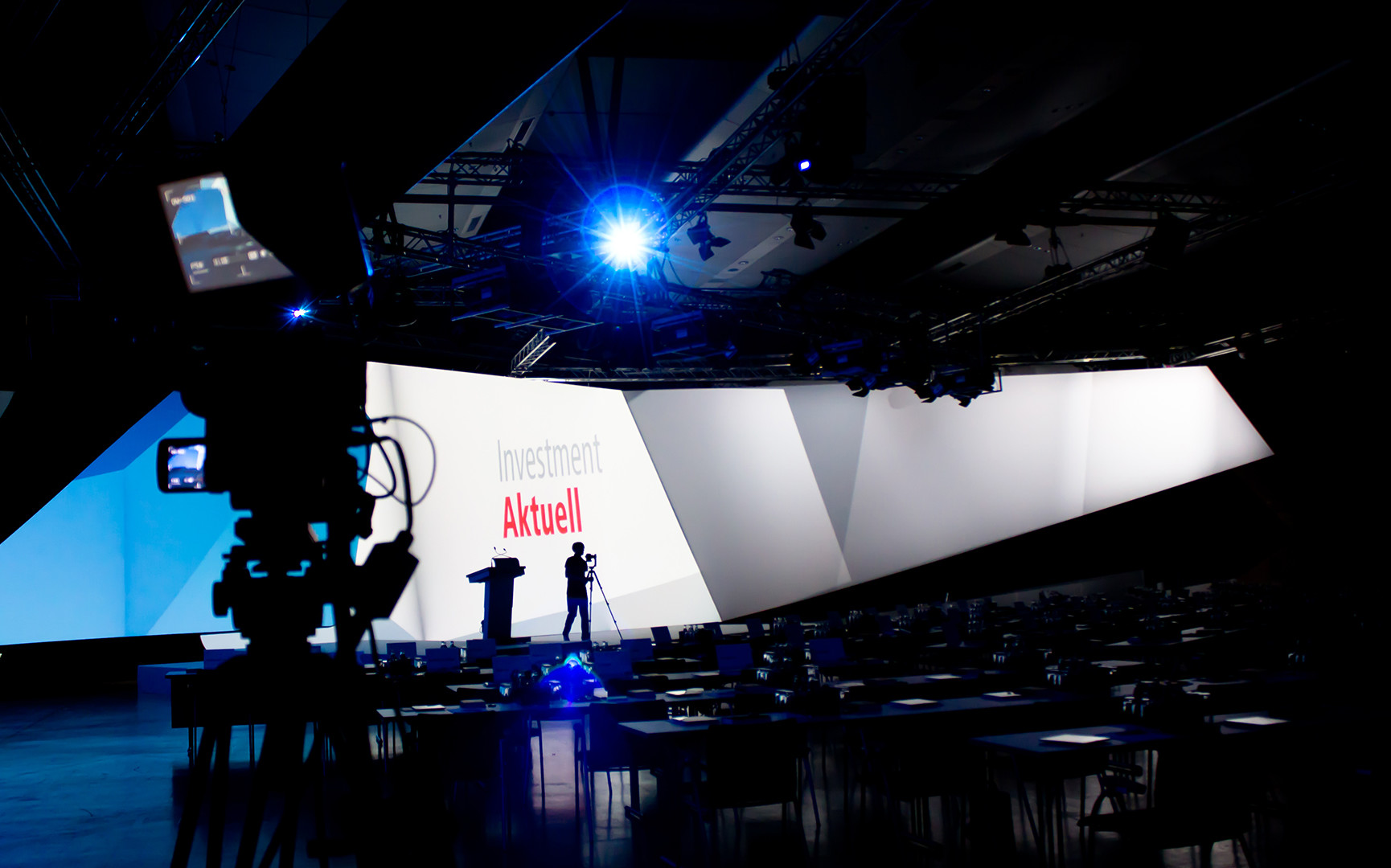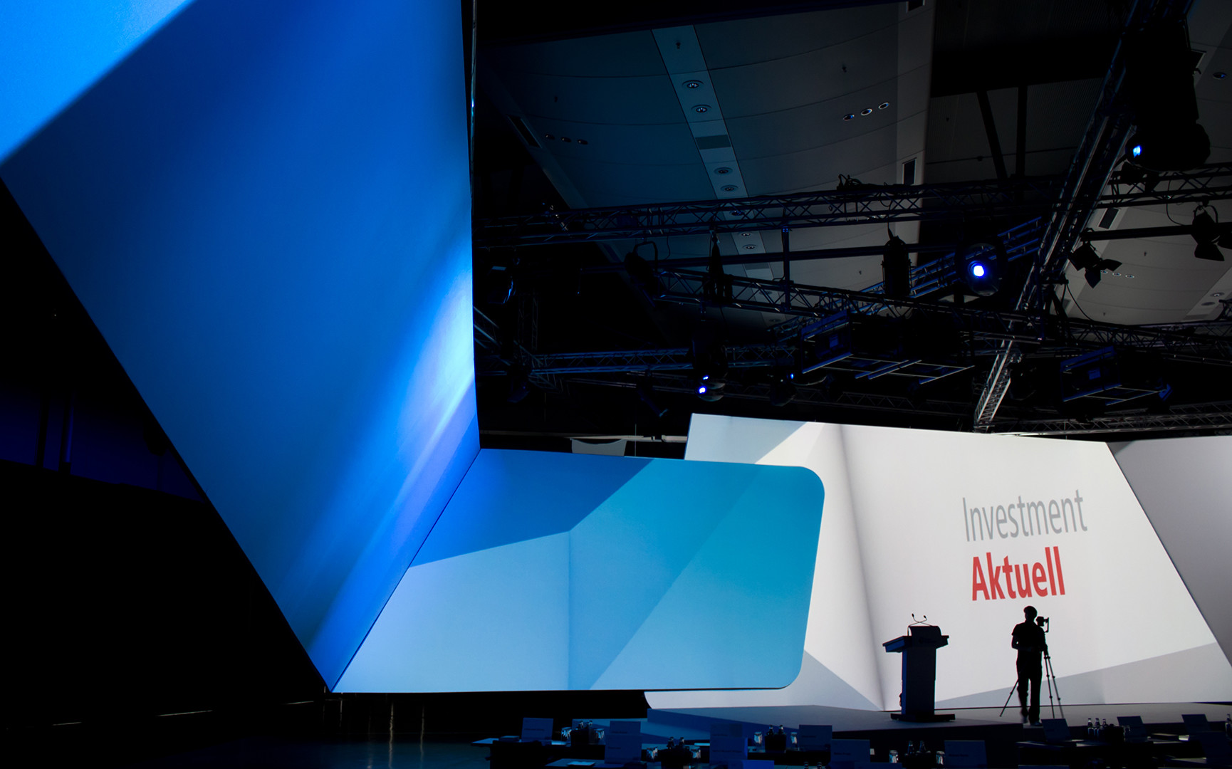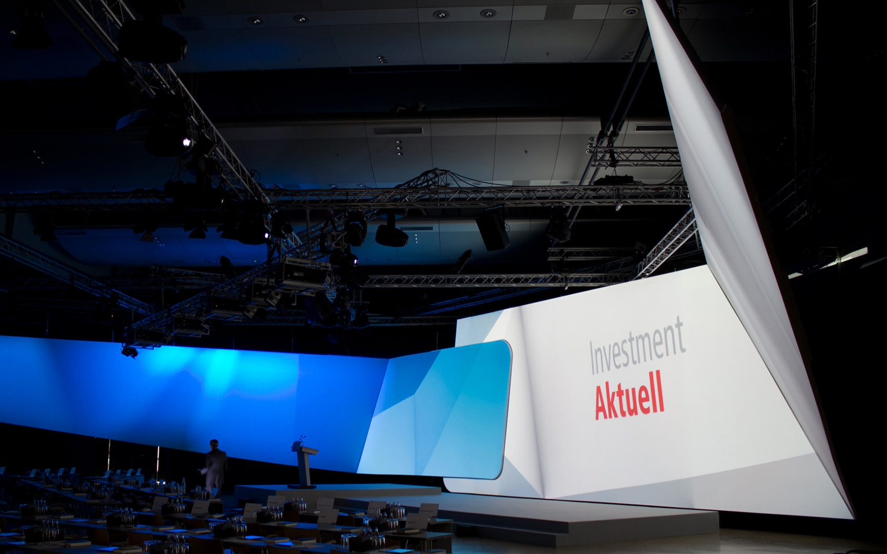Under the event title "Investment Aktuell", Union Investment annually invites a very exclusive circle of its sales partner banks to an informative trade congress in Frankfurt am Main. In 2011, for the first time, we were responsible for the design and the complete process control of the day event in the "Panorama" hall of the Frankfurt Trade Fair. The free-floating and expansive stage sails, an architectural interpretation of the recently established new corporate design, served as a projection surface for a wide variety of media content. The completely changeable stage, equipped with lighting, 3D animations and live images, provided a suitable setting for the high-quality program items.