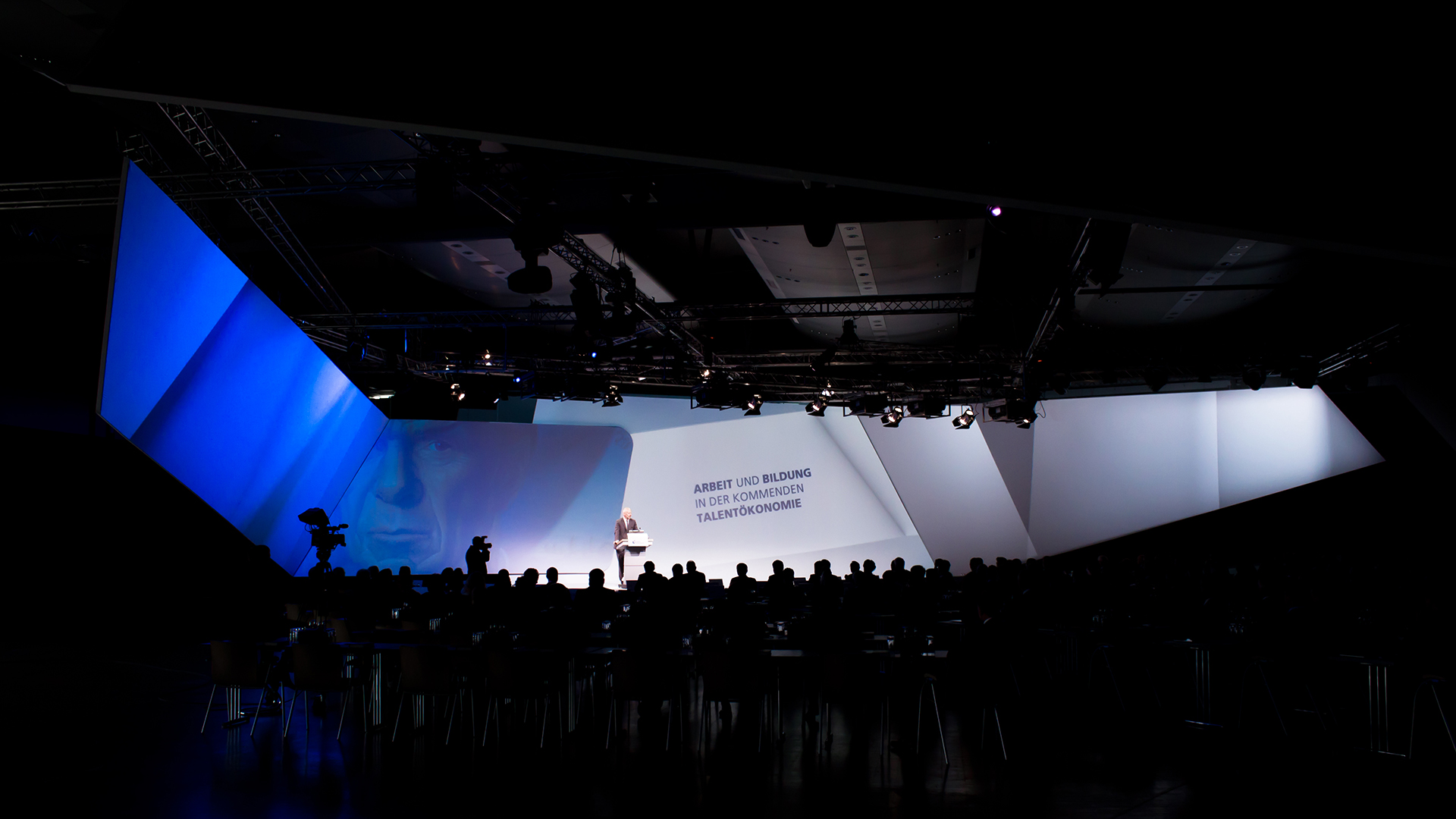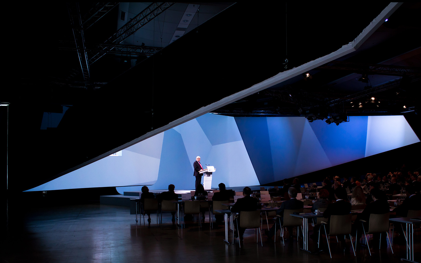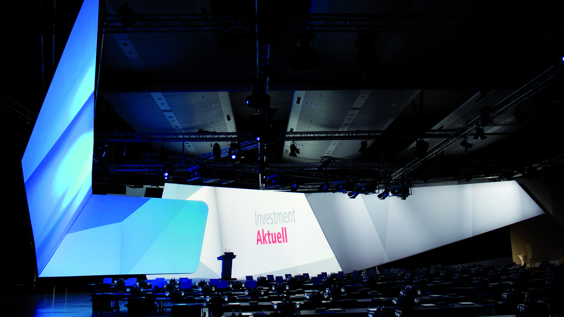 Under the event title "Investment Aktuell", Union Investment annually invites a very exclusive circle of its sales partner banks to an informative trade congress in Frankfurt am Main. In 2011, for the first time, we were responsible for the design and the complete process control of the day event in the "Panorama" hall of the Frankfurt Trade Fair. The free-floating and expansive stage sails, an architectural interpretation of the recently established new corporate design, served as a projection surface for a wide variety of media content. The completely changeable stage, equipped with lighting, 3D animations and live images, provided a suitable setting for the high-quality program items.