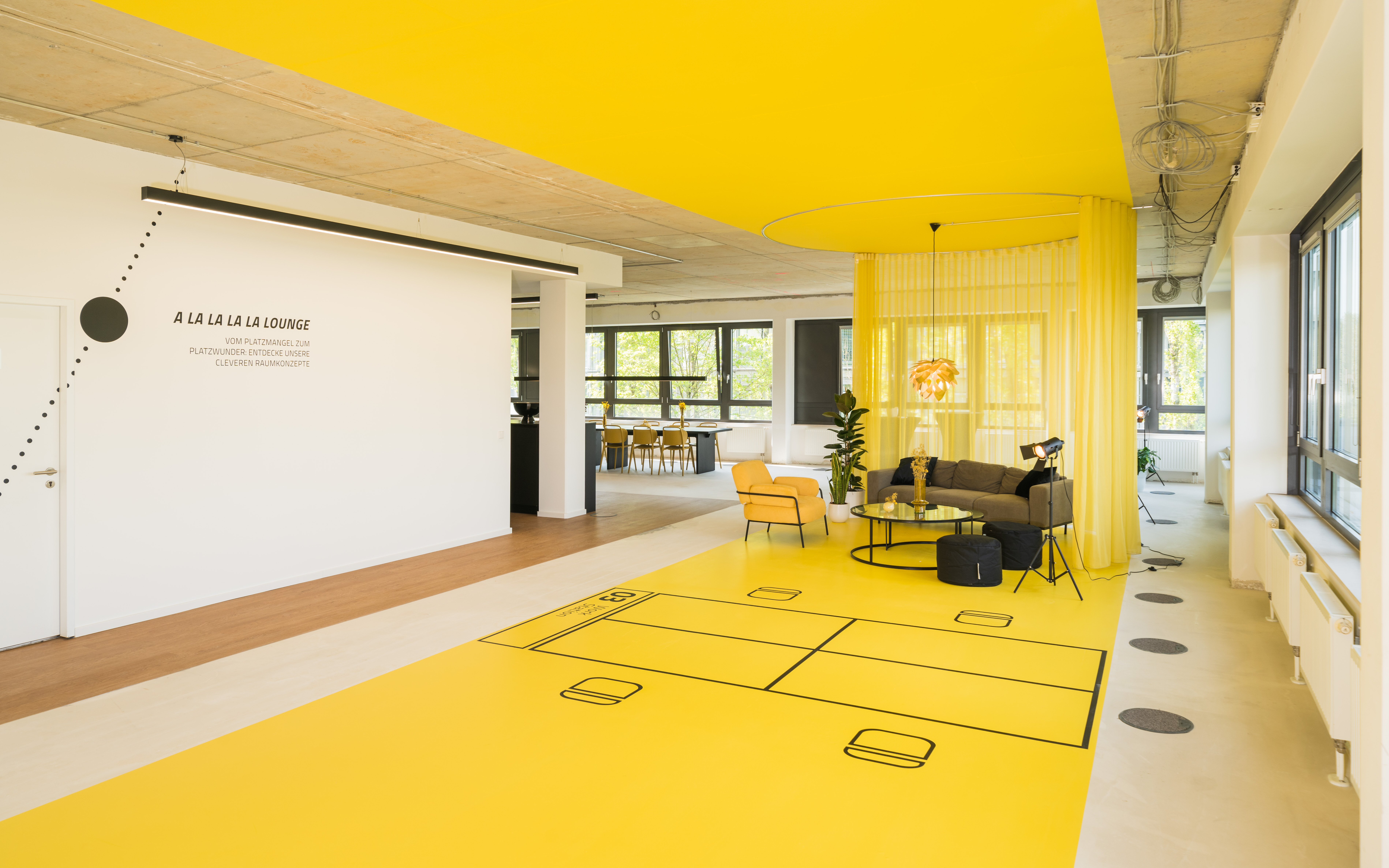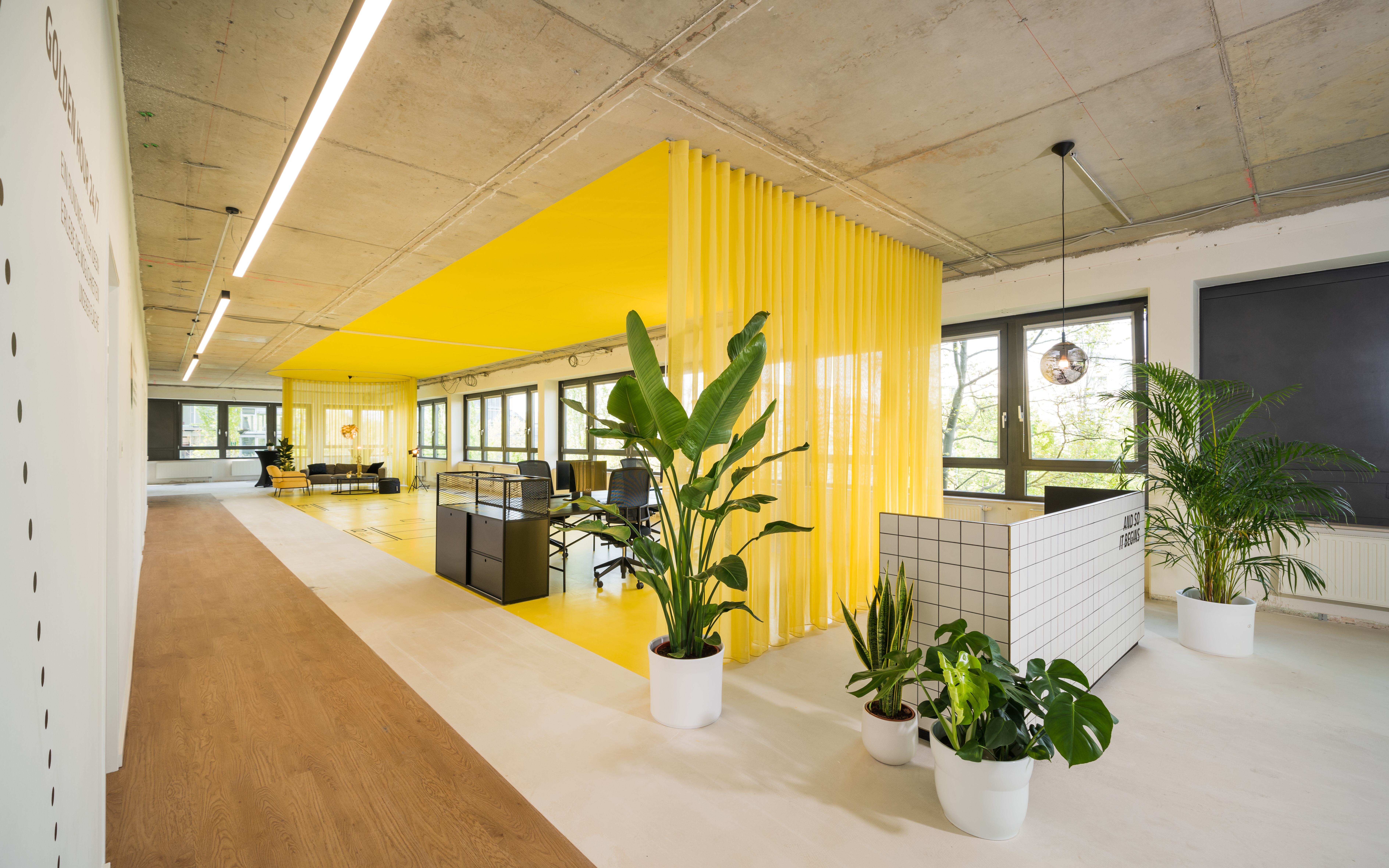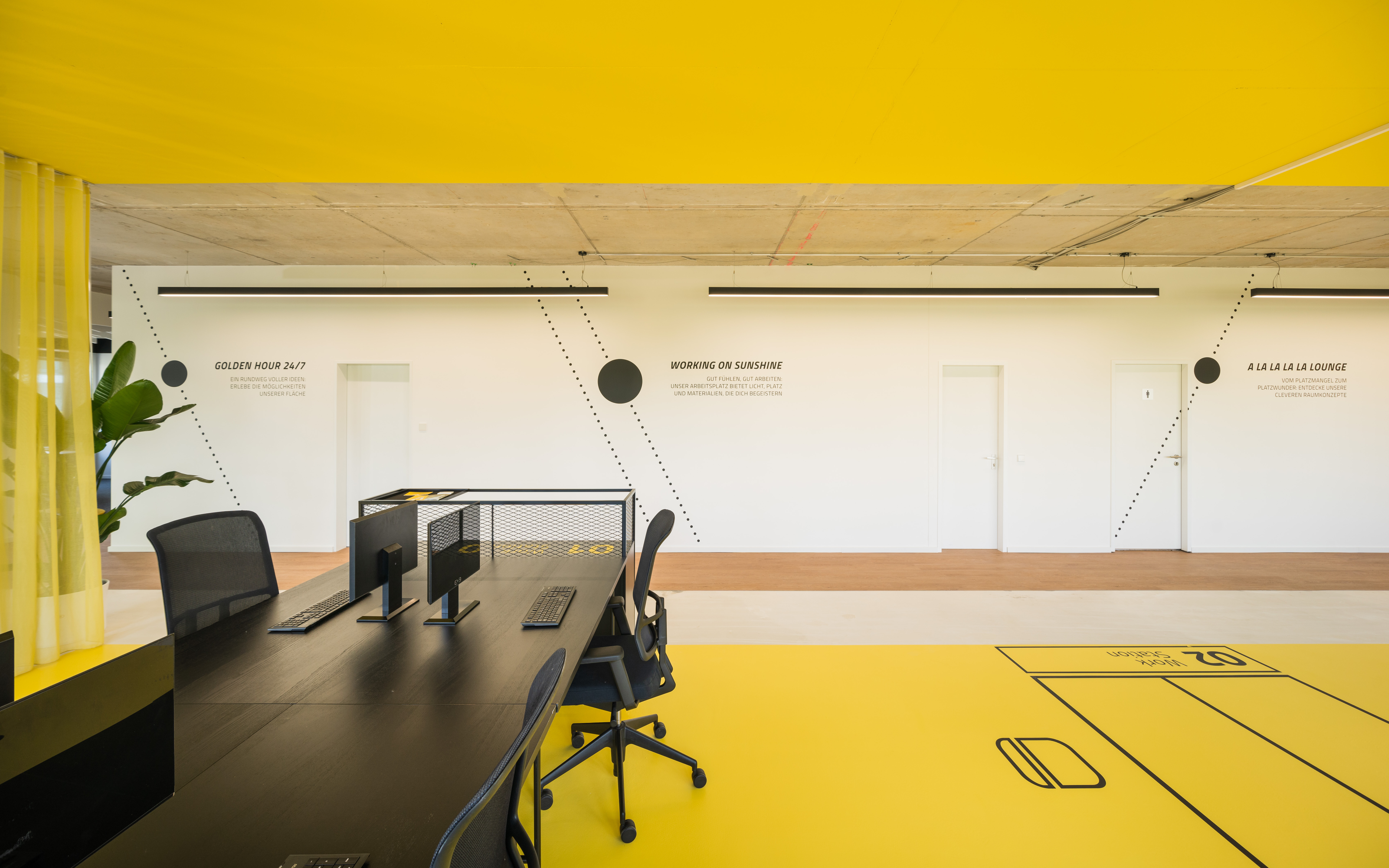 The office-space shows that the open floor plan can be used flexibly and individually and adapted according to needs. The entire building is based on an axis grid that enables a clear structure and orientation. A flexible curtain takes up the grid dimensions of the building and can generate temporary office scenarios by opening and closing it. In this context, the partial transparency of the curtain and its color supports the motto "Working on sunshine".