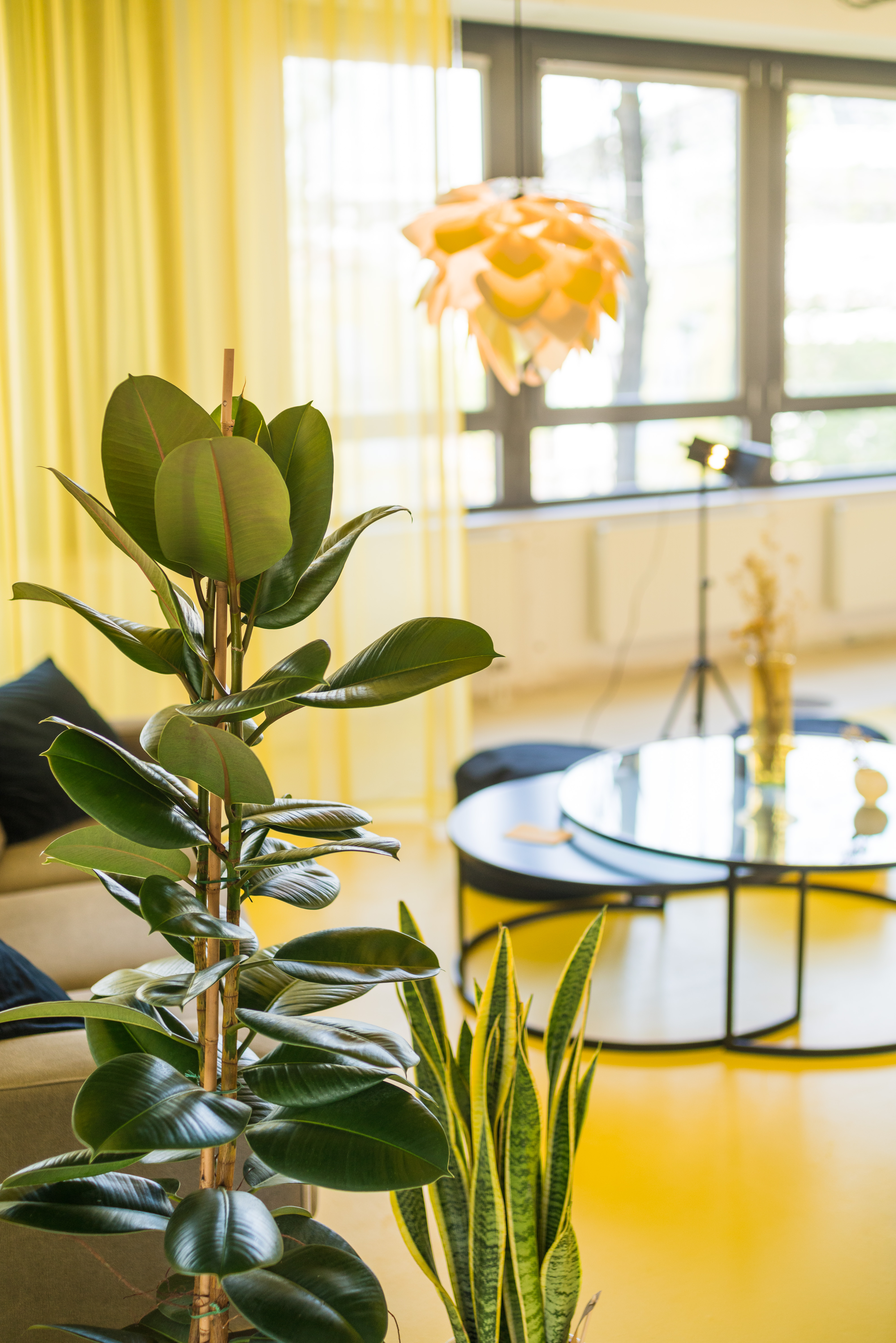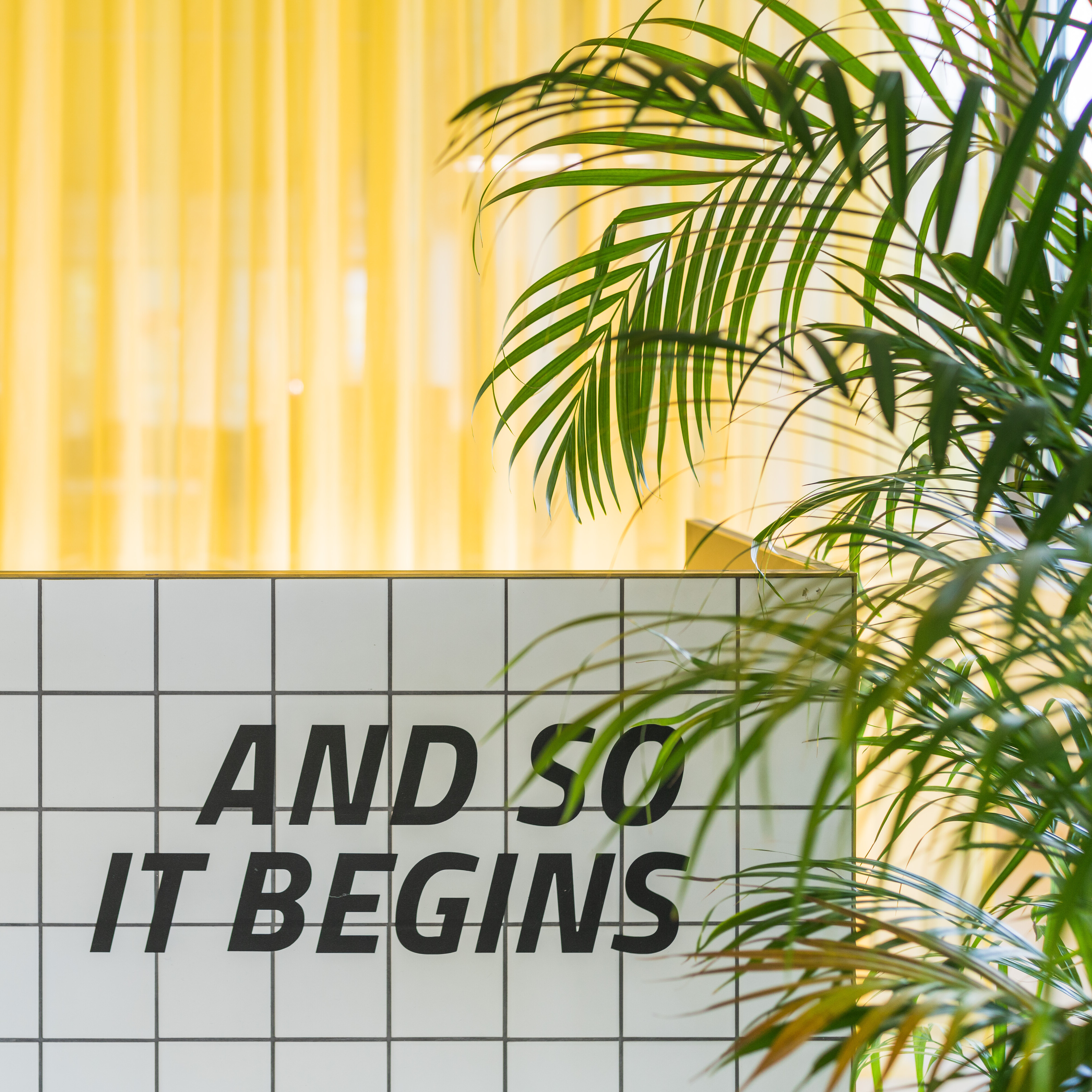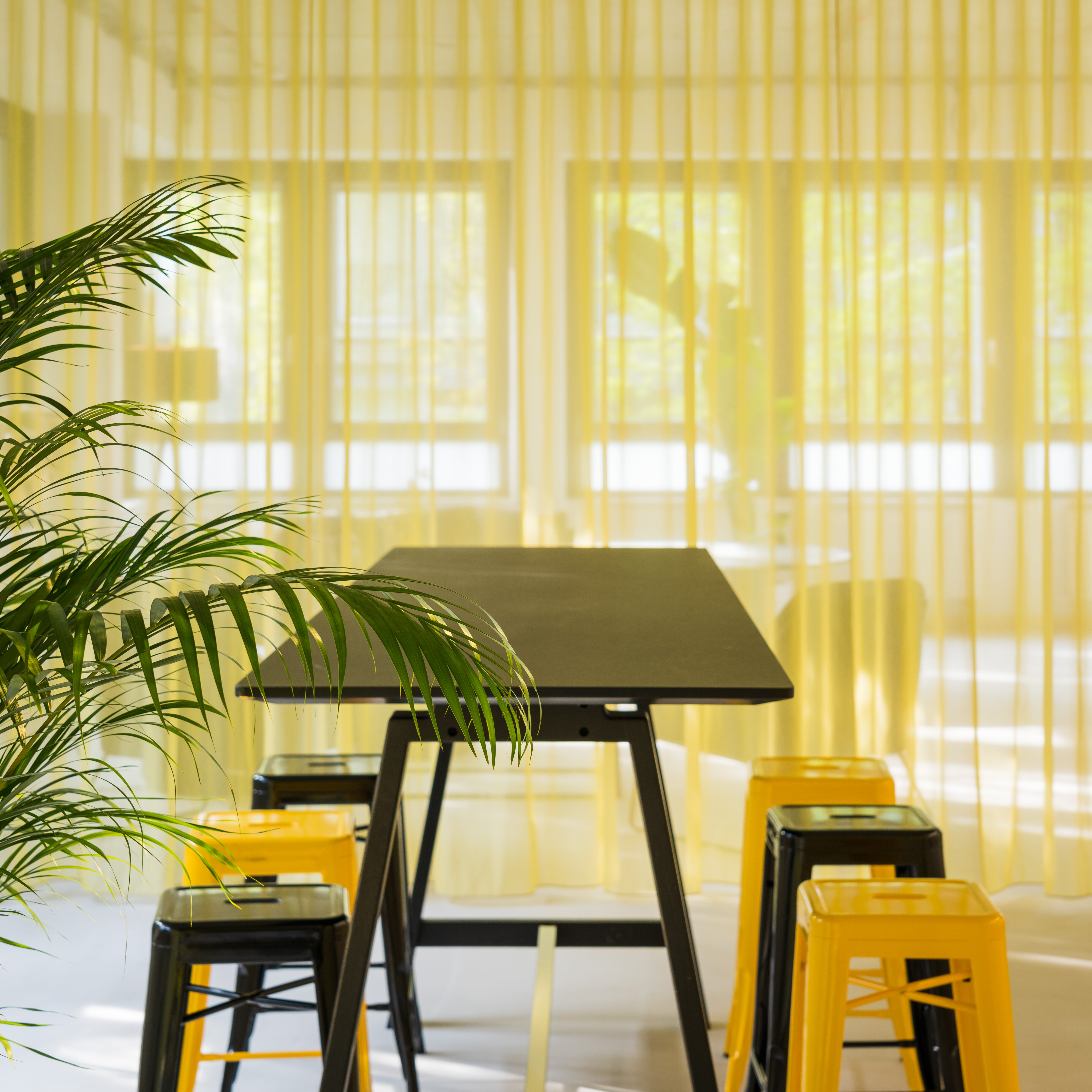 The office-space shows that the open floor plan can be used flexibly and individually and adapted according to needs. The entire building is based on an axis grid that enables a clear structure and orientation. A flexible curtain takes up the grid dimensions of the building and can generate temporary office scenarios by opening and closing it. In this context, the partial transparency of the curtain and its color supports the motto "Working on sunshine".
