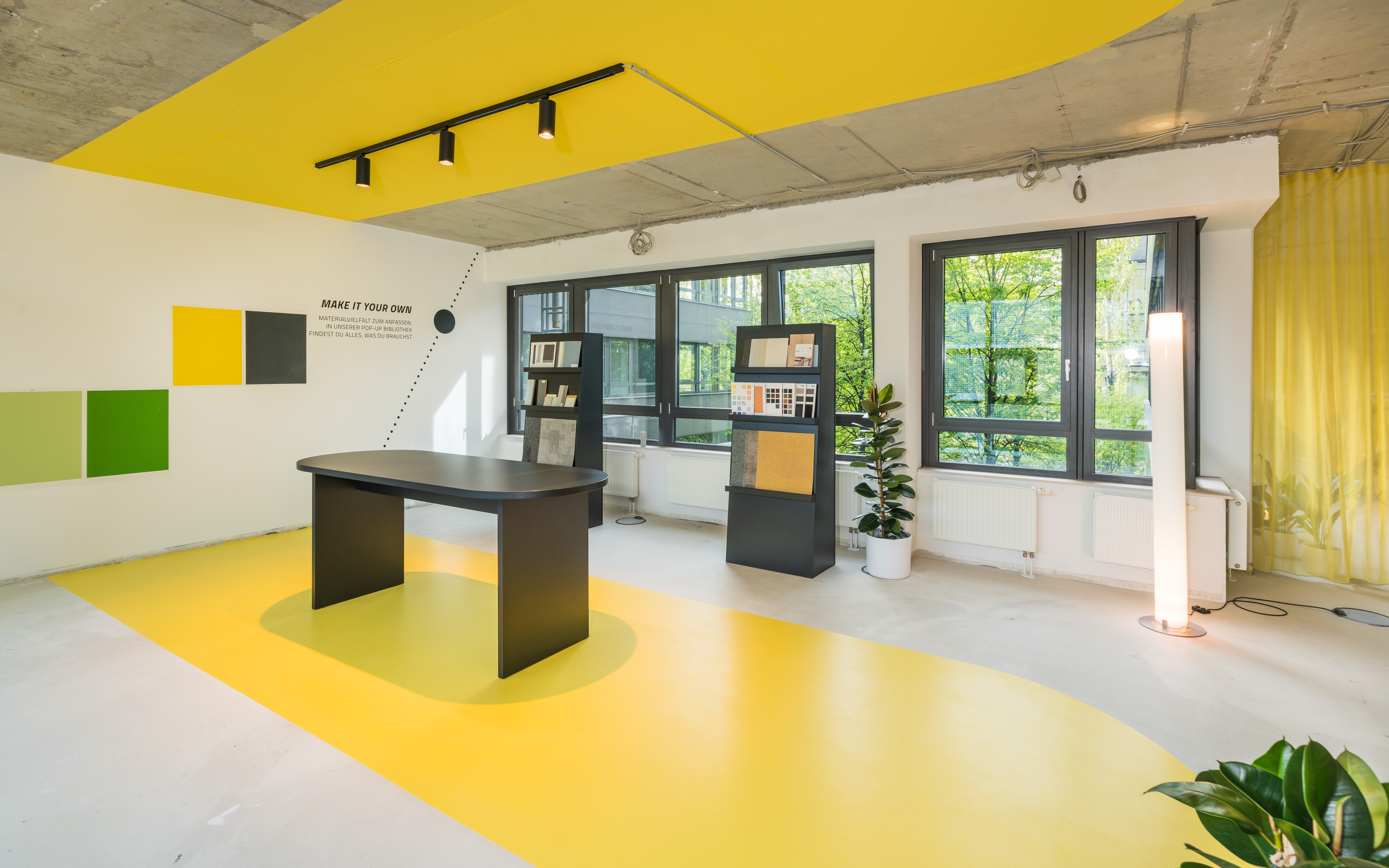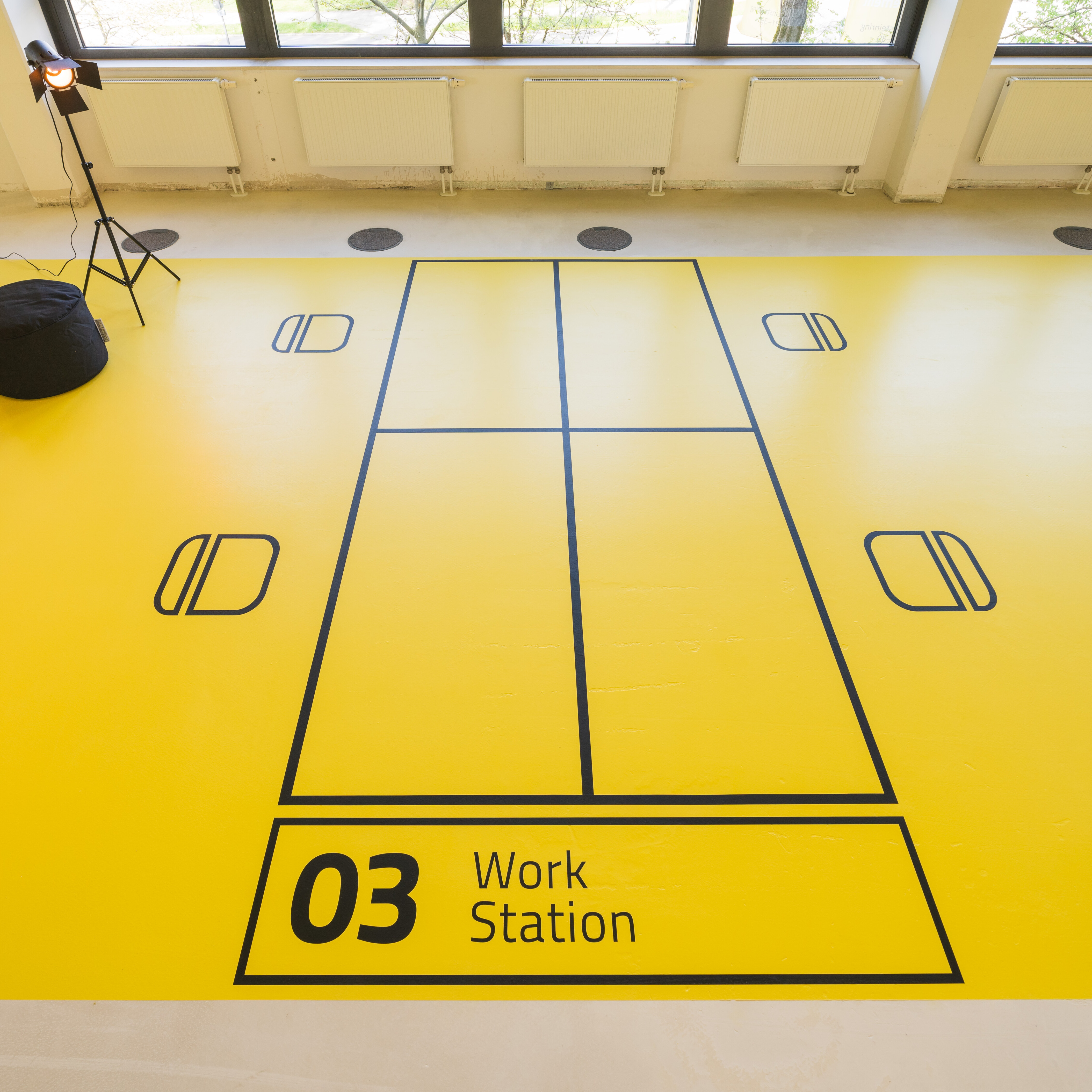 A combination of color surfaces, graphics and real furniture is presented in a suggested open office area, which directly takes up the topic of work. A color contrast in the form of the floor plan creates a zone that gives the visitor an idea of future spatial planning.