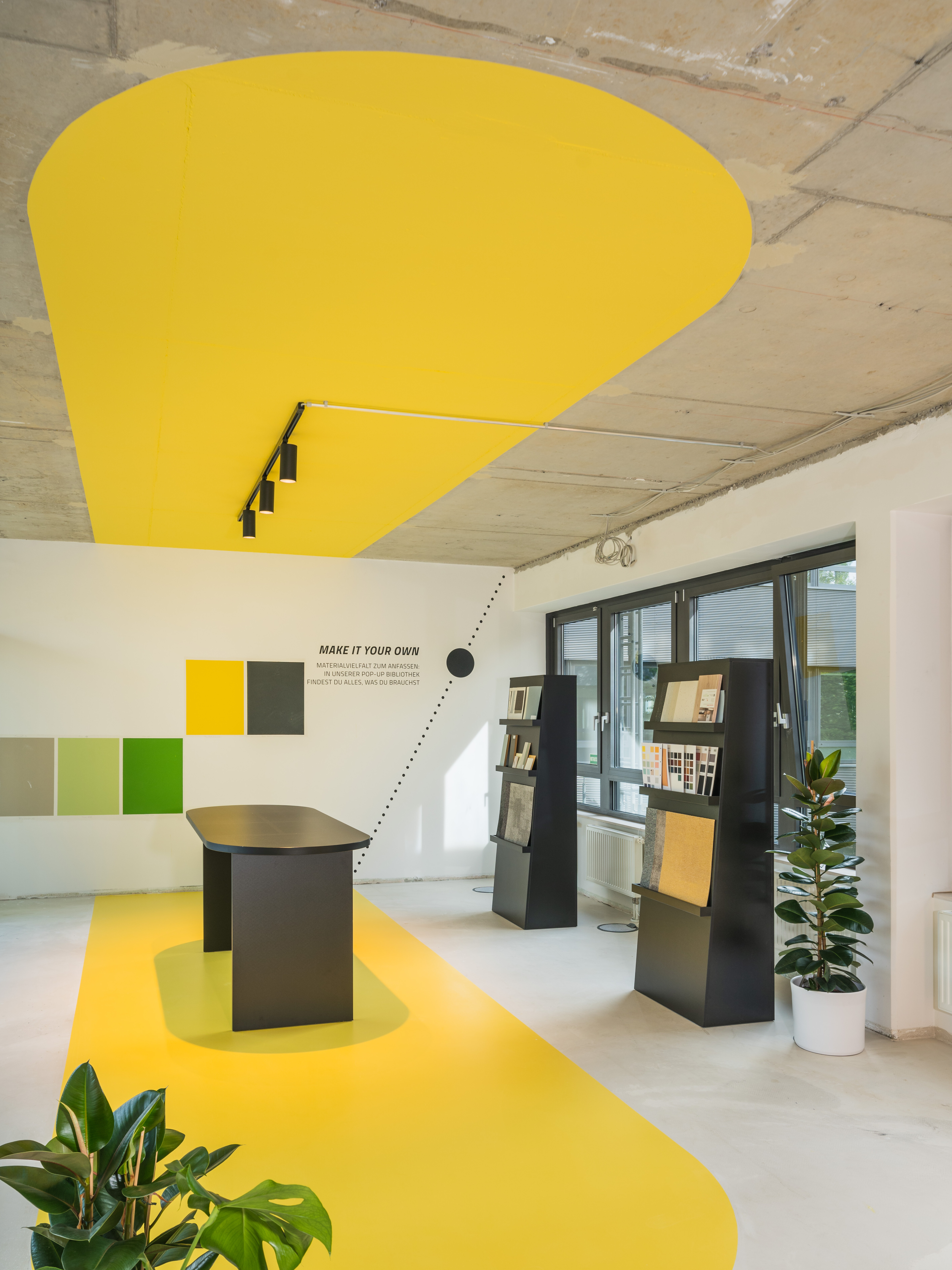 We used the 400m² area loosely and presented, under the motto mentioned above, workplaces that combine light, spaces and high-quality materials. On a circular route, visitors can experience the possibilities of the area and let themselves be guided by the sun.