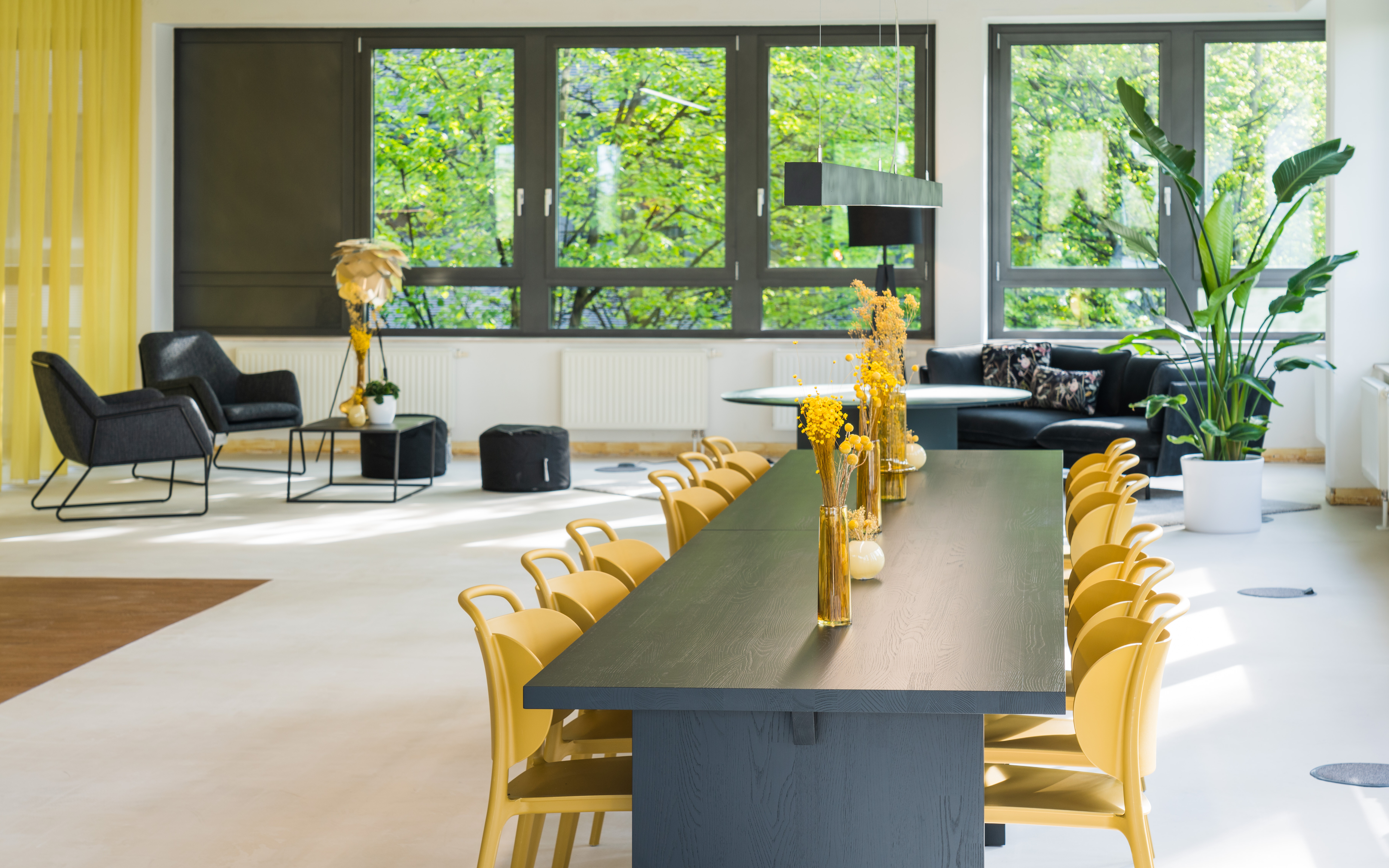 "Working on sunshine" - that's the motto that we implemented for the office show floor of vünf in Aschheim: Five buildings, one ensemble. The office space in vünf offers plenty of scope for development. High ceilings meet wide spaces, which bring with them a wide range of potential for new office environments. Our task was to adapt and stage the existing model office spaces in such a way that it appeals to a broad target group of potential tenants and also makes it possible to experience the full potential.